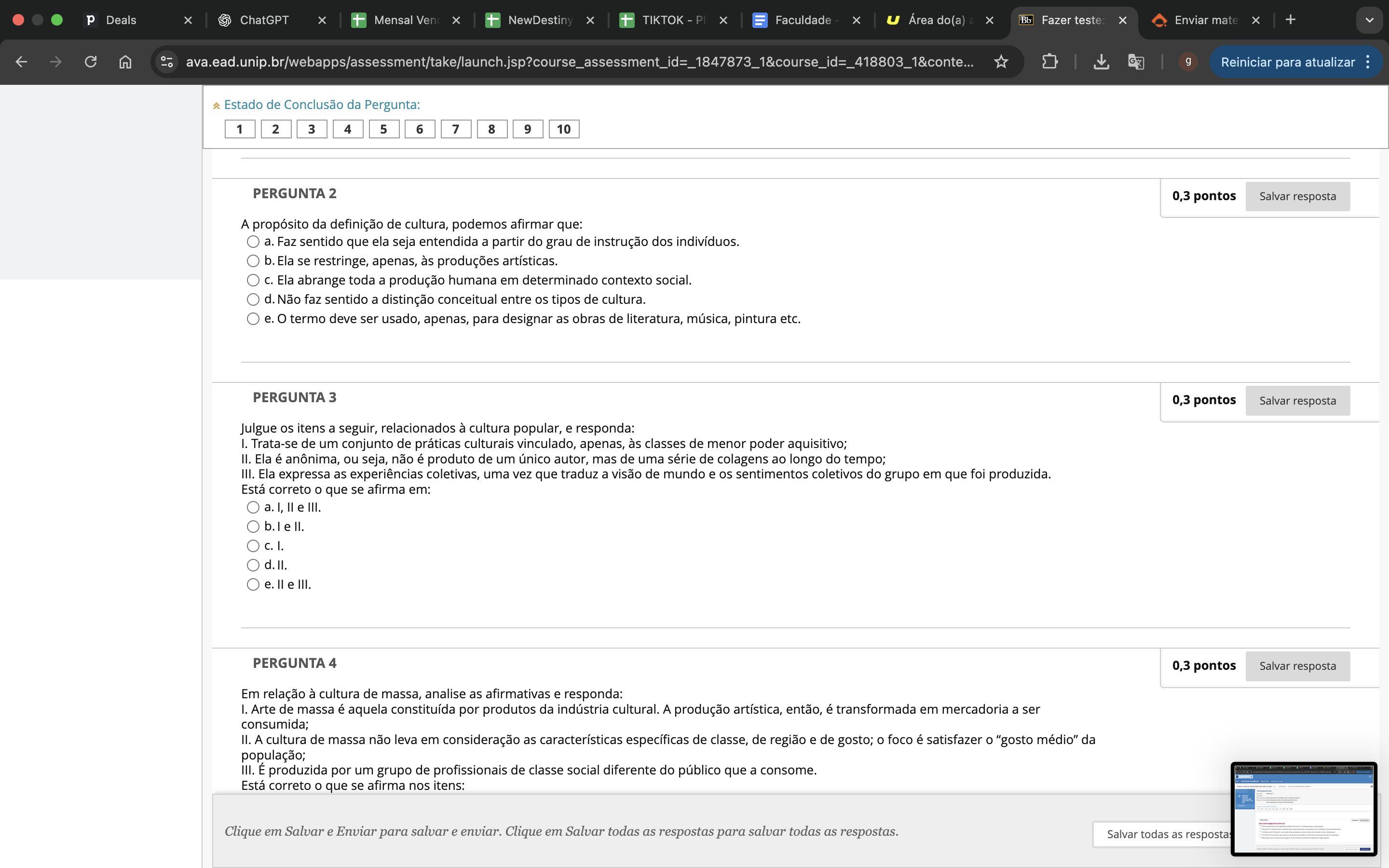 Deals ChatGPT Mensal Ven NewDestiny PI Faculdade Área do(a) Bb Fazer teste: Enviar mate + g Reiniciar para atualizar Estado de Conclusão da Pergunta: 1 2 3 4 5 6 7 8 9 10 PERGUNTA 2 0,3 pontos Salvar resposta A propósito da definição de cultura, podemos afirmar que: a. Faz sentido que ela seja entendida a partir do grau de instrução dos indivíduos. b. Ela se restringe, apenas, às produções artísticas. C. Ela abrange toda a produção humana em determinado contexto social. d. Não faz sentido a distinção conceitual entre os tipos de cultura. e. termo deve ser usado, apenas, para designar as obras de literatura, música, pintura etc. PERGUNTA 3 0,3 pontos Salvar resposta Julgue os itens a seguir, relacionados à cultura popular, e responda: I. Trata-se de um conjunto de práticas culturais vinculado, apenas, às classes de menor poder aquisitivo; II. Ela é anônima, ou seja, não é produto de um único autor, mas de uma série de colagens ao longo do tempo; III. Ela expressa as experiências coletivas, uma vez que traduz a visão de mundo e os sentimentos coletivos do grupo em que foi produzida. Está correto o que se afirma em: e III. b. II. d.ll. e. e III. PERGUNTA 4 0,3 pontos Salvar resposta Em relação à cultura de massa, analise as afirmativas e responda: I. Arte de massa é aquela constituída por produtos da indústria cultural. A produção artística, então, é transformada em mercadoria a ser consumida; II. A cultura de massa não leva em consideração as características específicas de classe, de região e de gosto; foco é satisfazer "gosto médio" da população; III. É produzida por um grupo de profissionais de classe social diferente do público que a consome. Está correto o que se afirma nos itens: Clique em Salvar e Enviar para salvar e enviar. Clique em Salvar todas as respostas para salvar todas as respostas. Salvar todas as resposta: