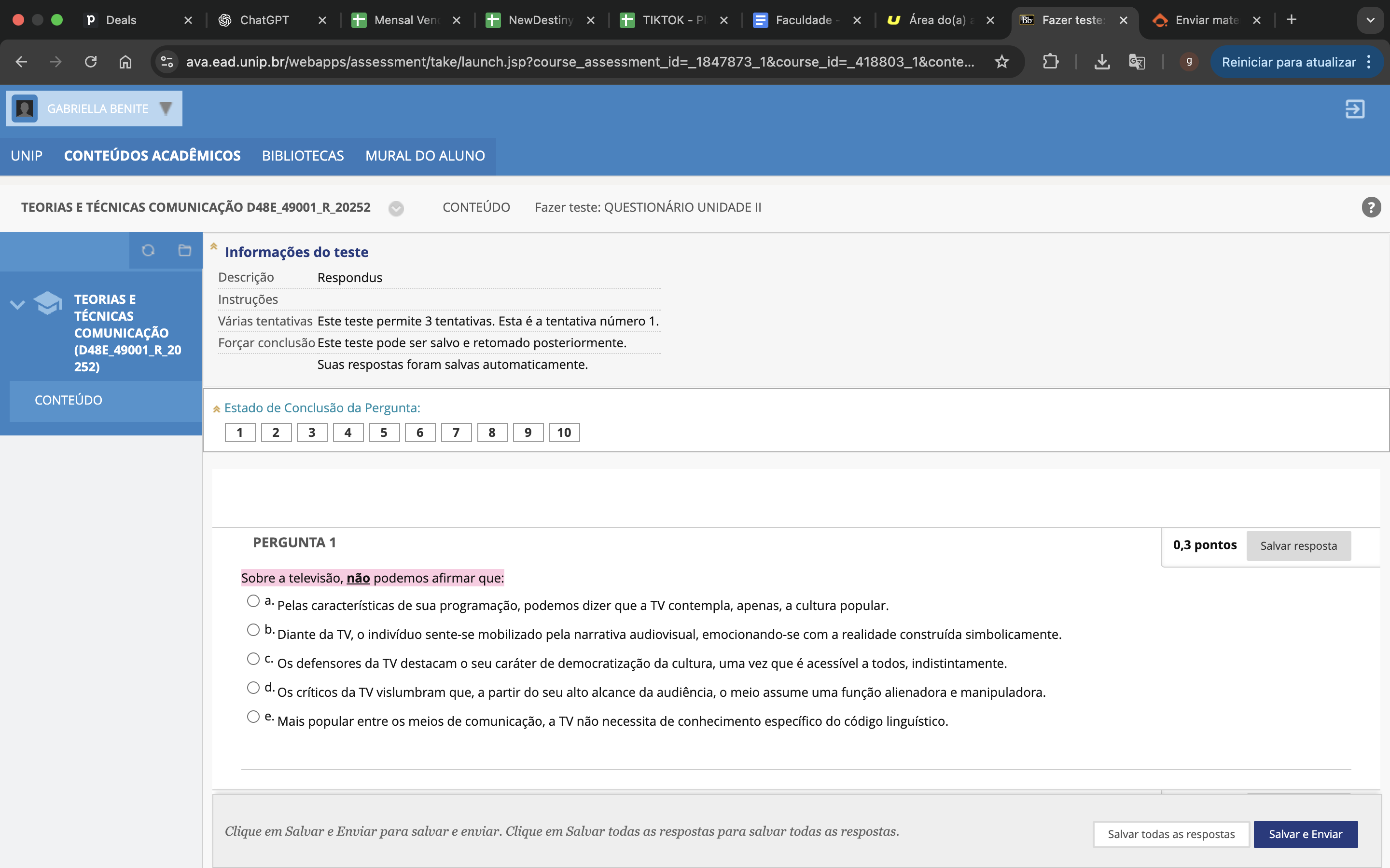 p Deals ChatGPT Mensal Ven NewDestiny TIKTOK PI Faculdade Área do(a) Bb Fazer teste: Enviar mate + g Reiniciar para atualizar GABRIELLA BENITE UNIP CONTEÚDOS ACADÊMICOS BIBLIOTECAS MURAL DO ALUNO TEORIAS E TÉCNICAS COMUNICAÇÃO D48E_49001_R_20252 CONTEÚDO Fazer teste: QUESTIONÁRIO UNIDADE ? Informações do teste Descrição Respondus TEORIAS E Instruções TÉCNICAS Várias tentativas Este teste permite 3 tentativas. Esta é a tentativa número 1. COMUNICAÇÃO (D48E_49001_R_20 Forçar conclusão Este teste pode ser salvo e retomado posteriormente. 252) Suas respostas foram salvas automaticamente. CONTEÚDO Estado de Conclusão da Pergunta: 1 2 3 4 5 6 7 8 9 10 PERGUNTA 1 0,3 pontos Salvar resposta Sobre a televisão, não podemos afirmar que: a. Pelas características de sua programação, podemos dizer que a TV contempla, apenas, a cultura popular. b. Diante da TV, o indivíduo sente-se mobilizado pela narrativa audiovisual, emocionando-se com a realidade construída simbolicamente. Os defensores da TV destacam seu caráter de democratização da cultura, uma vez que é acessível a todos, indistintamente. d. Os críticos da TV vislumbram que, a partir do seu alto alcance da audiência, meio assume uma função alienadora e manipuladora. e. Mais popular entre os meios de comunicação, a TV não necessita de conhecimento específico do código linguístico. Clique em Salvar e Enviar para salvar e enviar. Clique em Salvar todas as respostas para salvar todas as respostas. Salvar todas as respostas Salvar e Enviar