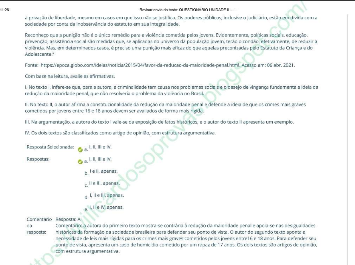 11:26 Revisar envio do teste: QUESTIONÁRIO UNIDADE à privação de liberdade, mesmo em casos em que isso não se justifica. Os poderes públicos, inclusive Judiciário, estão em dívida com a sociedade por conta da inobservância do estatuto em sua integralidade. Reconheço que a punição não é único remédio para a violência cometida pelos jovens. Evidentemente, políticas sociais, educação, prevenção, assistência social são medidas que, se aplicadas no universo da população jovem, terão condão, efetivamente, de reduzir a violência. Mas, em determinados casos, é preciso uma punição mais eficaz do que aquelas preconizadas pelo Estatuto da Criança e do Adolescente." Fonte: em: 06 abr. 2021. Com base na leitura, avalie as afirmativas. I. No texto I, infere-se que, para a autora, a criminalidade tem causa nos problemas sociais e desejo de vingança fundamenta a ideia da redução da maioridade penal, que não resolveria problema da violência no Brasil. II. No texto II, autor afirma a constitucionalidade da redução da maioridade penal e defende a ideia de que crimes mais graves cometidos por jovens entre 16 e 18 anos devem ser avaliados de forma mais III. Na argumentação, a autora do texto vale-se da exposição de fatos históricos, e autor do texto apresenta um exemplo. IV. Os dois textos são classificados como artigo de opinião, com estrutura argumentativa. Resposta Selecionada: I, II, III e IV. a. Respostas: I, II, III e IV. a. b. le II, apenas. C. e III, apenas. d. I, e III, apenas. e IV, apenas. e. Comentário Resposta: A da Comentário: a autora do primeiro texto mostra-se contrária à redução da maioridade penal e apoia-se nas desigualdades resposta: históricas da formação da sociedade brasileira para defender seu ponto de vista. autor do segundo texto aponta a necessidade de leis mais rígidas para os crimes mais graves cometidos pelos jovens entre16 e 18 anos. Para defender seu ponto de vista, apresenta um caso de homicídio cometido por um rapaz de 17 anos. Os dois textos são artigos de opinião, com estrutura argumentativa.Pergunta 2 0 em 0,5 pontos Leia o texto e analise as afirmativas. Extra, extra. Este macaco é humano. Não somos tão especiais "Todas as características tidas como exclusivas dos humanos são compartilhadas por outros animais, ainda que em menor grau. INTELIGÊNCIA A ideia de que somos animais racionais tem sido destruída desde os anos 40. A maioria das aves e tem algum tipo de raciocínio. AMOR amor, tido como mais elevado dos sentimentos, é parecido em várias espécies, como os corvos, que também criam laços duradouros, se preocupam com ente querido e ficam de luto depois de sua morte. CONSCIÊNCIA Chimpanzés se reconhecem no espelho. Orangotangos observam e enganam humanos distraídos. Sinais de que sabem quem são e se distinguem dos outros. Ou seja, são conscientes. CULTURA 11:26 Revisar envio do teste: QUESTIONÁRIO UNIDADE primatologista Frans de Waal juntou vários exemplos de cetáceos e primatas que são capazes de aprender novos hábitos e de transmiti- los para as gerações seguintes. que é cultura senão isso?" Fonte: BURGIERMAN, D. Superinteressante, n° 190, jul. 2003. I A tese do autor é de que não há diferenças entre homem e macaco. - autor vale-se do argumento de autoridade para defender seu ponto de vista. III A fotografia tem papel na sustentação da tese, pois atua como um argumento com base no real. É correto o que se afirma em: Resposta Selecionada: e III. Respostas: a. I, e III. b. e III. III. d. e II. II, apenas. e.Pergunta 3 Considere post e analise as afirmativas. 0,5 em 0,5 11:26 Revisar envio do teste: QUESTIONÁRIO UNIDADE Agora mesmo Trabalho desde os meus 15 anos e nunca fiquei desempregada essa historia de que não existe empregos é desculpa de quem não quer trabalhar. Curtir Comentar Fonte: acervo pessoal post ratifica a validade do raciocínio dedutivo para se chegar a conclusões gerais. - post comprova a importância e a validade do argumento por exemplo ou por ilustração. III Há problemas gramaticais no post: falta de pontuação e de acento e erro de concordância verbal. Assinale a alternativa correta. Resposta Selecionada: b. Somente a afirmativa III é correta. Respostas: Nenhuma afirmativa é correta. a. b. d. le são corretas. Somente a afirmativa III é correta. e III são corretas. e. e III são corretas. Comentário Resposta: da resposta: Comentário: a pessoa tenta fazer uma generalização (base do raciocínio indutivo) para transformar em caso em verdade universal. Trata-se de um defeito de argumentação, pois um exemplo não pode ser tomado como uma prova universal. Falta pontuação no texto, "história" está sem acento e correto seria "existem".Pergunta 4 0 em 0,5 ponto 11:26 Revisar envio do teste: QUESTIONÁRIO UNIDADE João, gerente de uma agência bancária, escreveu seguinte e-mail a um cliente. Prezado Sr. Marco Antônio, Foi observado uma movimentação incomum na sua conta corrente na última semana, onde houveram saques de alto valor. Solicitamos que verifique seu extrato a fim de identificar possíveis FRAUDES. Há dois erros de concordância no e-mail. - 0 uso de letras maiúsculas, como em FRAUDES, enunciador está falando mais alto. sugere que III No e-mail, faltam a despedida e a assinatura. É correto que se afirma em: Resposta Selecionada: e. III, apenas. Respostas: a. I, e III. b. e II. C. e III. d. le III. e. III, apenas.Pergunta 5 0,5 em 0,5 pontos Leia 0 texto, de autoria de Luiz Ruffato. Nossa democracia em xeque cenário de intolerância e incapacidade de diálogo que constatamos hoje na sociedade brasileira é um sério sinal de debilidade do nosso sistema político "Se pensarmos que estamos há 34 anos do fim da ditadura militar e há 29 anos da primeira eleição direta para a Presidência da República, é preocupante observarmos que a nossa democracia já aparenta cansaço e desmotivação. exercício da democracia pressu