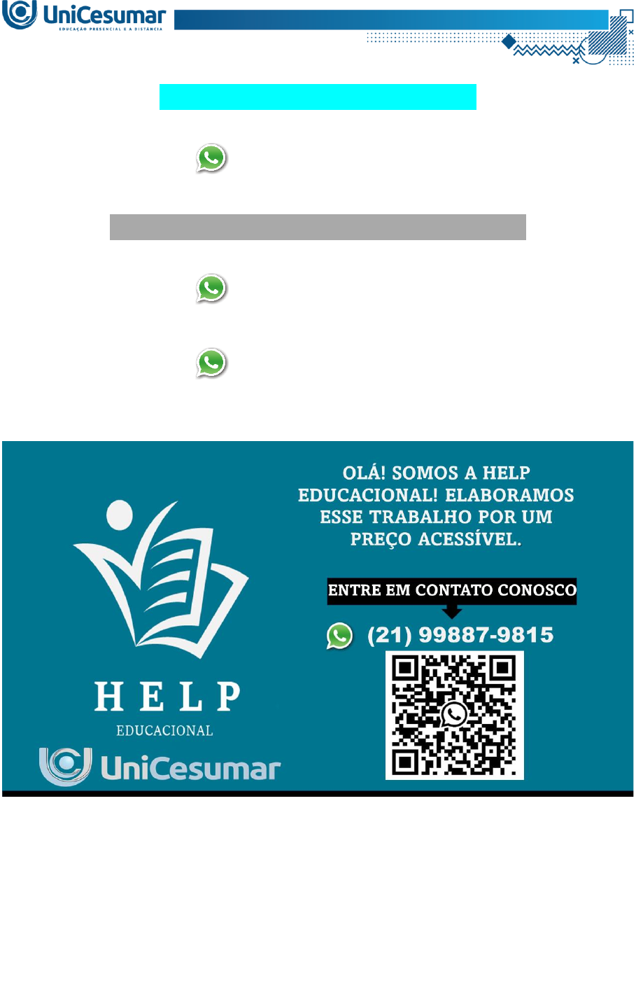 MAPA – FILOSOFIA - 54_2025 (21) 99887-9815 ASSESSORIA NOS SEUS TRABALHOS (21) 99887-9815 (21) 99887-9815 “O simples ato de pensar é, em si, um ato filosófico. Quando alguém decide votar em um candidato por ser de um determinado partido ou quando alterna a jornada de trabalho com a prática de esporte ou com a opção de ficar em casa assistindo à TV, está, de certa forma, filosofando” (Aaranha; Martins, 2013, apud Mariano, 2020, p. 22). Referência: MARIANO, R. A. Filosofia. Maringá: Unicesumar, 2020. Reimpresso em 2024, p. 22. Contextualização: O presente estudo busca relacionar conceitos filosóficos com experiências reais do cotidiano. O livro mostra que a filosofia não é apenas teórica, mas se revela em nos- sas escolhas, valores e interpretações da realidade. Dessa forma, ao refletir sobre situações simples do dia a dia, o estudante desenvolve habilidades críticas, amplia sua compreensão da cultura e da sociedade e fortalece sua capacidade de análise - competências fundamentais para a formação em Jornalismo e Publicidade e Propa- ganda. ATIVIDADE: Elabore um MAPA MENTAL em que você represente situações do cotidiano que podem ser compreendidas como práticas filosóficas. O mapa deve conter: 1) Um conceito central de filosofia no cotidiano. 2) Pelo menos cinco ramificações representando exemplos de escolhas ou experi- ências diárias (éticas, políticas, profissionais, comunicacionais etc.). 3) Conexões que mostrem como essas situações revelam reflexões filosóficas. 4) Indicação de conceitos estudados no livro que fundamentem suas escolhas. ORIENTAÇÃO: O mapa pode ser feito à mão (fotografado em boa qualidade) ou em ferramenta digi- tal (ex.: Canva). ATENÇÃO, ESTUDANTE: - Assista ao vídeo de orientações para realização da atividade MAPA, disponível na Sala do café. - Realize a sua atividade MAPA no Formulário Padrão que está disponível para download em Material da Disciplina. - Certifique-se sempre de que está encaminhando o arquivo correto no seu Studeo antes de finalizar, pois não haverá como editar e/ou enviar outro arquivo após a fina- lização - Não esqueça de utilizar as citações e referências de modo correto. Em Material da disciplina há um arquivo com normas para realização de citações e referências. - Qualquer dúvida, entre em contato com a mediação. Bons estudos e boa sorte! OLÁ! SOMOS A HELP EDUCACIONAL! ELABORAMOS ESSE TRABALHO POR UM PREÇO ACESSÍVEL. ENTRE EM CONTATO CONOSCO (21) 99887-9815