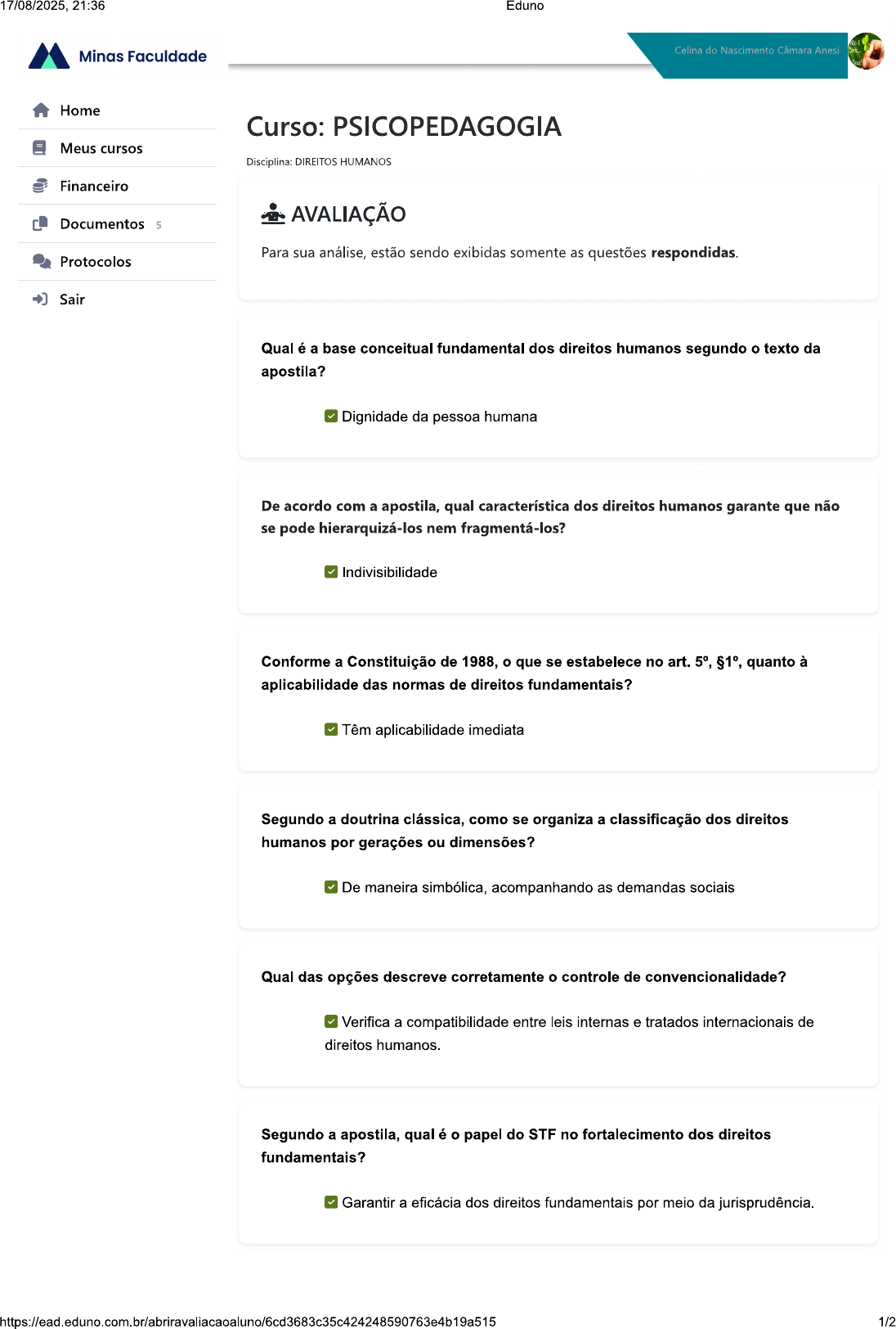 17/08/2025, 21:36 Eduno Minas Faculdade Celina do Nascimento Câmara Anesi Home Curso: PSICOPEDAGOGIA Meus cursos Disciplina: DIREITOS HUMANOS Financeiro Documentos 5 AVALIAÇÃO Para sua análise, estão sendo exibidas somente as questões respondidas. Protocolos Sair Qual é a base conceitual fundamental dos direitos humanos segundo texto da apostila? Dignidade da pessoa humana De acordo com a apostila, qual característica dos direitos humanos garante que não se pode hierarquizá-los nem fragmentá-los? Indivisibilidade Conforme a Constituição de 1988, que se estabelece no art. 5°, quanto à aplicabilidade das normas de direitos fundamentais? Têm aplicabilidade imediata Segundo a doutrina clássica, como se organiza a classificação dos direitos humanos por gerações ou dimensões? De maneira simbólica, acompanhando as demandas sociais Qual das opções descreve corretamente controle de convencionalidade? Verifica a compatibilidade entre leis internas e tratados internacionais de direitos humanos. Segundo a apostila, qual é o papel do STF no fortalecimento dos direitos fundamentais? Garantir a eficácia dos direitos fundamentais por meio da jurisprudência. https://ead.eduno.com.br/abriravaliacaoaluno/6cd3683c35c424248590763e4b19a515 1/217/08/2025, 21:36 Eduno Minas Faculdade Celina do Nascimento Câmara Anesi direitos humanos? Home Inclusão da dignidade da pessoa humana como fundamento da República Meus cursos Financeiro De acordo com a apostila, qual afirmação é verdadeira sobre os direitos humanos e Documentos 5 os acusados de crimes? Protocolos A proteção aos acusados visa evitar abusos e violações estatais. Conforme texto, positivismo jurídico foi amplamente criticado após qual evento histórico? Segunda Guerra Mundial e o nazismo Segundo a apostila, que caracteriza os direitos humanos como irrenunciáveis e Não podem ser transferidos nem perdem validade com o tempo. VOLTAR https://ead.eduno.com.br/abriravaliacaoaluno/6cd3683c35c424248590763e4b19a515 2/2