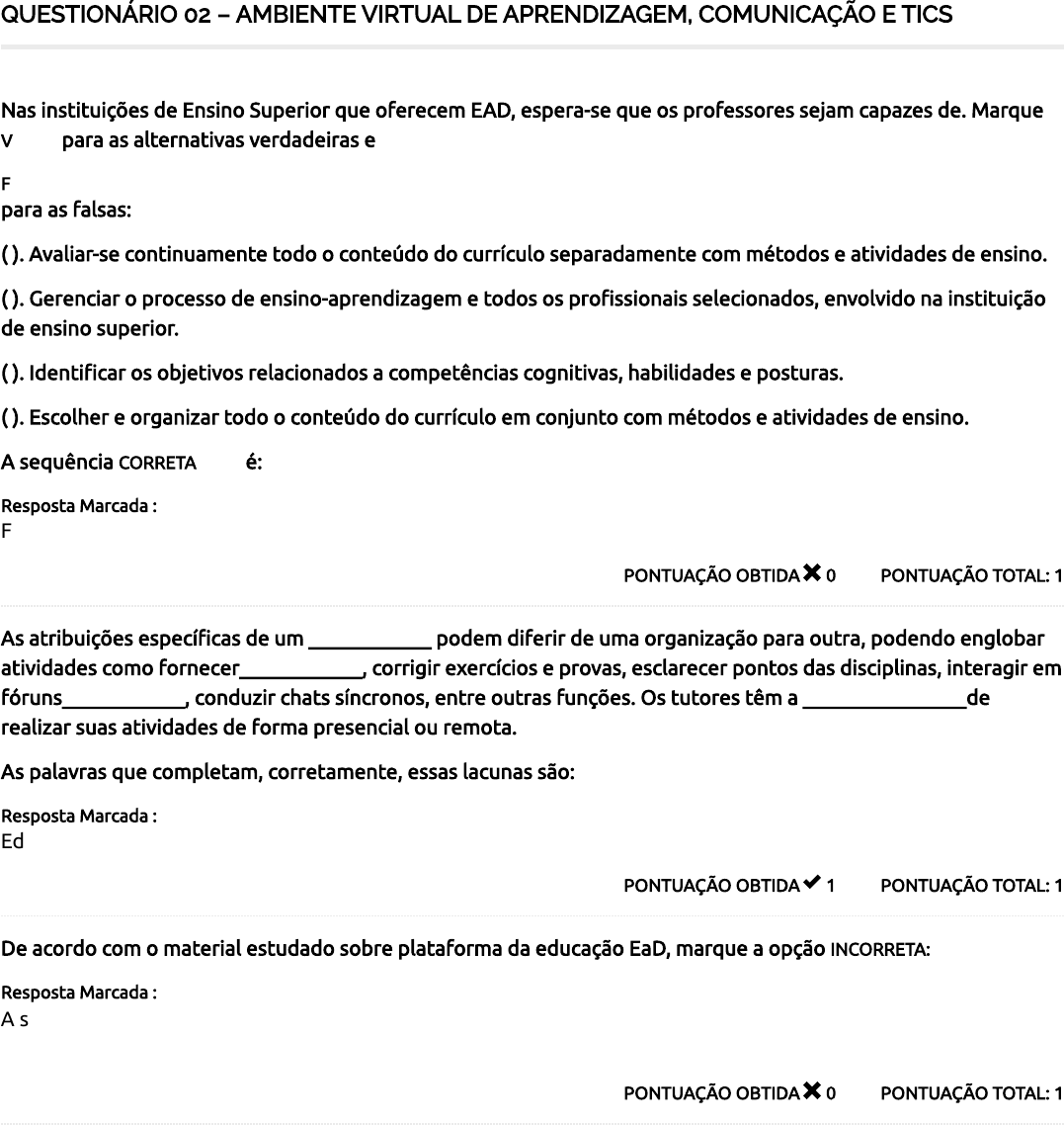 14/10/2025 16:51 Course Status – AVA Saúde Unifaveni https://ava.saude.unifaveni.com.br/course-status/ 1/2 QUESTIONÁRIO 02 – AMBIENTE VIRTUAL DE APRENDIZAGEM, COMUNICAÇÃO E TICS PONTUAÇÃO TOTAL: 1PONTUAÇÃO OBTIDA 0 Nas instituições de Ensino Superior que oferecem EAD, espera-se que os professores sejam capazes de. Marque V para as alternativas verdadeiras e F para as falsas: ( ). Avaliar-se continuamente todo o conteúdo do currículo separadamente com métodos e atividades de ensino. ( ). Gerenciar o processo de ensino-aprendizagem e todos os pro�ssionais selecionados, envolvido na instituição de ensino superior. ( ). Identi�car os objetivos relacionados a competências cognitivas, habilidades e posturas. ( ). Escolher e organizar todo o conteúdo do currículo em conjunto com métodos e atividades de ensino. A sequência CORRETA é: Resposta Marcada : F, V, V, F. PONTUAÇÃO TOTAL: 1PONTUAÇÃO OBTIDA 1 As atribuições especí�cas de um ____________ podem diferir de uma organização para outra, podendo englobar atividades como fornecer____________, corrigir exercícios e provas, esclarecer pontos das disciplinas, interagir em fóruns____________, conduzir chats síncronos, entre outras funções. Os tutores têm a ________________de realizar suas atividades de forma presencial ou remota. As palavras que completam, corretamente, essas lacunas são: Resposta Marcada : Educador – feedback – assíncronos – possibilidade. PONTUAÇÃO TOTAL: 1PONTUAÇÃO OBTIDA 0 De acordo com o material estudado sobre plataforma da educação EaD, marque a opção INCORRETA: Resposta Marcada : A seleção de uma plataforma de EAD está condicionada aos objetivos do projeto a ser desenvolvido, independentemente de como se conceitua essa escolha. 14/10/2025 16:51 Course Status – AVA Saúde Unifaveni https://ava.saude.unifaveni.com.br/course-status/ 2/2 2 / 5 PONTUAÇÃO TOTAL: 1PONTUAÇÃO OBTIDA 0 Sobre o material estudado em diferentes plataformas de educação a distância, analise as assertivas: I –. A Blackboard, fundada em 1987 nos Estados Unidos, é uma plataforma proprietária, o que signi�ca que qualquer alteração a ser realizada deve ser feita pela equipe da empresa II –. A Schoology, fundamentada em 2009 nos Estados Unidos, é uma plataforma gratuita que oferece ferramentas de comunicação, atividades online e um espaço para o compartilhamento de ideias e publicação de materiais didáticos. III –.A Edmodo, estabelecida em 2008 na Austrália,opera como uma rede social voltada para a educação, conectando professores e alunos e promovendo a comunicação e interação entre pais, estudantes e educadores. IV. Já o NEO é um sistema de gestão de aprendizagem (LMS) direcionado a professores, escolas e universidades, com foco na educação online. Assinale a alternativa que reúne as assertivas CORRETAS: Resposta Marcada : Apenas I, II, III. PONTUAÇÃO TOTAL: 1PONTUAÇÃO OBTIDA 1 De acordo com o material estudado em Equipes EAD, marque a opção CORRETA: Resposta Marcada : De maneira geral, a complexidade da Educação a Distância (EAD) requer a atuação de uma equipe multidisciplinar, formada por indivíduos com habilidades complementares. Total de Pontos