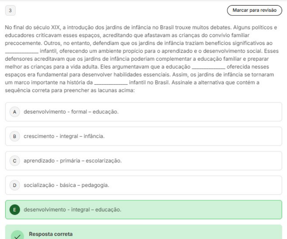 3 Marcar para revisão No final do século XIX, a introdução dos jardins de infância no Brasil trouxe muitos debates. Alguns políticos e educadores criticavam esses espaços, acreditando que afastavam as crianças do familiar precocemente. Outros, no entanto, defendiam que os jardins de infância traziam benefícios significativos ao infantil, oferecendo um ambiente propício para o aprendizado e desenvolvimento social. Esses defensores acreditavam que os jardins de infância poderiam complementar a educação familiar e preparar melhor as crianças para a vida adulta. Eles argumentavam que a educação oferecida nesses espaços era fundamental para desenvolver habilidades essenciais. Assim, os jardins de infância se tornaram um marco importante na história da infantil no Brasil. Assinale a alternativa que contém a sequência correta para preencher as lacunas acima: A desenvolvimento formal - educação. B crescimento integral - infância. aprendizado primária - escolarização. D socialização básica - pedagogia. E desenvolvimento - integral - educação. Resposta correta