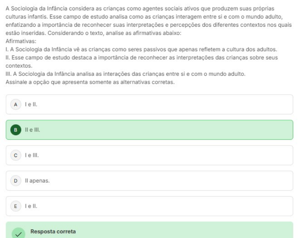 A Sociologia da Infância considera as crianças como agentes sociais ativos que produzem suas próprias culturas infantis. Esse campo de estudo analisa como as crianças interagem entre si e com mundo adulto, enfatizando a importância de reconhecer suas interpretações e percepções dos diferentes contextos nos quais estão inseridas. Considerando texto, analise as afirmativas abaixo: Afirmativas: I. A Sociologia da Infância vê as crianças como seres passivos que apenas refletem a cultura dos adultos. II. Esse campo de estudo destaca a importância de reconhecer as interpretações das crianças sobre seus contextos. III. A Sociologia da Infância analisa as interações das crianças entre si e com mundo adulto. Assinale a opção que apresenta somente as alternativas corretas. A e II. e III. C I e III. D apenas. E I e II. Resposta correta