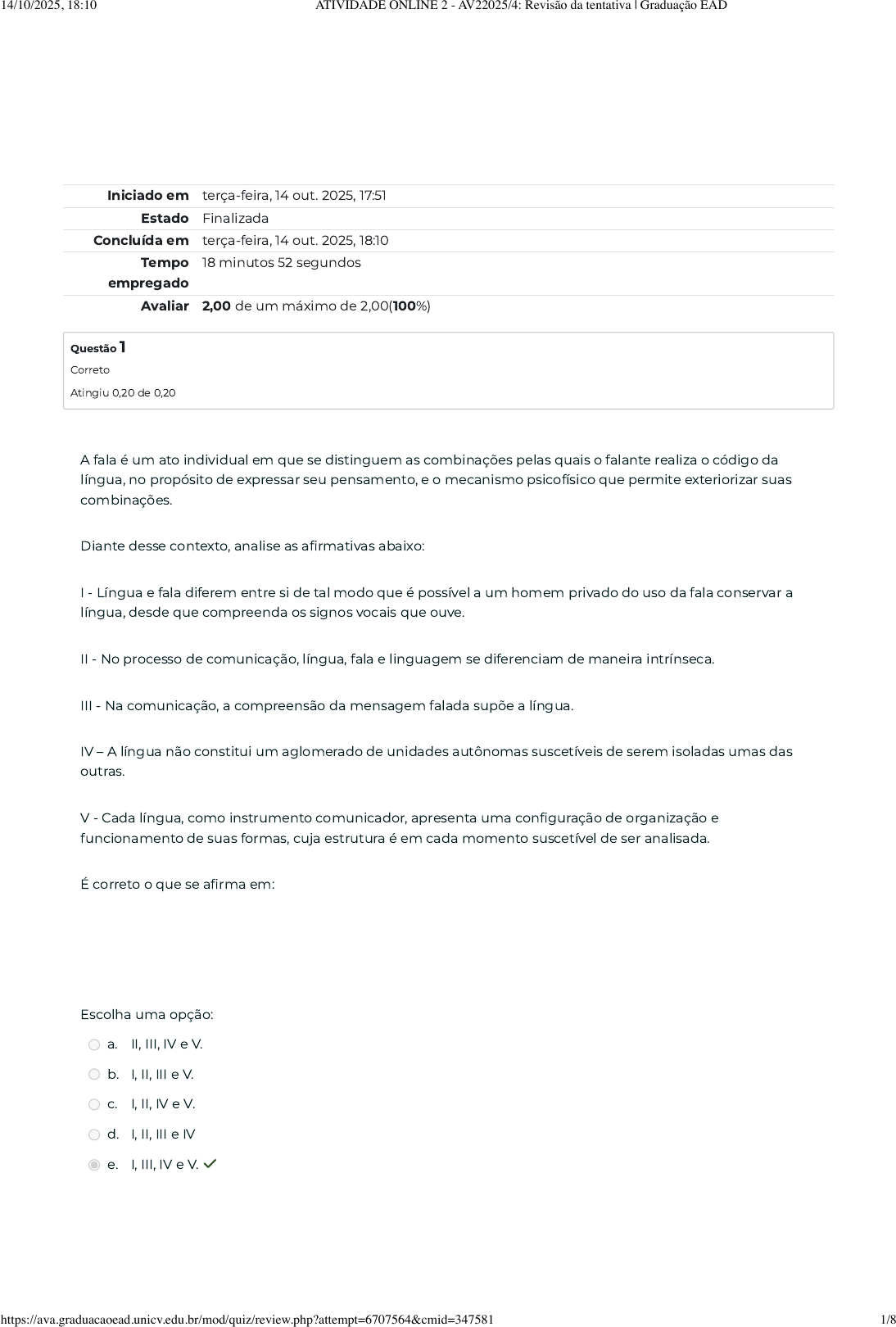 Iniciado em terça-feira, 14 out. 2025, 17:51 Estado Finalizada Concluída em terça-feira, 14 out. 2025, 18:10 Tempo empregado 18 minutos 52 segundos Avaliar 2,00 de um máximo de 2,00(100%) Questão 1 Correto Atingiu 0,20 de 0,20 A fala é um ato individual em que se distinguem as combinações pelas quais o falante realiza o código da língua, no propósito de expressar seu pensamento, e o mecanismo psicofísico que permite exteriorizar suas combinações. Diante desse contexto, analise as afirmativas abaixo: I - Língua e fala diferem entre si de tal modo que é possível a um homem privado do uso da fala conservar a língua, desde que compreenda os signos vocais que ouve. II - No processo de comunicação, língua, fala e linguagem se diferenciam de maneira intrínseca. III - Na comunicação, a compreensão da mensagem falada supõe a língua. IV – A língua não constitui um aglomerado de unidades autônomas suscetíveis de serem isoladas umas das outras. V - Cada língua, como instrumento comunicador, apresenta uma configuração de organização e funcionamento de suas formas, cuja estrutura é em cada momento suscetível de ser analisada. É correto o que se afirma em: Escolha uma opção: a. II, III, IV e V. b. I, II, III e V. c. I, II, IV e V. d. I, II, III e IV e. I, III, IV e V. ✓ 14/10/2025, 18:10 ATIVIDADE ONLINE 2 - AV22025/4: Revisão da tentativa | Graduação EAD https://ava.graduacaoead.unicv.edu.br/mod/quiz/review.php?attempt=6707564&cmid=347581 1/8 Questão 2 Correto Atingiu 0,20 de 0,20 A escrita é um processo que envolve a conversão de pensamento em símbolos gráficos e sequências. A escrita representa não somente a última e mais complexa habilidade adquirida durante o processo de desenvolvimento, mas também é a mais vulnerável a danos, perdas e influências genéticas adversas. (MONTIEL; CAPOVILLA, 2009). Baseado nos estudos realizados nesta disciplina sobre esse assunto, analise as afirmativas abaixo: I - Na história da escrita ao longo do processo histórico-cultural do homem, é possível observar que ele criou códigos para expressar os significados que ações, objetos, entre outras coisas, representavam para si em cada uma das épocas pela qual passou na história humana. II - O processo evolutivo da escrita passa por três fases distintas: a primeira fase é a pré-caligráfica, na qual o traçado é tremido, torto ou arqueado e as margens são desordenadas. III - a segunda fase é a caligráfica, na qual há o aumento de rapidez e regularização da escrita - é feito o esboço de uma definição de estilo. IV – A terceira e última fase é a pós-caligráfica, em que ocorre a automação da escrita. V - As dificuldades de escrita nunca existiram, contudo, somente após os estudos científicos sobre os transtornos de aprendizagem é que estas ganharam destaques. É correto o que se afirma em: Escolha uma opção: a. I, III, IV e V. b. I, II, III e IV. ✓ c. II, III, IV e V. d. I, II, III e V. e. I, II, IV e V. 14/10/2025, 18:10 ATIVIDADE ONLINE 2 - AV22025/4: Revisão da tentativa | Graduação EAD https://ava.graduacaoead.unicv.edu.br/mod/quiz/review.php?attempt=6707564&cmid=347581 2/8 Questão 3 Correto Atingiu 0,20 de 0,20 Questão 4 Correto Atingiu 0,20 de 0,20 As Dislexias Periféricas são causadas por um comprometimento no sistema de análise visual-perceptiva, enquanto que as centrais são causadas por comprometimento do processamento linguístico dos estímulos. Nas Dislexias Periféricas, existem três subdivisões, sendo elas: dislexia atencional, dislexia por negligência e dislexia literal ou pura. Sobre a dislexia por negligência, assinale a alternativa correta. Escolha uma opção: a. Esse tipo de dislexia foi encontrada em pacientes com lesões no lobo parietal esquerdo. b. O indivíduo consegue ler letras individuais, mas apresenta dificuldade em ler palavras. c. É atribuída à lesão na região da artéria cerebral média do hemisfério direito (lobos frontal, parietal e temporal) e caracteriza-se por ausência ou dificuldade de leitura no campo visual contralateral à lesão cerebral. ✓ d. Esta dislexia está relacionada a lesões occipitais extensas à esquerda. e. O indivíduo lê palavras isoladas, mas encontra dificuldade ou barreiras para ler várias palavras simultaneamente. “Envolve o uso de partes de palavras conhecidas para ler vocábulos desconhecidos, quando apresentam o mesmo padrão ortográfico”. Baseado nos estudos realizados a definição acima se refere a qual termo? Marque a alternativa correta. Escolha uma opção: a. Analogia ✓ b. Decodificação c. Reconhecimento automático. d. Descoberta do princípio alfabético e. Predição. 14/10/2025, 18:10 ATIVIDADE ONLINE 2 - AV22025/4: Revisão da tentativa | Graduação EAD https://ava.graduacaoead.unicv.edu.br/mod/quiz/review.php?attempt=6707564&cmid=347581 3/8 Questão 5 Correto Atingiu 0,20 de 0,20 No livro intitulado Psicogênese da língua escrita, Emília Ferreiro e Ana Teberosky, em seus aspectos linguísticos, significativos à alfabetização, as autoras definem o processo de construção da escrita em cinco níveis, sendo eles: nível I - pré-silábico; nível II - intermediário I, nível III - silábico, nível IV - intermediário II ou silábico-alfabético e nível V - alfabético. Sobre o nível silábico, analise as afirmativas abaixo: I - São feitas tentativas de dar um valor sonoro a cada uma das letras que compõem a palavra. II - Surge a chamada hipótese silábica, isto é, cada grafia traçada corresponde a uma sílaba pronunciada, podendo ser usadas letras ou outro tipo de grafia. III – É atingido o estágio da escrita alfabética, pela compreensão de que a cada um dos caracteres da escrita corresponde valores menores que a sílaba. IV - A criança, neste nível, trabalhando com a hipótese silábica, precisa usar duas formas gráficas para escrever palavras com duas sílabas, o que vai de encontro às suas ideias