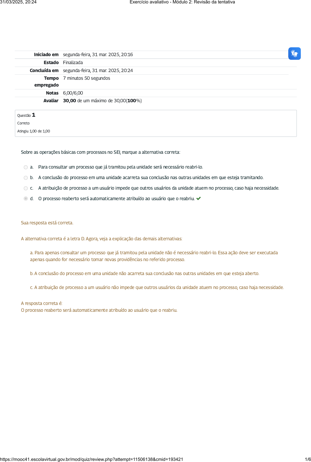 Iniciado em segunda-feira, 31 mar. 2025, 20:16 Estado Finalizada Concluída em segunda-feira, 31 mar. 2025, 20:24 Tempo empregado 7 minutos 50 segundos Notas 6,00/6,00 Avaliar 30,00 de um máximo de 30,00(100%) Questão 1 Correto Atingiu 1,00 de 1,00 Sobre as operações básicas com processos no SEI, marque a alternativa correta: a. Para consultar um processo que já tramitou pela unidade será necessário reabri-lo. b. A conclusão do processo em uma unidade acarreta sua conclusão nas outras unidades em que esteja tramitando. c. A atribuição de processo a um usuário impede que outros usuários da unidade atuem no processo, caso haja necessidade. d. O processo reaberto será automaticamente atribuído ao usuário que o reabriu. Sua resposta está correta. A alternativa correta é a letra D. Agora, veja a explicação das demais alternativas: a. Para apenas consultar um processo que já tramitou pela unidade não é necessário reabri-lo. Essa ação deve ser executada apenas quando for necessário tomar novas providências no referido processo. b. A conclusão do processo em uma unidade não acarreta sua conclusão nas outras unidades em que esteja aberto. c. A atribuição de processo a um usuário não impede que outros usuários da unidade atuem no processo, caso haja necessidade. A resposta correta é: O processo reaberto será automaticamente atribuído ao usuário que o reabriu. 31/03/2025, 20:24 Exercício avaliativo - Módulo 2: Revisão da tentativa https://mooc41.escolavirtual.gov.br/mod/quiz/review.php?attempt=11506138&cmid=193421 1/6 Questão 2 Correto Atingiu 1,00 de 1,00 Com base no conteúdo sobre nível de acesso, marque a alternativa correta: a. Os processos classificados como públicos ficarão disponíveis para visualização de todos os usuários do órgão, no entanto, os seus documentos assinados não. b. Processos podem ser classificados como restritos a critério do usuário, independentemente de uma hipótese legal que justifique a restrição de acesso. c. Processos classificados como restritos, bem como os seus documentos, ficarão disponíveis para visualização de usuários das unidades pelas quais o processo tramitar. d. Processos classificados como sigilosos, bem como os seus documentos, ficarão disponíveis para visualização de usuários das unidades pelas quais o processo tramitar. Sua resposta está correta. A alternativa correta é a letra C. Agora, veja a explicação das demais alternativas: a) Processos classificados como públicos, bem como os seus documentos assinados, ficarão disponíveis para visualização de todos os usuários do órgão. b) Ao selecionar a opção Restrito durante a criação de um processo, o sistema exibirá campo para seleção da hipótese legal de restrição. A indicação da hipótese é obrigatória e deverá seguir a legislação em vigor. d) Processos classificados como sigilosos, bem como os seus documentos, ficarão disponíveis para visualização apenas para usuários com permissão específica e previamente credenciados. A resposta correta é: Processos classificados como restritos, bem como os seus documentos, ficarão disponíveis para visualização de usuários das unidades pelas quais o processo tramitar. 31/03/2025, 20:24 Exercício avaliativo - Módulo 2: Revisão da tentativa https://mooc41.escolavirtual.gov.br/mod/quiz/review.php?attempt=11506138&cmid=193421 2/6 Questão 3 Correto Atingiu 1,00 de 1,00 Sobre as operações de manutenção e acompanhamento de processos, marque a alternativa correta: a. Os Marcadores são gerenciados e adicionados aos processos pela própria unidade, porém não há autonomia para definir a cor e a descrição de cada marcador. b. A existência de anotação prioritária em um processo poderá ser identificada por ícone amarelo ao lado do número do processo, na Tela de Controle de Processos ou na Tela do Processo. c. Durante a consulta dos andamentos de um processo, será possível, somente, ver o histórico resumido desses andamentos. d. O SEI permite o envio de e-mails diretamente do processo, via Tela do Processo. Sua resposta está correta. A alternativa correta é a letra D. Veja a explicação das demais alternativas: a) Os Marcadores são criados, gerenciados e adicionados aos processos pela própria unidade, que tem autonomia para definir a cor e a descrição de cada Marcador. b) A existência de anotação prioritária em um processo poderá ser identificada por ícone vermelho ao lado do número do processo, na Tela de Controle de Processos e na Tela do Processo. c) Na consulta dos andamentos de uma pasta será possível visualizar o histórico completo da pasta, por meio do filtro “ver histórico completo”. A resposta correta é: O SEI permite o envio de e-mails diretamente do processo, via Tela do Processo. 31/03/2025, 20:24 Exercício avaliativo - Módulo 2: Revisão da tentativa https://mooc41.escolavirtual.gov.br/mod/quiz/review.php?attempt=11506138&cmid=193421 3/6 Questão 4 Correto Atingiu 1,00 de 1,00 Sobre as operações de manutenção e acompanhamento de processos, marque a alternativa correta: a. O SEI oferece ferramenta que permite a definição de um prazo para retorno de processo enviado a outra unidade. O nome dessa ferramenta é Retorno Programado. b. O SEI não oferece ferramenta de exportação de documentos existentes nos processos eletrônicos. c. O SEI conta com funcionalidade que permite a exportação de documentos nos formatos DOCX e RAR. d. O SEI permitirá, somente, o registro de andamentos automáticos, impossibilitando que o usuário faça registros dos fatos e atos ocorridos no processo, conforme a sua percepção. Sua resposta está correta. A alternativa correta é a letra A. Veja a explicação das demais alternativas: Para a alternativa “b” e “c”: o SEI conta com funcionalidade que permite a exportação de documentos nos formatos PDF e ZIP. Já em relação à alternativa “d”: o SEI permite que o usu