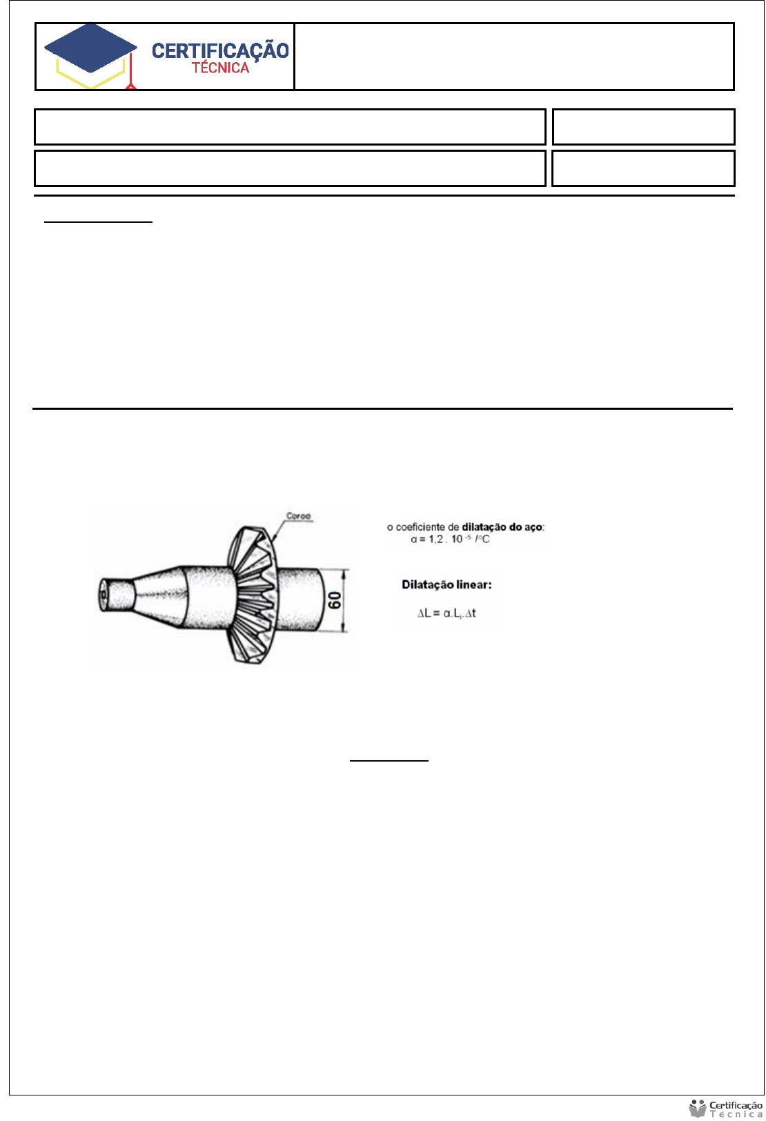 INSTRUÇÕES: ❖ Esta Avaliação contém 4 (quatro) questões, totalizando 10 (dez) pontos; ❖ Baixe o arquivo disponível com a Atividade Pratica; ❖ Você deve preencher dos dados no Cabeçalho para sua identificação: o Nome / Data de entrega. ❖ As respostas devem ser digitadas abaixo de cada pergunta; ❖ Ao terminar grave o arquivo com o nome Atividade Prática; o Quando solicitado ❖ Envio o arquivo pelo sistema no local indicado; ❖ Em caso de dúvidas consulte o seu Tutor. Aluno (a): MATHEUS MARTINS DE FAIRAS Data: 13/10/2025 Prática em Funções e Trigonometria Básica para Mecânica Prática em Funções e Trigonometria Básica para Mecânica Avaliação Prática 1) Se o diâmetro do furo da cora é 0,03 milímetros menor do que o diâmetro do eixo, encontre qual é a temperatura a que o diâmetro do furo da coroa deve ser submetido para montar o conjunto. Lembrando que o material do conjunto é de aço e o diâmetro do eixo é de 60 milímetros 0,03=1,2×10−5×59,97×ΔT 0,03 = 0,000012 × 59,97 × Δ𝑇 0,03 = 0,00071964 × Δ𝑇 Δ𝑇 = 0,03 0,00071964 Δ𝑇 = 41,68°C 2) Problema relacionado ao “Rabo de Andorinha”. Considerando a imagem abaixo e os dados fornecidos, aplique as formulas e encontre os valores de a, b , e Prática em Funções e Trigonometria Básica para Mecânica Cálculo de 𝒃: 𝑏 = 105 − 2 × 14 2,747477419 𝑏 = 105 − 10,191166559 𝑏 = 94,81 mm Cálculo de 𝒂: 𝑎 = 105 − 10 × (1 + 1,42814800) 𝑎 = 105 − 10 × 2,42814800 𝑎 = 105 − 24,28148006 𝑎 = 80,72 mm Cálculo de 𝒆: 𝑒 = 94,808 + 10 × (1 + 1,42814800) 𝑒 = 94,808 + 10 × 2,42814800 𝑒 = 94,808 + 24,28148006 𝑒 = 119,09 mm Resultado final: 𝑎 = 80,72 mm 𝑏 = 94,81 mm 𝑒 = 119,09 mm 3) Qual o valor da medida faltante X Prática em Funções e Trigonometria Básica para Mecânica Cálculo do raio 𝒓: (2𝑟)2 = 122 + 𝑟2 4𝑟2 = 144 + 𝑟2 4𝑟2 − 𝑟2 = 144 3𝑟2 = 144 𝑟2 = 144 3 𝑟2 = 48 𝑟 = √48 𝑟 = 6,93 mm Cálculo do diâmetro: 𝑑 = 2𝑟 𝑑 = 2 × 6,93 𝑑 = 13,86 mm Resultado final: 𝑟 = 6,93 mm e 𝑑 = 13,86 mm 4) Temos uma peço circular de 10 milímetros de raio e precisa de 4 furos iguais e mesma distância entre eles. Calcule qual será esta distância. Cálculo da distância entre furos: Distância entre furos = 10 × 1,4142 Distância entre furos = 14,142 mm Resposta final: Distância entre furos = 14,14 mm