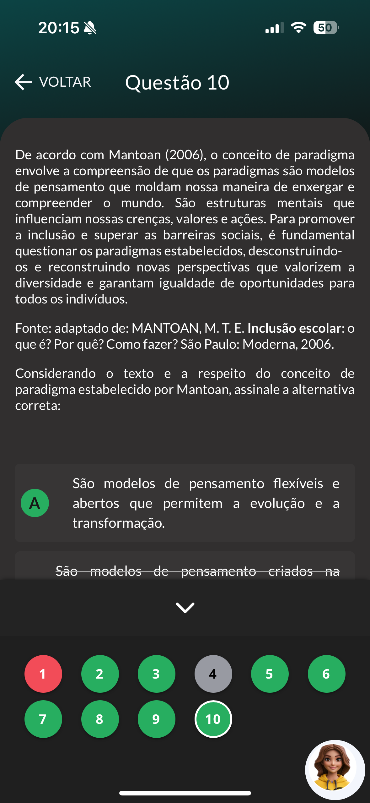 20:15 50 VOLTAR Questão 10 De acordo com Mantoan (2006), conceito de paradigma envolve a compreensão de que os paradigmas são modelos de pensamento que moldam nossa maneira de enxergar e compreender mundo. São estruturas mentais que influenciam nossas crenças, valores e ações. Para promover a inclusão e superar as barreiras sociais, é fundamental questionar os paradigmas estabelecidos, desconstruindo- os e reconstruindo novas perspectivas que valorizem a diversidade e garantam igualdade de oportunidades para todos os indivíduos. Fonte: adaptado de: MANTOAN, M.T. Inclusão escolar: que é? Por quê? Como fazer? São Paulo: Moderna, 2006. Considerando texto e a respeito do conceito de paradigma estabelecido por Mantoan, assinale a alternativa correta: São modelos de pensamento flexíveis e A abertos que permitem a evolução e a transformação. São modelos de pensamento criados na 1 2 3 4 5 6 7 8 9 10