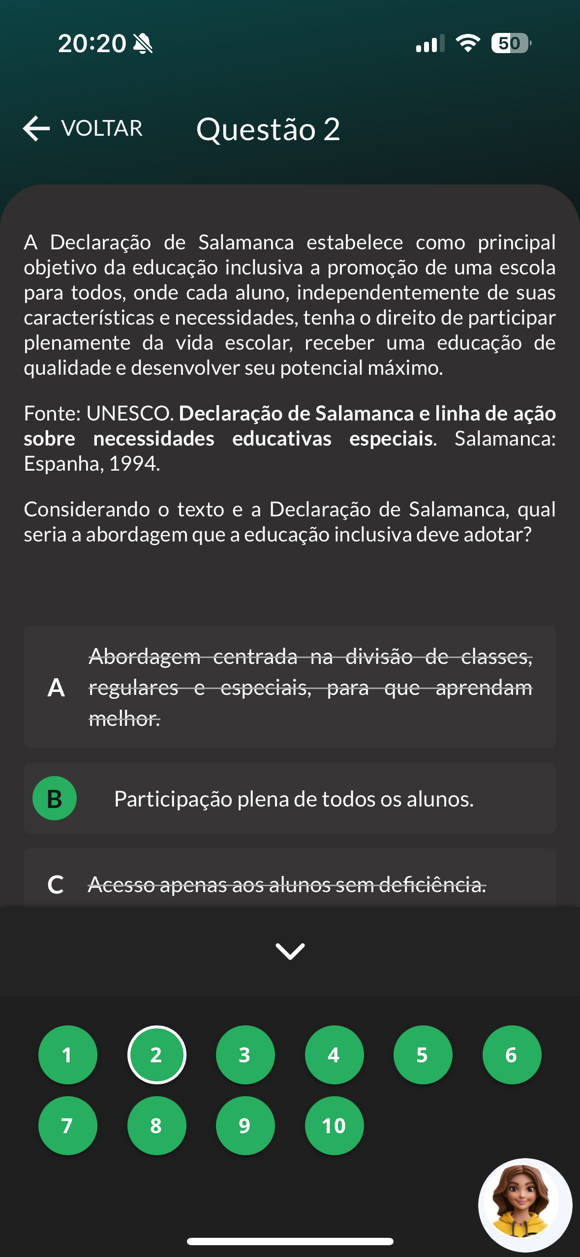 20:20 50 VOLTAR Questão 2 A Declaração de Salamanca estabelece como principal objetivo da educação inclusiva a promoção de uma escola para todos, onde cada aluno, independentemente de suas características e necessidades, tenha direito de participar plenamente da vida escolar, receber uma educação de qualidade e desenvolver seu potencial máximo. Fonte: UNESCO. Declaração de Salamanca e linha de ação sobre necessidades educativas especiais. Salamanca: Espanha, 1994. Considerando texto e a Declaração de Salamanca, qual seria a abordagem que a educação inclusiva deve adotar? Abordagem centrada na divisão de classes, A regulares e especiais, para que aprendam melhor. Participação plena de todos os alunos. c Acesso apenas aos alunos sem deficiência. 1 2 3 4 5 6 7 8 9 10