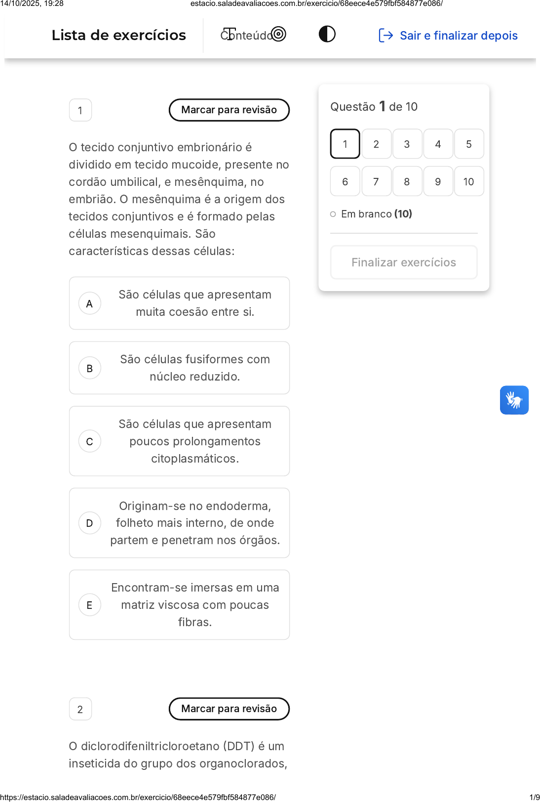 A B C D E 1 Marcar para revisão O tecido conjuntivo embrionário é dividido em tecido mucoide, presente no cordão umbilical, e mesênquima, no embrião. O mesênquima é a origem dos tecidos conjuntivos e é formado pelas células mesenquimais. São características dessas células: São células que apresentam muita coesão entre si. São células fusiformes com núcleo reduzido. São células que apresentam poucos prolongamentos citoplasmáticos. Originam-se no endoderma, folheto mais interno, de onde partem e penetram nos órgãos. Encontram-se imersas em uma matriz viscosa com poucas fibras. 2 Marcar para revisão O diclorodifeniltricloroetano (DDT) é um inseticida do grupo dos organoclorados, Questão 1 de 10 Em branco (10) 1 2 3 4 5 6 7 8 9 10 Finalizar exercícios Lista de exercícios Conteúdo Sair e finalizar depois 14/10/2025, 19:28 estacio.saladeavaliacoes.com.br/exercicio/68eece4e579fbf584877e086/ https://estacio.saladeavaliacoes.com.br/exercicio/68eece4e579fbf584877e086/ 1/9 A B C D E que foi amplamente utilizado após a Segunda Guerra Mundial para o combate aos vetores da malária e do tifo. É barato e altamente eficiente no curto prazo, mas, no longo prazo, tem efeitos prejudiciais à saúde humana. O DDT apresenta toxicidade e característica lipossolúvel. Nos indivíduos adultos, esse composto acumula-se, preferencialmente, no: Tecido epitelial glandular Tecido adiposo multilocular Tecido conjuntivo frouxo Tecido conjuntivo denso não modelado Tecido adiposo unilocular 3 Marcar para revisão Existem dois tipos de tecido adiposo: o unilocular e o multilocular. A seguir estão descritas algumas características do tecido adiposo multilocular. Assinale a alternativa que entre as que NÃO corresponde a uma característica desse tecido: 14/10/2025, 19:28 estacio.saladeavaliacoes.com.br/exercicio/68eece4e579fbf584877e086/ https://estacio.saladeavaliacoes.com.br/exercicio/68eece4e579fbf584877e086/ 2/9 A B C D E Suas células possuem diversas gotículas lipídicas em seu citoplasma Sua principal função é liberar energia na forma de calor Tanto os adipócitos quanto as paredes vasculares são diretamente inervados. Secreta hormônios como a leptina e a lipase lipoproteica Sua quantidade só é significativa no recém-nascido, sendo quase nula no adulto. 4 Marcar para revisão Os ácinos serosos e os túbulos mucosos representam unidades glandulares muito comuns no organismo e encontram-se presentes em vários órgãos. A respeito do tema, analise as afirmativas a seguir: I. Os túbulos mucosos são estruturas alongadas, tubulares, frequentemente ramificadas. II. Os ácinos serosos são formados por células colunares, com lúmen dilatado. III. A região apical das células acinosas é ocupada por grânulos de secreção. É correto o que se afirma em: 14/10/2025, 19:28 estacio.saladeavaliacoes.com.br/exercicio/68eece4e579fbf584877e086/ https://estacio.saladeavaliacoes.com.br/exercicio/68eece4e579fbf584877e086/ 3/9 A B C D E A B I e II I e III II e III II III 5 Marcar para revisão Um aluno de graduação, ao microscópio de campo claro, observou a seguinte estrutura: https://www.shutterstock.com/pt/image- photo/ciliated-pseudostratified- columnar-epithelium-trachea- respiratory-1042870189 Sabendo que as fibras da lâmina basal estão coradas em azul, qual a classificação do epitélio apoiado sobre ela? Epitélio estratificado de transição Epitélio pseudoestratificado 14/10/2025, 19:28 estacio.saladeavaliacoes.com.br/exercicio/68eece4e579fbf584877e086/ https://estacio.saladeavaliacoes.com.br/exercicio/68eece4e579fbf584877e086/ 4/9 C D E A B C D E Epitélio simples colunar Epitélio estratificado cilíndrico Epitélio simples pavimentoso 6 Marcar para revisão Além do notável papel energético, o tecido adiposo apresenta muitas funções. A seguir são listadas algumas funções desse tecido. Assinale a alternativa que não apresenta uma função desse tecido. Revestir superfícies e cavidades corporais Preencher espaços entre outros tecidos Participar da proteção e regulação térmica do organismo Modelar a superfície corporal Secretar hormônios 7 Marcar para revisão 14/10/2025, 19:28 estacio.saladeavaliacoes.com.br/exercicio/68eece4e579fbf584877e086/ https://estacio.saladeavaliacoes.com.br/exercicio/68eece4e579fbf584877e086/ 5/9 A B C D E O tecido conjuntivo propriamente dito pode ser dividido em tecido frouxo e denso. Analise as afirmativas abaixo e assinale a alternativa correta a respeito do tecido conjuntivo dito frouxo. Apresenta predominância de fibras e poucas células como fibroblastos e macrófagos. Apresenta consistência flexível e altamente resistente a trações. É um tecido raro no organismo, pouco vascularizado e inervado. Forma camadas ao redor dos vasos sanguíneos e dá suporte às células epiteliais. Pode ser encontrado na derme profunda da pele e na submucosa do tubo digestivo. 8 Marcar para revisão Ao contrário do tecido adiposo unilocular, cuja principal função é armazenar energia, o tecido adiposo multilocular a dissipa. Sobre esse processo, é correto afirmar que: 14/10/2025, 19:28 estacio.saladeavaliacoes.com.br/exercicio/68eece4e579fbf584877e086/ https://estacio.saladeavaliacoes.com.br/exercicio/68eece4e579fbf584877e086/ 6/9 A B C D E A liberação de energia pelos adipócitos multiloculares ocorre após o estímulo de serotonina. A termogenina possibilita que o fluxo de prótons volte para a matriz mitocondrial sem passar pelo sistema de ATP sintase. A oxidação dos ácidos graxos produz calor ao invés de ATP, assim como os demais tecidos do organismo. A termogenina é uma proteína transmembrana presente na matriz mitocondrial. A termogenina possibilita que o fluxo de elétrons volte para o espaço intermembranas sem produzir ATP. 9 Marcar para revisão O tecido conjuntivo possui três tipos de fibras: colágenas, reticulares e elásticas. A seguir são listadas algumas características dessas fibras. Assinale a altern