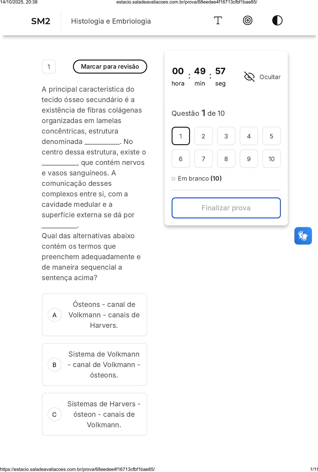 A B C 1 Marcar para revisão A principal característica do tecido ósseo secundário é a existência de fibras colágenas organizadas em lamelas concêntricas, estrutura denominada ___________. No centro dessa estrutura, existe o ___________, que contém nervos e vasos sanguíneos. A comunicação desses complexos entre si, com a cavidade medular e a superfície externa se dá por ___________. Qual das alternativas abaixo contém os termos que preenchem adequadamente e de maneira sequencial a sentença acima? Ósteons - canal de Volkmann - canais de Harvers. Sistema de Volkmann - canal de Volkmann - ósteons. Sistemas de Harvers - ósteon - canais de Volkmann. 00 hora : 49 min : 57 seg Ocultar Questão 1 de 10 Em branco (10) Finalizar prova 1 2 3 4 5 6 7 8 9 10 SM2 Histologia e Embriologia 14/10/2025, 20:38 estacio.saladeavaliacoes.com.br/prova/68eedee4f16713cfbf1bae85/ https://estacio.saladeavaliacoes.com.br/prova/68eedee4f16713cfbf1bae85/ 1/11 D E A B C Ósteons - canal de Harvers - canais de Volkmann. Centro de ossificação - ósteon - canais de Harvers. 2 Marcar para revisão O desenvolvimento e a reparação óssea são processos complexos que envolvem a formação de novo tecido ósseo. Existem dois processos principais de ossificação responsáveis pela formação óssea durante o desenvolvimento embrionário e a cicatrização de fraturas. Qual dos seguintes processos descreve a formação óssea que ocorre diretamente dentro de uma membrana conjuntiva, sem um modelo cartilaginoso prévio? Ossificação endocondral. Ossificação intramembranosa. Ossificação perióstea. 14/10/2025, 20:38 estacio.saladeavaliacoes.com.br/prova/68eedee4f16713cfbf1bae85/ https://estacio.saladeavaliacoes.com.br/prova/68eedee4f16713cfbf1bae85/ 2/11 D E A B C D E Ossificação condrogênica. Ossificação sinovial. 3 Marcar para revisão A cartilagem é um tipo de tecido conectivo especializado, fundamental para várias estruturas do corpo humano. Existem diferentes tipos de cartilagem, cada um com suas características e funções específicas. Qual das seguintes cartilagens é conhecida pela sua flexibilidade e presença em estruturas como a orelha externa e a epiglote? Cartilagem hialina. Cartilagem fibrosa. Cartilagem elástica. Cartilagem sinovial. Cartilagem articular. 14/10/2025, 20:38 estacio.saladeavaliacoes.com.br/prova/68eedee4f16713cfbf1bae85/ https://estacio.saladeavaliacoes.com.br/prova/68eedee4f16713cfbf1bae85/ 3/11 A B C 4 Marcar para revisão O tecido muscular representa um dos quatro tipos de tecido do corpo e é responsável pelo movimento do corpo como um todo e pelas mudanças no tamanho e formato dos órgãos internos. A seguir, são listadas algumas características da contração muscular. Assinale a alternativa que apresenta uma característica correta do processo de contração muscular. O sistema de túbulos transversais garante que a contração muscular se dê de maneira uniforme por todo o músculo. Durante a contração do músculo estriado, as miofibrilas se encurtam e causam o encurtamento de todo o sarcômero. Quando a fibra do nervo motor recebe um impulso nervoso, seu terminal axônico libera norepinefrina que se associa a receptores do sarcolema. 14/10/2025, 20:38 estacio.saladeavaliacoes.com.br/prova/68eedee4f16713cfbf1bae85/ https://estacio.saladeavaliacoes.com.br/prova/68eedee4f16713cfbf1bae85/ 4/11 D E A B C A contração tem fim quando a membrana do retículo transfere os íons de cálcio para o interior das suas cisternas, em um processo passivo. No músculo liso, com o estímulo do sistema nervoso autônomo, os íons de cálcio migram do retículo sarcoplasmático para o sarcoplasma. 5 Marcar para revisão O tecido ósseo é uma especialização do tecido conjuntivo que se caracteriza por possuir matriz extracelular mineralizada, constituída majoritariamente por: Carbonato de cálcio. Fosfato de potássio. Hidróxido de cálcio. 14/10/2025, 20:38 estacio.saladeavaliacoes.com.br/prova/68eedee4f16713cfbf1bae85/ https://estacio.saladeavaliacoes.com.br/prova/68eedee4f16713cfbf1bae85/ 5/11 D E A B C D E Permanganato de zinco. Fosfato de cálcio. 6 Marcar para revisão São células de morfologia estrelada, com múltiplas projeções, que conectam os neurônios aos capilares sanguíneos e à pia-máter. Essas são características de quais células da glia? Micróglia. Astrócitos. Oligodendrócitos. Células ependimárias. Células de Schwann. 7 Marcar para revisão No sistema nervoso central, as células da glia possuem 14/10/2025, 20:38 estacio.saladeavaliacoes.com.br/prova/68eedee4f16713cfbf1bae85/ https://estacio.saladeavaliacoes.com.br/prova/68eedee4f16713cfbf1bae85/ 6/11 A B C D E diferentes funções. Sobre elas, marque a alternativa correta: A micróglia é responsável por formar uma rede de proteção dos neurônios e pela produção do líquido cerebrospinal. Os oligodendrócitos ajudam a manter as condições ideais para a produção dos impulsos nervosos e para a nutrição dos neurônios. As células ependimárias são responsáveis pela produção do estrato mielínico dos axônios. A micróglia é ativada durante eventos inflamatórios no sistema nervoso central. Os astrócitos atuam diretamente na nutrição e no amortecimento do sistema nervoso central. 14/10/2025, 20:38 estacio.saladeavaliacoes.com.br/prova/68eedee4f16713cfbf1bae85/ https://estacio.saladeavaliacoes.com.br/prova/68eedee4f16713cfbf1bae85/ 7/11 A B C D E 8 Marcar para revisão Qual o nome do menor e principal constituinte proteico do plasma, responsável por exercer o gradiente de concentração entre o sangue e o líquido extracelular tecidual? Imunoglobulina. Lipoproteína. Albumina. Fibrinogênio. Hemoglobina. 9 Marcar para revisão Na última edição das Olimpíadas de Inverno, uma das atletas de patinação foi eliminada no exame antidoping porque, embora não houvesse vestígio de nenhuma substância estranha em seu organismo, ela apresentava uma taxa de hemácias e de