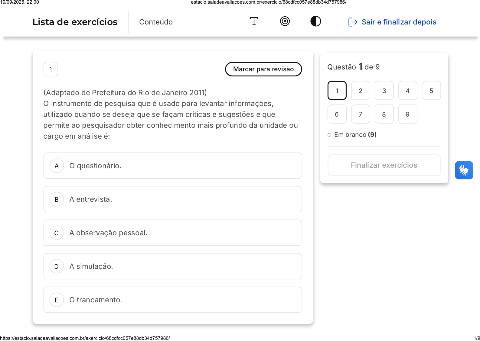 A B C D E 1 Marcar para revisão (Adaptado de Prefeitura do Rio de Janeiro 2011) O instrumento de pesquisa que é usado para levantar informações, utilizado quando se deseja que se façam críticas e sugestões e que permite ao pesquisador obter conhecimento mais profundo da unidade ou cargo em análise é: O questionário. A entrevista. A observação pessoal. A simulação. O trancamento. Questão 1 de 9 Em branco (9) 1 2 3 4 5 6 7 8 9 Finalizar exercícios Lista de exercícios Conteúdo Sair e finalizar depois 19/09/2025, 22:00 estacio.saladeavaliacoes.com.br/exercicio/68cdfcc057e88db34d757986/ https://estacio.saladeavaliacoes.com.br/exercicio/68cdfcc057e88db34d757986/ 1/9 A B C D E 2 Marcar para revisão O recrutador precisa ficar atento para não ter atitudes inadequadas durante uma entrevista. Que tipo de atitude o recrutador pode tomar com o candidato sem correr o risco de ser inapropriado? Apressar o candidato para terminar a entrevista no prazo. Definir como conduzirá a entrevista. Fazer comentários negativos sobre a empresa. Fazer perguntas de cunho pessoal. Todas as alternativas estão incorretas. 3 Marcar para revisão Testes são recursos muito utilizados nos processos de seleção. Qual é o 19/09/2025, 22:00 estacio.saladeavaliacoes.com.br/exercicio/68cdfcc057e88db34d757986/ https://estacio.saladeavaliacoes.com.br/exercicio/68cdfcc057e88db34d757986/ 2/9 A B C D E principal objetivo de um teste em uma seleção? Identificar o grau de domínio que o candidato demonstra para a competência a ser avaliada. Demonstrar clareza, confiança, conhecimento e simpatia ao se comunicar com o entrevistador. Falar sobre sua experiência e dos conhecimentos que adquiriu. Evidenciar para o entrevistador os conhecimentos obtidos através de cursos e trabalhos voluntários. Todas as alternativas estão incorretas. 4 Marcar para revisão Decidir qual candidato será escolhido é, provavelmente, uma das partes mais difíceis de todo o processo de seleção. Indique abaixo qual mecanismo não faz parte da tomada de decisão na seleção. 19/09/2025, 22:00 estacio.saladeavaliacoes.com.br/exercicio/68cdfcc057e88db34d757986/ https://estacio.saladeavaliacoes.com.br/exercicio/68cdfcc057e88db34d757986/ 3/9 A B C D E Buscar referências profissionais dos candidatos. Verificar o alinhamento cultural do candidato com a empresa. Deixar claro desde o início do processo quais serão as etapas. Mensurar as habilidades específicas dos candidatos. Todas as alternativas estão incorretas. 5 Marcar para revisão Os jogos corporativos e as dinâmicas de grupo são atividades vivenciais e permitem que o recrutador identifique as competências em ação. Qual competência não costuma ser identificada em uma dinâmica de grupo? 19/09/2025, 22:00 estacio.saladeavaliacoes.com.br/exercicio/68cdfcc057e88db34d757986/ https://estacio.saladeavaliacoes.com.br/exercicio/68cdfcc057e88db34d757986/ 4/9 A B C D E Avaliar proficiência. Tomada de decisões. Exercitar planejamento. Pensar por hipóteses. Todas as alternativas estao incorretas. 6 Marcar para revisão Para o candidato, saber o que não fazer é tão importante quanto saber o que fazer durante uma entrevista. Qual postura é reprovada de forma instantânea durante uma avaliação pessoal? 19/09/2025, 22:00 estacio.saladeavaliacoes.com.br/exercicio/68cdfcc057e88db34d757986/ https://estacio.saladeavaliacoes.com.br/exercicio/68cdfcc057e88db34d757986/ 5/9 A B C D E Falar sobre benefícios. Falar sobre amenidades. Falar sobre experiências. Falar sobre conhecimentos. Todas as alternativas estão incorretas. 7 Marcar para revisão Atualmente, os recrutadores contam com mais ferramentas de recrutamento e seleção que nunca. O avanço da tecnologia possibilitou uma melhora substancial nos processos de contratação. Dentre as ferramentas de seleção estão o(a)s ____________________________, se você necessita de um profissional que já tenha experiência no cargo oferecido. Aqui, você vai conhecer as qualificações da pessoa e tudo o que ela pode oferecer para a sua empresa. Sua aplicação, de maneira teórica e/ou de forma prática pode ser essencial para a contratação de pessoas experientes. 19/09/2025, 22:00 estacio.saladeavaliacoes.com.br/exercicio/68cdfcc057e88db34d757986/ https://estacio.saladeavaliacoes.com.br/exercicio/68cdfcc057e88db34d757986/ 6/9 A B C D E O termo que melhor completa a frase é: Entrevistas técnicas e comportamentais. Testes técnicos. Apresentação de cases. Simulações e dinâmicas de grupos. Assimilaridade comportamental. 8 Marcar para revisão (Adaptado de FCC 2014) Leia o texto: As ferramentas de recrutamento e seleção agilizam todo o processo de contratação de um candidato, além de fazer toda a gestão do processo seletivo online através de um software ATS completo para apoiar os profissionais de RH que desejam ter mais autonomia e agilidade em todas as etapas de contratação. 19/09/2025, 22:00 estacio.saladeavaliacoes.com.br/exercicio/68cdfcc057e88db34d757986/ https://estacio.saladeavaliacoes.com.br/exercicio/68cdfcc057e88db34d757986/ 7/9 A B C D E Disponível em https://forbusiness.vagas.com.br/blog/melhores- ferramentas-de-recrutamento-e-selecao/. Uma ferramenta para perceber as necessidades do cliente é o rapport, que significa: Gerar confiança no cliente para poder opinar com maior segurança no momento em que o cliente necessitar de apoio. Vender uma boa imagem da organização. Entrar no mundo do cliente e fazer com que ele perceba que está sendo compreendido. Receber o cliente bem e sempre com um café à mesa. Facilitar todo o processo de atendimento. 9 Marcar para revisão O primeiro passo para decidir quem contratar é determinar o CHA, que são as três dimensões da competência, variando de conhecimentos explícitos 19/09/2025, 22:00 estacio.saladeavaliacoes.com.br/exercicio/68cdfcc057e88db34d757986/ https://estacio.saladeavaliacoes.com.br/exercicio/68cdfcc057e88db34d757986/ 8/9 A B C D E ou tácitos