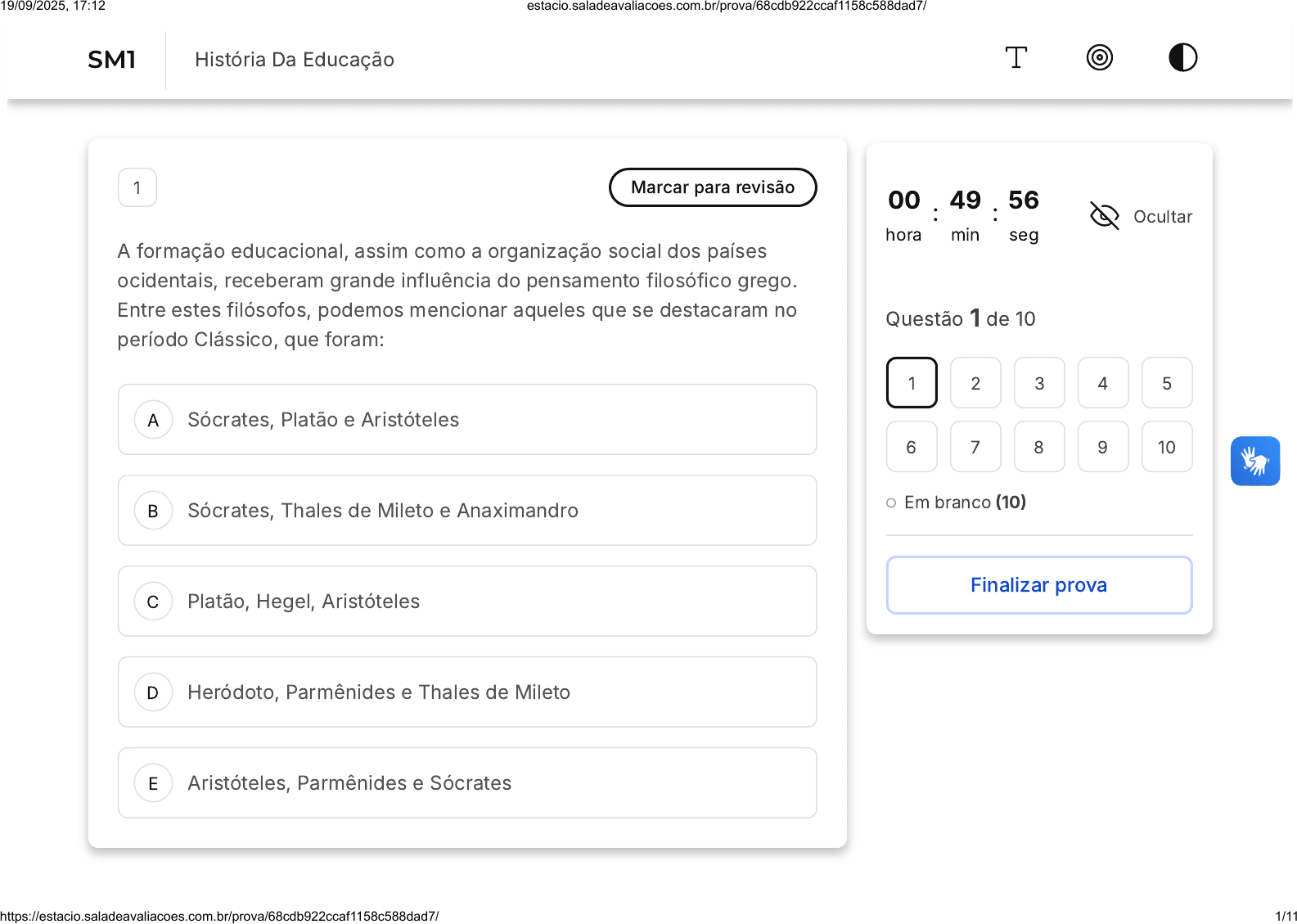 A B C D E 1 Marcar para revisão A formação educacional, assim como a organização social dos países ocidentais, receberam grande influência do pensamento filosófico grego. Entre estes filósofos, podemos mencionar aqueles que se destacaram no período Clássico, que foram: Sócrates, Platão e Aristóteles Sócrates, Thales de Mileto e Anaximandro Platão, Hegel, Aristóteles Heródoto, Parmênides e Thales de Mileto Aristóteles, Parmênides e Sócrates 00 hora : 49 min : 56 seg Ocultar Questão 1 de 10 Em branco (10) Finalizar prova 1 2 3 4 5 6 7 8 9 10 SM1 História Da Educação 19/09/2025, 17:12 estacio.saladeavaliacoes.com.br/prova/68cdb922ccaf1158c588dad7/ https://estacio.saladeavaliacoes.com.br/prova/68cdb922ccaf1158c588dad7/ 1/11 A B C D E 2 Marcar para revisão Sócrates, no século IV a.C, criou um método, cujo nome foi dado em homenagem à profissão de sua mãe, que era parteira. Esse método de ensino investigativo, baseado em interrogações, significa "dar à luz" ao conhecimento. O método tem duas etapas que destroem as "falsas verdades", fazendo surgir a verdade. Este método é conhecido como: Maiêutica Pedagogia Peripatética Arche Dialética 3 Marcar para revisão 19/09/2025, 17:12 estacio.saladeavaliacoes.com.br/prova/68cdb922ccaf1158c588dad7/ https://estacio.saladeavaliacoes.com.br/prova/68cdb922ccaf1158c588dad7/ 2/11 A B C A história de Atenas, do início ao fim, é apenas um longo e esplêndido triunfo da juventude. Com esses sentimentos, os atenienses não podiam obrigar a criança à severa disciplina que se lhe impunha em outros lugares e, nem nos estudos nem na conduta, exigiam dela uma obediência que julgavam incompatível com seu caráter. SILVA, R. G. T. DA. Espartanos e atenienses na escola: da filologia clássica à educação nacional nos Estados modernos europeus. Educação e Pesquisa, v. 45, 2019. A respeito da educação ateniense, avalie as asserções a seguir e a relação proposta entre elas I - A educação ateniense tinha como objetivo a formação da cidadania e um de seus fundamentos era o estudo da retórica. PORQUE II - Era importante a capacidade dos cidadãos de se expressar oralmente e conduzir os debates que ocorriam na Ágora, onde a opinião pública se manifestava. A respeito dessas asserções, assinale a opção correta. As asserções I e II são proposições verdadeiras, e a II é uma justificativa correta da I. As asserções I e II são proposições verdadeiras, mas a II não é uma justificativa correta da I. A asserção I é uma proposição verdadeira, e a II é uma proposição falsa. 19/09/2025, 17:12 estacio.saladeavaliacoes.com.br/prova/68cdb922ccaf1158c588dad7/ https://estacio.saladeavaliacoes.com.br/prova/68cdb922ccaf1158c588dad7/ 3/11 D E A B C A asserção I é uma proposição falsa, e a II é uma proposição verdadeira. As asserções I e II são proposições falsas. 4 Marcar para revisão Segundo este filósofo, somente através da educação o homem pode desenvolver a prática do bem-estar comum. Para que a Educação alcance seus objetivos é necessário um conjunto de atividades pedagógicas coordenadas, tendo em vista uma cidade perfeita e um cidadão feliz. Essas ideias são defendidas por: Aristóteles Francis Bacon Rousseau 19/09/2025, 17:12 estacio.saladeavaliacoes.com.br/prova/68cdb922ccaf1158c588dad7/ https://estacio.saladeavaliacoes.com.br/prova/68cdb922ccaf1158c588dad7/ 4/11 D E A B C Maquiavel René Descartes 5 Marcar para revisão A imprensa, uma invenção do século XV d.C. do alemão Johannes Gutenberg, foi extremamente importante para facilitar a troca de informações e a divulgação do conhecimento. No entanto, durante praticamente toda a Idade Média, antes da invenção desta máquina, esse trabalho ficava a cargo de monges responsáveis por copiar e manter o conhecimento. Como eram chamados esses monges? Monges copistas Monges Beneditinos Monges Dominicanos 19/09/2025, 17:12 estacio.saladeavaliacoes.com.br/prova/68cdb922ccaf1158c588dad7/ https://estacio.saladeavaliacoes.com.br/prova/68cdb922ccaf1158c588dad7/ 5/11 D E A B C Monges Copiadores Monges Capuchinhos 6 Marcar para revisão Alguns filósofos da antiguidade tiveram uma importância essencial no desenvolvimento das bases da educação, seja organizando o conhecimento, ou divulgando-o. Marciano Capela, filósofo romano do século V, criou o modelo que teria prevalência na Europa, denominado de Sete Artes Liberais. Como eram chamadas as artes inspiradas por Deus e as artes humanas no modelo de Capela? Trivium e Quadrivium Triunvirato e Quatrovirato Artes e Ciências 19/09/2025, 17:12 estacio.saladeavaliacoes.com.br/prova/68cdb922ccaf1158c588dad7/ https://estacio.saladeavaliacoes.com.br/prova/68cdb922ccaf1158c588dad7/ 6/11 D E A B C Trivium e Primium Tércio e Quátrio 7 Marcar para revisão Durante a Idade Média, existiram dois movimentos/modelos intelectuais centrais. Um que era influenciado pelos pais da igreja e outro que aparece ao lado dos movimentos urbanos e as novas técnicas educacionais trazidas pelos árabes. Como chamamos esses dois modelos? Neoplatonismo e Neoaristotelismo Neoplatonismo e Neosocratismo Neosocratismo e Neoaristotelismo 19/09/2025, 17:12 estacio.saladeavaliacoes.com.br/prova/68cdb922ccaf1158c588dad7/ https://estacio.saladeavaliacoes.com.br/prova/68cdb922ccaf1158c588dad7/ 7/11 D E A B Neoarquimediano e Neoaristotelismo Neosocratismo e Neoarquimediano 8 Marcar para revisão A Reforma e a Contrarreforma da Igreja Cristã não eram sobre não acreditar em Deus e sim na forma como era mais considerada mais coerente a prática religiosa. A partir dessa premissa avalie as asserções a seguir e a relação proposta entre elas I. A Reforma proposta por Martinho Lutero foi importante para a educação PORQUE II. Um de seus ideais era defender que a educação não fosse restrita ao clero e a nobreza. A respeito dessas asserções, assinale a opção correta. As asserções I e II são proposições