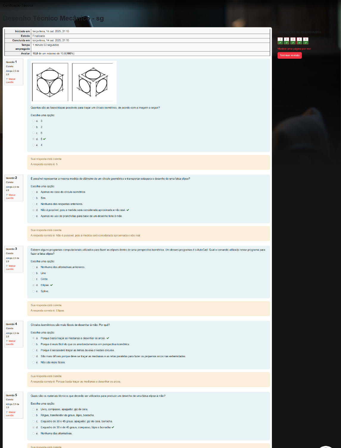 Certificação Técnica Desenho Técnico Mecânico sg Iniciado em terça-feira, 14 2025, 21:13 do questionário Estado Finalizada Concluída em terça-feira, 14 out. 2025, 21:15 2 3 5 Tempo 1 minuto 53 segundos empregado Mostrar uma página por vez Avaliar 10,0 de um máximo de 10,0(100%) Terminar revisão Questão 1 Correto Atingiu de 2.0 P Marcar questão Quantas são as fases/etapas possíveis para traçar um círculo isométrico, de acordo com a imagem a seguir? Escolha uma opção: a 3 b. 2 6 4 Sua resposta está correta A resposta correta é: 5 Questão 2 É possível representar a mesma medida do diâmetro de um círculo geométrico e transportar esta para desenho de uma falsa elipse? Correto Atingiu 2.0 de Escolha uma opção: 2.0 a Apenas no caso do círculo P Marcar questão b. Sim. C. Nenhuma das respostas d. Não é possível, pois a medida será considerada aproximada e não Apenas no uso de pranchetas para base de um desenho feito à Sua resposta está A resposta correta é: Não é possível, pois a medida será considerada aproximada e não Questão 3 Existem alguns programas computacionais utilizados para fazer as elipses dentro de uma perspectiva Um desses programas é Qual comando utilizado nesse programa para Correto fazer falsa elipse? Atingiu 2.0 de 2.0 Escolha uma opção: P Marcar a Nenhuma das alternativas anteriores questão b. Line C. d. Spline Sua resposta está A resposta correta é: Ellipse Questão 4 Círculos isométricos são mais fáceis de desenhar à mão. Por quê? Correto Atingiu de Escolha uma opção: 2.0 a Porque basta traçar as medianas e desenhar os arcos. P Marcar questão b. Porque é mais fácil do que os arredondamentos em perspectiva isométrica. C. Porque é necessário traçar as linhas do eixo Z nestes círculos d. São mais difíceis porque deve-se traçar as medianas e as retas paralelas para fazer os pequenos arcos nas Não são mais Sua resposta está A resposta correta é: Porque basta traçar as medianas e desenhar arcos Questão 5 Quais são os materiais técnicos que deverão ser utilizados para produzir um desenho de uma falsa elipse à mão? Correto Atingiu 2.0 de Escolha uma opção: 2.0 a Livro, compasso, apagador, giz de cera. Marcar questão b. Régua, transferidor de graus, lápis, Esquadro de 30 e 45 graus, apagador, giz de cera, borracha d. Esquadro de 30 e de 45 graus, compasso, lápis e borracha Nenhuma das Sua resposta está corretaA resposta correta é: Esquadro de 30 e de 45 graus, compasso, lápis e borracha Terminar revisão
