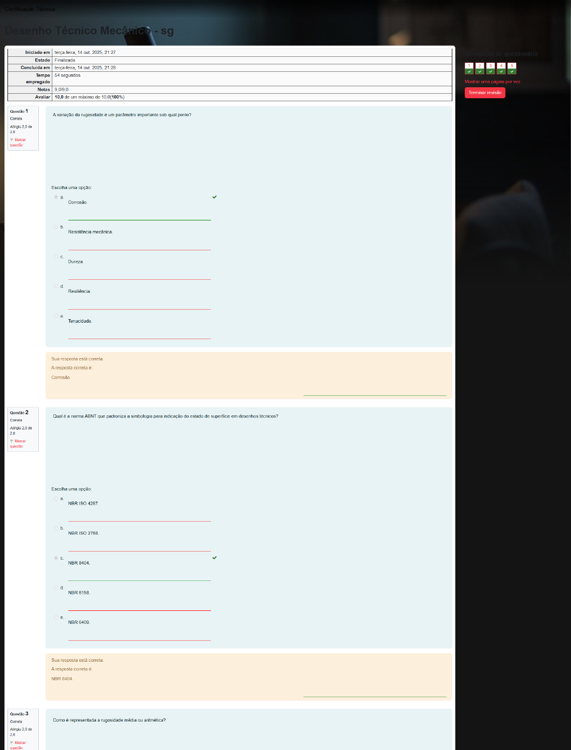 Certificação Técnica Desenho Técnico Mecânico sg Iniciado em terça-feira, 14 2025, 21:27 do questionário Estado Finalizada Concluída em terça-feira, 14 out. 2025, 21:28 2 3 5 Tempo 54 segundos empregado Mostrar uma página por vez Notas 9,0/9,0 Terminar revisão Avaliar 10,0 de um máximo de 10,0(100%) Questão 1 A variação da rugosidade é um parâmetro importante sob qual ponto? Correto Atingiu 2,0 de 2.0 P Marcar questão Escolha uma opção: a b. Resistência C. Dureza d. Resiliência e. Sua resposta está correta A resposta correta Questão 2 Qual é a norma ABNT que padroniza a simbologia para indicação do estado de superficie em desenhos técnicos? Correto Atingiu de P Marcar questão Escolha uma opção: a NBR ISO 4287 b. NBR ISO C. NBR d. NBR e. NBR 6409 Sua resposta está correta A resposta correta NBR Questão 3 Correto Como é representada a rugosidade média ou aritmética? Atingiu 2.0 de 2.0 P Marcar questãoEscolha uma opção: Rt Rz C. Ra Rq e. Rp Sua resposta está correta A resposta correta é: Ra Questão 4 Qual é tipo de superfície em que a rugosidade é bem representada? Correto Atingiu 2,0 de 2.0 Marcar questão Escolha uma opção: a. virtual b. real C. de d. efetiva e Superficie geométrica. Sua resposta está A resposta correta é: efetiva Questão 5 Qual valor padrão normalmente encontrado para operação em Correto Atingiu 1,0 de 1,0 Marcar questão Escolha uma opção: Cut-off de 1,5 mm e 4 b. Cut-off de 0,8 mm e 5 C. Cut-off de 0,8 mm e 10 d. Cut-off de 1 mm e 5 amostras. e. Cut-off de mm e 4 amostras. Sua resposta está A resposta correta é: Cut-off de 0.8 mm e 5 Terminar revisão