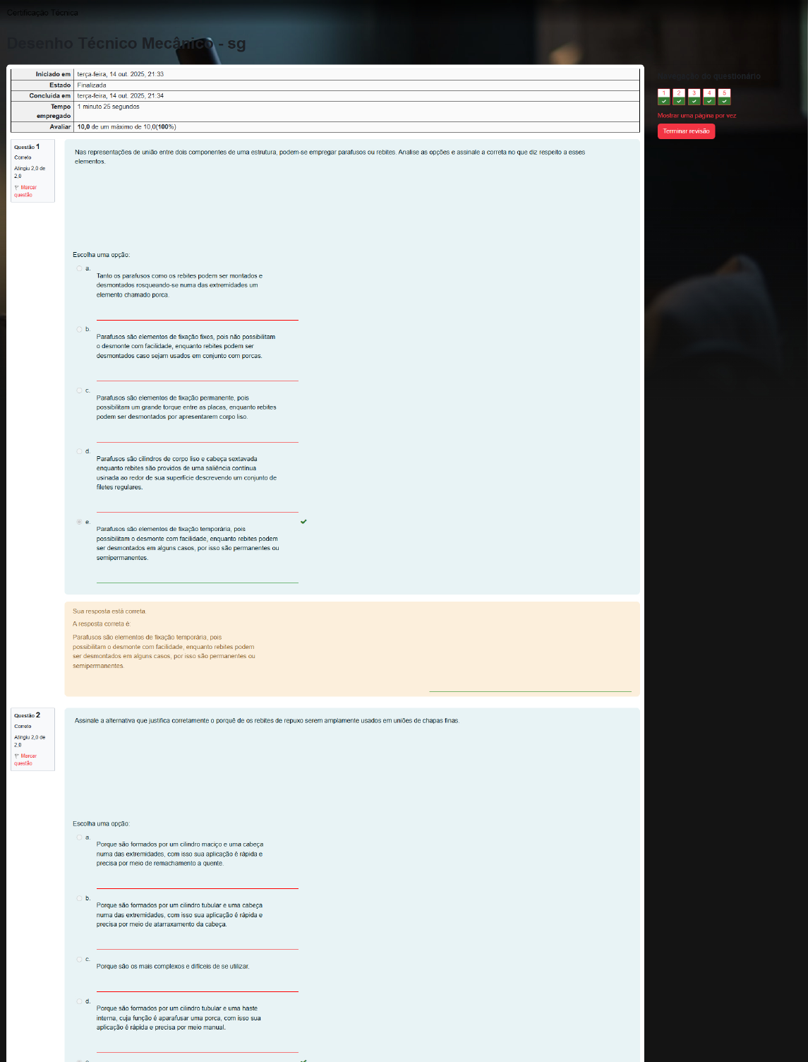 Certificação Técnica Desenho Técnico Mecânico sg Iniciado em terça-feira, 14 out. 2025, 21:33 do questionário Estado Finalizada Concluída em terça-feira, 14 2025, 21:34 2 3 5 Tempo 1 minuto 25 segundos empregado Mostrar uma página por vez Avaliar 10,0 de um máximo de 10,0(100%) Terminar revisão Questão 1 Nas representações de união entre dois componentes de uma estrutura, podem-se empregar parafusos ou rebites. Analise as opções e assinale a correta no que diz respeito a esses Correto Atingiu de 2.0 Marcar questão Escolha uma opção: a. Tanto os parafusos como rebites podem ser montados e desmontados rosqueando-se numa das extremidades um elemento chamado porca. b. Parafusos são elementos de fixação fixos, pois não possibilitam desmonte com facilidade, enquanto rebites podem ser desmontados caso sejam usados em conjunto com porcas. C. Parafusos são elementos de fixação permanente, pois possibilitam um grande torque entre as placas, enquanto rebites podem ser desmontados por apresentarem corpo Parafusos são cilindros de corpo liso e cabeça sextavada enquanto rebites são providos de uma saliência contínua usinada ao redor de sua superfície descrevendo um conjunto de filetes regulares. e. Parafusos são elementos de fixação temporária, pois possibilitam desmonte com facilidade, enquanto rebites podem ser desmontados em alguns casos, por isso são permanentes ou semipermanentes. Sua resposta está correta A resposta correta é Parafusos são elementos de fixação temporária, pois possibilitam desmonte com facilidade, enquanto rebites podem ser desmontados em alguns casos, por isso são permanentes ou semipermanentes Questão 2 Assinale a alternativa que justifica corretamente porquê de os rebites de repuxo serem amplamente usados em uniões de chapas Correto Atingiu de 2.0 P Marcar questão Escolha uma opção: a. Porque são formados por um cilindro maciço e uma cabeça numa das extremidades, com isso sua aplicação é rápida e precisa por meio de remachamento a quente. b. Porque são formados por um cilindro tubular e uma cabeça numa das extremidades, com isso sua aplicação é rápida e precisa por meio de atarraxamento da cabeça. C. Porque são mais complexos e difíceis de se d. Porque são formados por um cilindro tubular e uma haste interna, cuja função é aparafusar uma porca, com isso sua aplicação é rápida e precisa por meio manual.Porque são formados de um cilindro tubular e uma haste interna, cuja função é remachar uma das extremidades quando for tracionada, com isso sua aplicação é rápida e precisa por meio de um aplicador específico. Sua resposta está correta. A resposta correta é: Porque são formados de um cilindro tubular e uma haste interna, cuja função é remachar uma das extremidades quando for tracionada, com isso sua aplicação é rápida e precisa por meio de um aplicador específico. Questão 3 Quanto às características dimensionais para construção de roscas, é possível usar tabelas para obter valores referentes Correto Atingiu 2.0 de P Marcar questão Escolha uma opção: a. diâmetro externo, diâmetro interno e diâmetro de flanco b. diâmetro externo, diâmetro interno e material C. passo, ângulo do filete e distância da cabeça. d. diâmetro primitivo, comprimento do corpo e altura do e. passo, diâmetro externo e comprimento total Sua resposta está A resposta correta é: diâmetro externo, diâmetro interno e diâmetro de flanco Questão 4 Rosca é principal elemento de um parafuso, mas podem ocorrer aplicações em eixos como os fusos de máquinas. Marque a alternativa em que estão representadas respectivamente: uma rosca à Correto esquerda, uma rosca whitworth e um perfil dente de serra. Atingiu de Escolha uma opção: P Marcar a questão a) b) c) b. a) b) c) C. a) b) c) a) b) c) e. a) b) c)Sua resposta está a) b) c) A resposta correta é: Questão 5 GRUPO Correto Atingiu de GRUPO 2.0 GRUPO P Marcar questão GRUPO 4 GRUPO GRUPO GRUPO Existem muitos tipos de parafuso. Assinale a opção que identifica corretamente os tipos de parafuso de acordo com a classificação de cabeça. Escolha uma opção: a Nos grupos 2 e3 só estão representados parafusos de cabeça b. Os grupos 4 e 5 não têm nenhum parafuso de cabeça quadrada. C. Somente grupos 1 e6 não representam nenhum parafuso de cabeça d. Os grupos 6 e 7 correspondem a parafusos de cabeça sextavada e com fendas respectivamente. e. Os grupos 1 e 5 não possuem parafusos de cabeça com formato circular. Sua resposta está A resposta correta Os grupos 6 e 7 correspondem a parafusos de cabeça sextavada e com fendas respectivamente. Terminar revisão