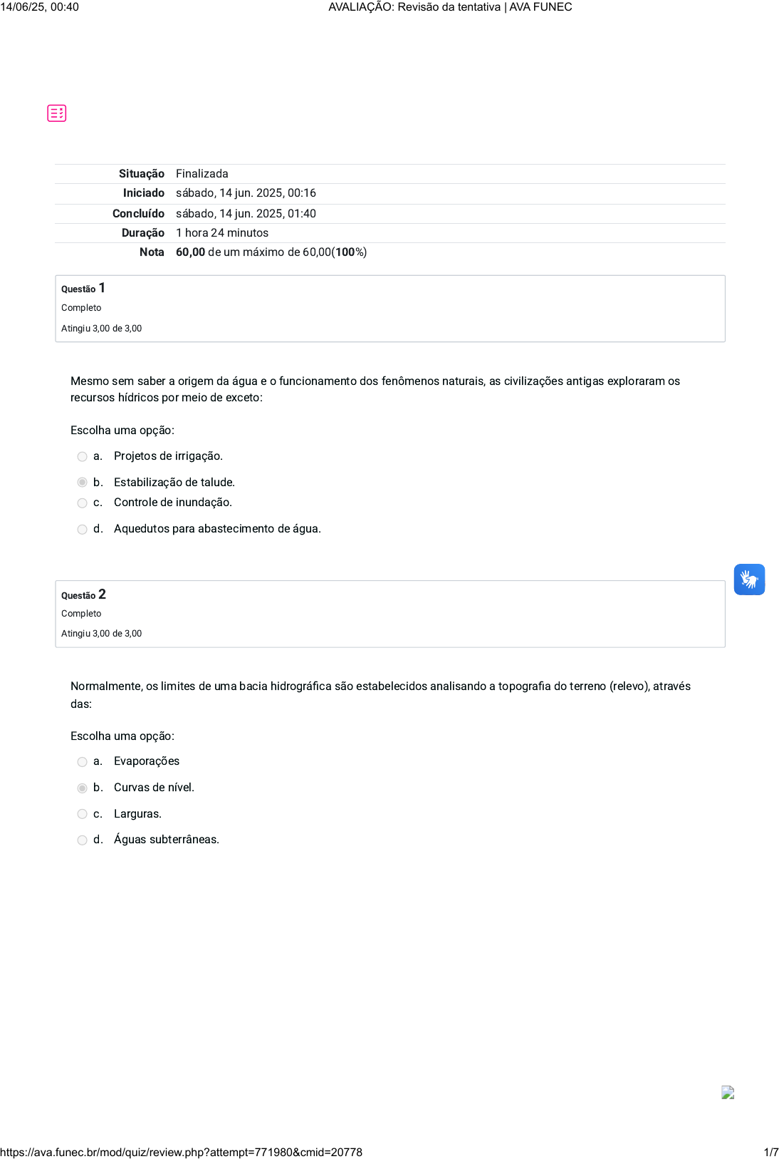 Situação Finalizada Iniciado sábado, 14 jun. 2025, 00:16 Concluído sábado, 14 jun. 2025, 01:40 Duração 1 hora 24 minutos Nota 60,00 de um máximo de 60,00(100%) Questão 1 Completo Atingiu 3,00 de 3,00 Questão 2 Completo Atingiu 3,00 de 3,00 Mesmo sem saber a origem da água e o funcionamento dos fenômenos naturais, as civilizações antigas exploraram os recursos hídricos por meio de exceto: Escolha uma opção: a. Projetos de irrigação. b. Estabilização de talude. c. Controle de inundação. d. Aquedutos para abastecimento de água. Normalmente, os limites de uma bacia hidrográfica são estabelecidos analisando a topografia do terreno (relevo), através das: Escolha uma opção: a. Evaporações b. Curvas de nível. c. Larguras. d. Águas subterrâneas. 14/06/25, 00:40 AVALIAÇÃO: Revisão da tentativa | AVA FUNEC https://ava.funec.br/mod/quiz/review.php?attempt=771980&cmid=20778 1/7 Questão 3 Completo Atingiu 3,00 de 3,00 Questão 4 Completo Atingiu 3,00 de 3,00 Questão 5 Completo Atingiu 3,00 de 3,00 Assinale a alternativa correta cujos fatores contribuem para que uma bacia apresente uma maior tendência a picos de cheias: Sendo: Kc - coeficiente de compacidade; Kf - fator de forma; Rb - Ordem dos cursos d’água e razão de bifurcação; Tc - tempo de concentração; Dd - densidade de drenagem Escolha uma opção: a. >área; Kf; >Rb; Dd; b. >área; >Kc; Rb; Dd; c. Kf; Tc; Kf;