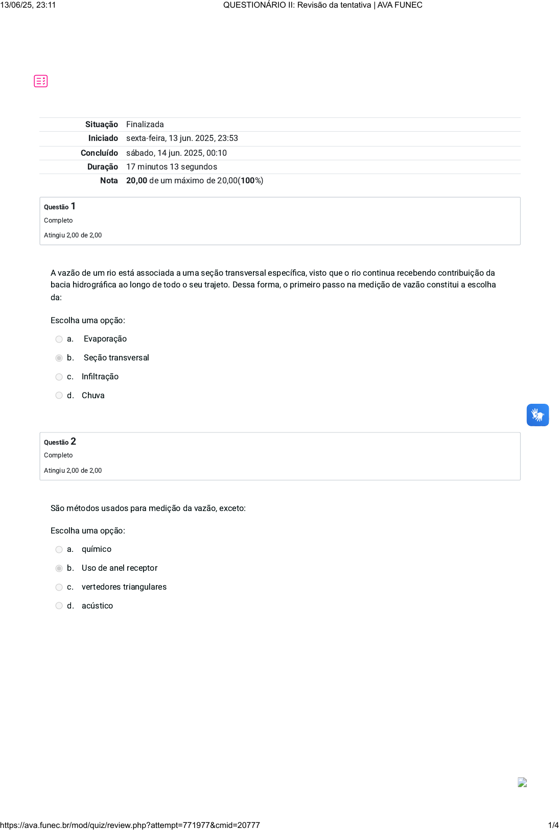 Situação Finalizada Iniciado sexta-feira, 13 jun. 2025, 23:53 Concluído sábado, 14 jun. 2025, 00:10 Duração 17 minutos 13 segundos Nota 20,00 de um máximo de 20,00(100%) Questão 1 Completo Atingiu 2,00 de 2,00 Questão 2 Completo Atingiu 2,00 de 2,00 A vazão de um rio está associada a uma seção transversal específica, visto que o rio continua recebendo contribuição da bacia hidrográfica ao longo de todo o seu trajeto. Dessa forma, o primeiro passo na medição de vazão constitui a escolha da: Escolha uma opção: a. Evaporação b. Seção transversal c. Infiltração d. Chuva São métodos usados para medição da vazão, exceto: Escolha uma opção: a. químico b. Uso de anel receptor c. vertedores triangulares d. acústico 13/06/25, 23:11 QUESTIONÁRIO II: Revisão da tentativa | AVA FUNEC https://ava.funec.br/mod/quiz/review.php?attempt=771977&cmid=20777 1/4 Questão 3 Completo Atingiu 2,00 de 2,00 Questão 4 Completo Atingiu 2,00 de 2,00 Questão 5 Completo Atingiu 2,00 de 2,00 O método químico geralmente é adotado para rios de pouca profundidade e com leito rochoso, onde o uso de molinete é dificultado, e consiste em injetar uma substância concentrada e medir a concentração em um certo ponto: Escolha uma opção: a. A jusante. b. Evaporado. c. Precipitado. d. A montante. É possível calcular usando o método de molinete, exceto: Escolha uma opção: a. vazão b. área da seção transversal do curso d’água c. profundidade d. velocidade do escoamento em diversos pontos da seção do curso d’água Qual o método mais comum de medição com molinete? Escolha uma opção: a. A vau. b. Com teleférico. c. Sobre pontes. d. Com barco fixo 13/06/25, 23:11 QUESTIONÁRIO II: Revisão da tentativa | AVA FUNEC https://ava.funec.br/mod/quiz/review.php?attempt=771977&cmid=20777 2/4 Questão 6 Completo Atingiu 2,00 de 2,00 Questão 7 Completo Atingiu 2,00 de 2,00 Questão 8 Completo Atingiu 2,00 de 2,00 Em alguns casos a consideração de uma relação única entre o nível da água e a vazão em uma seção transversal do rio é aceitável, constituindo o que se chama de: Escolha uma opção: a. Vazão. b. Evaporação. c. Curva-chave. d. Flutuador. Para a caracterização do regime fluvial de um curso d’água é de fundamental importância por ocasião da escolha da seção se observar os seguintes fatores: I. Natureza do leito, sendo preferível leito rochoso que não sofre alterações; II. Margens bem definidas e livres de pontos singulares que possam perturbar o escoamento; III. Seção localizada em um trecho mais ou menos retilíneo; IV. Obras hidráulicas existentes; Assinale a alternativa correta Escolha uma opção: a. Somente as alternativas II e III são verdadeiras b. Somente as alternativas I e II são verdadeiras c. Somente as alternativas III e IV são verdadeiras d. Todas as alternativas são verdadeiras A maneira mais simples para medir o nível de um curso d’água é colocar uma régua vertical na água e observar sua marcação, cuja leitura de cotas, em geral, a precisão destas observações é da ordem de: Escolha uma opção: a. milímetros b. decímetro c. metros d. centímetros 13/06/25, 23:11 QUESTIONÁRIO II: Revisão da tentativa | AVA FUNEC https://ava.funec.br/mod/quiz/review.php?attempt=771977&cmid=20777 3/4 Questão 9 Completo Atingiu 2,00 de 2,00 Questão 10 Completo Atingiu 2,00 de 2,00 Esse método consiste simplesmente em determinar a velocidade de deslocamento de um objeto flutuante, medindo o tempo necessário para que ele percorra um trecho de rio de comprimento conhecido. Este é o método: Escolha uma opção: a. Molinete. b. Com flutuadores. c. A vau. d. Acústico São placas de metal inoxidável ou de madeira colocadas de maneira que o elemento inferior fique na água mesmo em caso de estiagem excepcional. A essa definição dá-se o nome de: Escolha uma opção: a. Régua plástica. b. Flutuador. c. Limnímetro. d. Limnígrafo. 13/06/25, 23:11 QUESTIONÁRIO II: Revisão da tentativa | AVA FUNEC https://ava.funec.br/mod/quiz/review.php?attempt=771977&cmid=20777 4/4