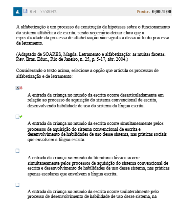 4. 5558032 Pontos: A alfabetização um processo de construção de hipoteses sobre 0 funcionamento do sistema alfabetico de escrita, sendo necessário deixar claro que a especificidade do processo de alfabetização não significa dissocia-lo do processo de (Adaptado de SOARES, Magda. Letramento e alfabetização: as muitas facetas. Rev. Bras. Educ., Rio de Janeiro, n. 25, p. 5-17, abr. 2004.) Considerando texto acima, selecione a opção que articula os processos de alfabetização e de letramento: A entrada da criança no mundo da escrita ocorre desarticuladamente em relação processo de aquisição do sistema convencional de escrita, desenvolvendo habilidade de uso do sistema da lingua escrita. A entrada da criança no mundo da escrita ocorre simultaneamente pelos processos de aquisição do sistema convencional de escrita e desenvolvimento de habilidades de uso desse sistema, nas sociais que envolvem a lingua A entrada da criança no mundo da literatura classica ocorre simultaneamente pelos processos de aquisição do sistema convencional de escrita e desenvolvimento de habilidades de uso desse sistema, nas apenas escolares que envolvem a lingua A entrada da criança no mundo da escrita ocorre unilateralmente pelo processo de desenvolvimento de habilidade de uso desse sistema, na