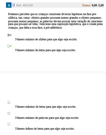 3. 6023240 Pontos: 0,00/1,00 Podemos perceber que as crianças constroem diversas hipoteses na fase silabica, tais como: objetos grandes possuem nomes grandes e objetos pequenos possuem nomes pequenos; as palavras devem possuir uma variação de caracteres para que possam ser lidas. Selecione uma suposição hipotetica, que e criada pelas crianças, que falta a essa fase, a Numero minimo de silabas para que algo seja escrito. Numero minimo de letras para que algo seja Numero maximo de letras para que algo seja escrito. Numero de palavras para que algo seja escrito. Numero infimo de letras para que algo seja escrito.