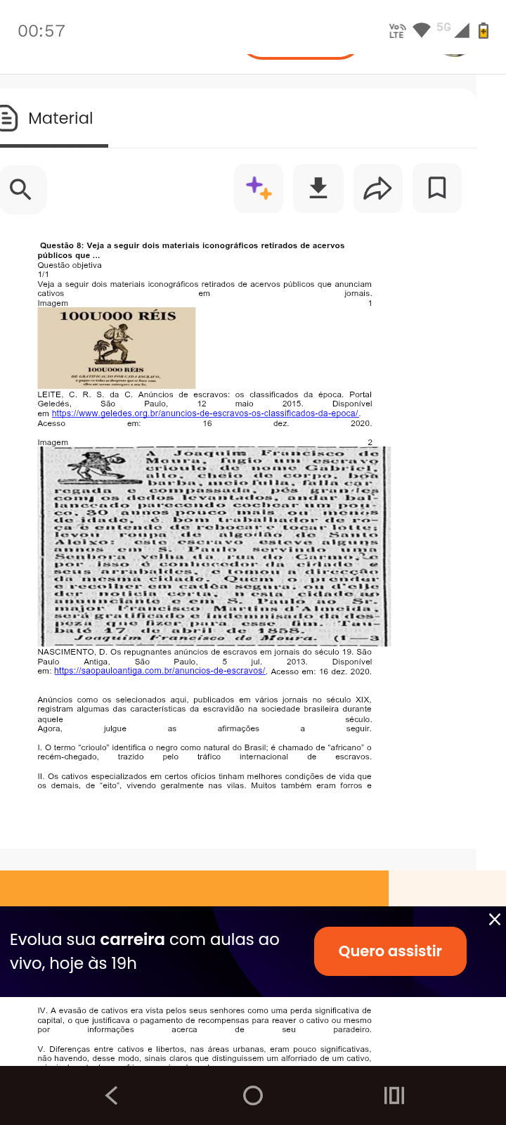 00:57 5G LTE Material Questão 8: Veja a seguir dois materiais iconograficos retirados de acervos públicos que Questão objetiva 1/1 Veja a seguir dois materiais iconográficos retirados de acervos públicos que anunciam cativos em jornais. Imagem 1 100U000 RÉIS 100U000 REIS C. R. S. da C. de escravos: os classificados da época. Portal São Paulo, 12 maio 2015. em Acesso em: 16 dez. 2020. Imagem 2 Joaquim Francisco de Moura, fugio crioulo de de falla regada dedos bal- parecendo um 30 annos mais menos de idade bom trabalhador de ro- entende de rebocare tocar lotte: levou de de Santo Aleixo: alguns Paulo servindo Senbora velha do por da seus mesma cidade Quem der noticia esta cidade S. Paulo no Sr. major tificado da peza que fizer 17 abril de 1858. Joaquim Francisco do Moura. D. Os repugnantes de escravos em jornais do século 19. Paulo Antiga, São Paulo, 5 jul. 2013. em: Acesso em: 16 dez. 2020. Anúncios como os selecionados aqui, publicados em jornais no século XIX, registram algumas das características da escravidão na sociedade brasileira durante aquele século. Agora, julgue as afirmações a seguir. I. O termo "crioulo" identifica negro como natural do chamado de "africano" trazido pelo internacional de II. Os cativos especializados em certos oficios tinham melhores condições de vida que os demais, de "eito", vivendo geralmente nas vilas. Muitos eram forros e X Evolua sua carreira com aulas ao Quero assistir vivo, hoje às 19h V. A evasão de cativos era vista pelos seus senhores como uma perda significativa de capital, que justificava pagamento de recompensas para reaver cativo ou mesmo por informações acerca de seu paradeiro. V. Diferenças entre cativos e libertos, nas areas urbanas, eram pouco significativas, não havendo, desse modo, sinais claros que distinguissem um alforriado de um cativo,