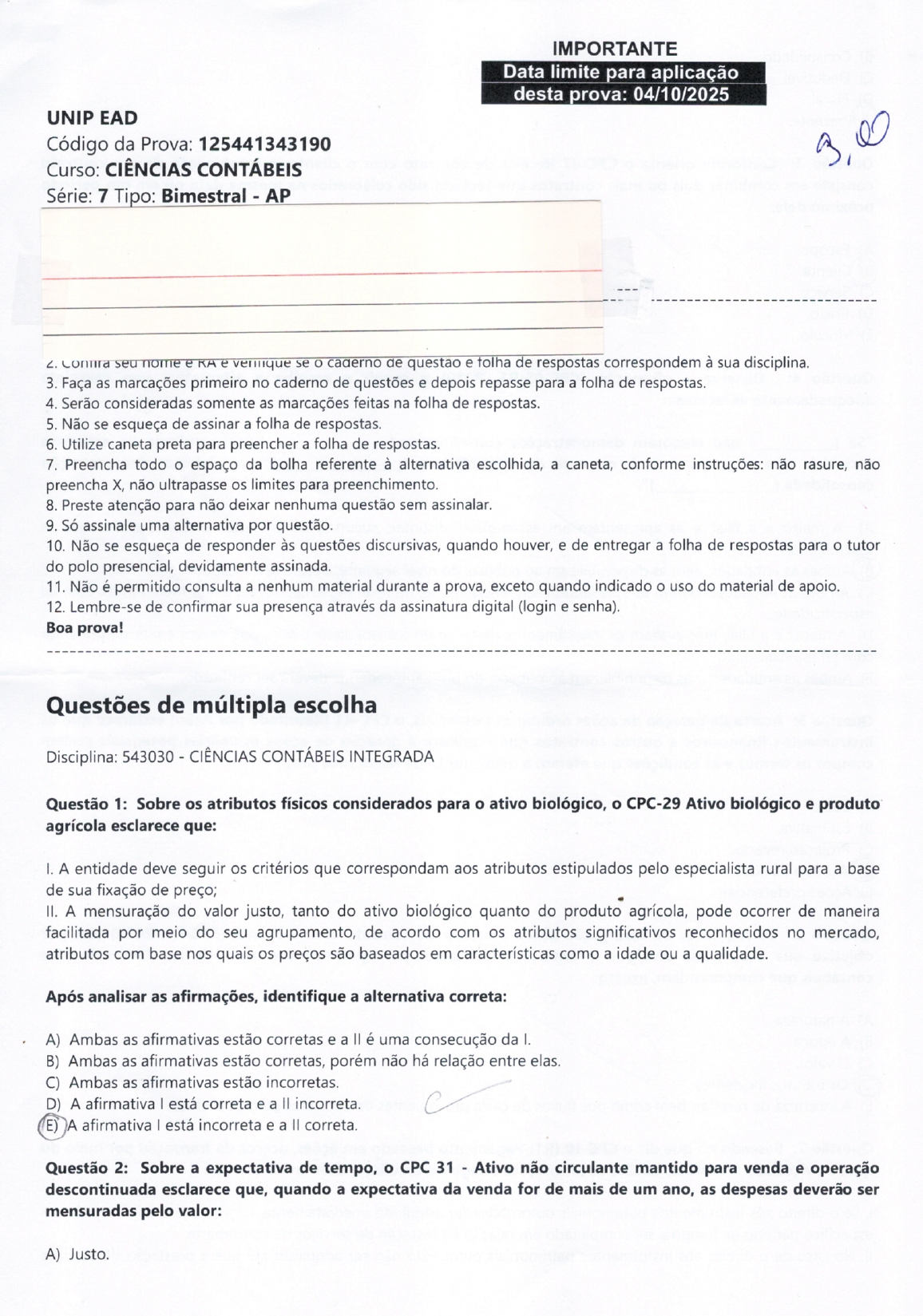 IMPORTANTE Data limite para aplicação desta prova: 04/10/2025 UNIP EAD Código da Prova: 125441343190 Curso: CIÊNCIAS CONTÁBEIS Série: 7 Tipo: Bimestral AP L. seu nome e KA e se O caderno de questão e de respostas correspondem à sua disciplina. 3. Faça as marcações primeiro no caderno de questões e depois repasse para a folha de respostas. 4. Serão consideradas somente as marcações feitas na folha de respostas. 5. Não se esqueça de assinar a folha de respostas. 6. Utilize caneta preta para preencher a folha de respostas. 7. Preencha todo espaço da bolha referente à alternativa escolhida, a caneta, conforme instruções: não rasure, não preencha X, não ultrapasse os limites para preenchimento. 8. Preste atenção para não deixar nenhuma questão sem assinalar. 9. Só assinale uma alternativa por questão. 10. Não se esqueça de responder às questões discursivas, quando houver, e de entregar a folha de respostas para tutor do polo presencial, devidamente assinada. 11. Não é permitido consulta a nenhum material durante a prova, exceto quando indicado o uso do material de apoio. 12. Lembre-se de confirmar sua presença através da assinatura digital (login e senha). Boa prova! Questões de múltipla escolha Disciplina: 543030 CIÊNCIAS CONTÁBEIS INTEGRADA Questão 1: Sobre os atributos físicos considerados para ativo biológico, CPC-29 Ativo biológico e produto agrícola esclarece que: I. A entidade deve seguir os critérios que correspondam aos atributos estipulados pelo especialista rural para a base de sua fixação de preço; II. A mensuração do valor justo, tanto do ativo biológico quanto do produto agrícola, pode ocorrer de maneira facilitada por meio do seu agrupamento, de acordo com os atributos significativos reconhecidos no mercado, atributos com base nos quais os preços são baseados em características como a idade ou a qualidade. Após analisar as afirmações, identifique a alternativa correta: A) Ambas as afirmativas estão corretas e a é uma consecução da I. B) Ambas as afirmativas estão corretas, porém não há relação entre elas. C) Ambas as afirmativas estão incorretas. D) A afirmativa I está correta e a incorreta. E) A afirmativa I está incorreta e a correta. Questão 2: Sobre a expectativa de tempo, CPC 31 Ativo não circulante mantido para venda e operação descontinuada esclarece que, quando a expectativa da venda for de mais de um ano, as despesas deverão ser mensuradas pelo valor: A) Justo.B) Consolidado. C) Dedutível. D) Fiscal. E) Presente. Questão 3: Conforme orienta CPC-47 Receita de contrato com cliente, a combinação de um contrato consiste em combinar dois ou mais contratos que tenham sido celebrados na mesma data ou em um período próximo dele: A) Escopo. B) Cliente. C) Serviço. D) Prazo. E) Vínculo. Questão 4: Observe a afirmação (CPC-05-R1, 2010) a seguir e escolha a alternativa que complete adequadamente as lacunas: "Se ( ) não elaboram demonstrações consolidadas ( ), na observância da estrutura societária que grupo possui, nome da controladora ( ) que elaborar demonstração consolidada ( )". A) A matriz e a filial; e as apresentam em assembleias distintas; sucursal; deverá estar presente em ambas as assembleias. B) Ambas as entidades; nem as disponibilizam ao público; do nível seguinte; deverá ser divulgado. C) Ambas as entidades; porém as apresentam sequencialmente; do nível seguinte; deverá emitir memorando com tal especificidade. D) A matriz e a filial; mas avaliam os investimentos deste modo (consolidados); principal; deverá emitir memorando com tal especificidade. E) Ambas as entidades; e as disponibilizam ao público; do nível antecedente; deverá ser retificado. Questão 5: Acerca da geração de ações ordinárias potenciais, CPC-41 (Resultado por Ação) esclarece que os instrumentos financeiros e outros contratos que implicam a geração de ações ordinárias potenciais podem compor os termos e as condições que afetam a mensuração de resultados por: A) Lucro. B) Estimativa. C) Projeção reversa. D) Ações e diluídos. E) Ações preferenciais. Questão 6: Os requisitos de divulgação sobre a receita de contrato com cliente (CPC-47, 2016) têm por objetivo que a entidade divulgue informações suficientes para permitir aos usuários das demonstrações contábeis que compreendam, exceto: A) A natureza. B) A época. C) O valor. D Os tributos incidentes. E) A incerteza de receitas, bem como dos fluxos de caixa provenientes de contratos com os clientes. Questão 7: Baseado no que diz CPC 10 (R1) Pagamento baseado em ações, acerca da transação por meio do qual serviços são recebidos, analise as afirmações a seguir e escolha a alternativa correta: I. Se direito aos instrumentos patrimoniais outorgados for adquirido imediatamente, não haverá a exigência de um específico período de tempo a ser completado em relação à prestação de serviços da contraparte; II. No caso de o direito aos instrumentos patrimoniais outorgado não ser adquirido até que a prestação de serviçosocorra por completo em um determinado espaço de tempo, a entidade deverá presumir que isso se dará no futuro; e III. Contabilizar à medida que os serviços forem sendo prestados, ao longo do período de aquisição do direito com aumento de patrimônio líquido correspondente. A) Todas as afirmações são verdadeiras, e a II e a III são sequências da I. B) Apenas a afirmação I é verdadeira. C) Todas as afirmações são falsas. D) As afirmações e III são verdadeiras, e a II é consequência da I. E) Apenas a afirmação III é verdadeira. Questão 8: Pronunciamento Técnico CPC-24 Evento Subsequente apresenta as diretrizes pertinentes e a maneira adequada quanto à análise acerca do que é considerado como evento subsequente, e quais os atendimentos necessários para cada caso, especificamente, com a realização de ajustes. Nesse sentido, observe as proposições apresentada