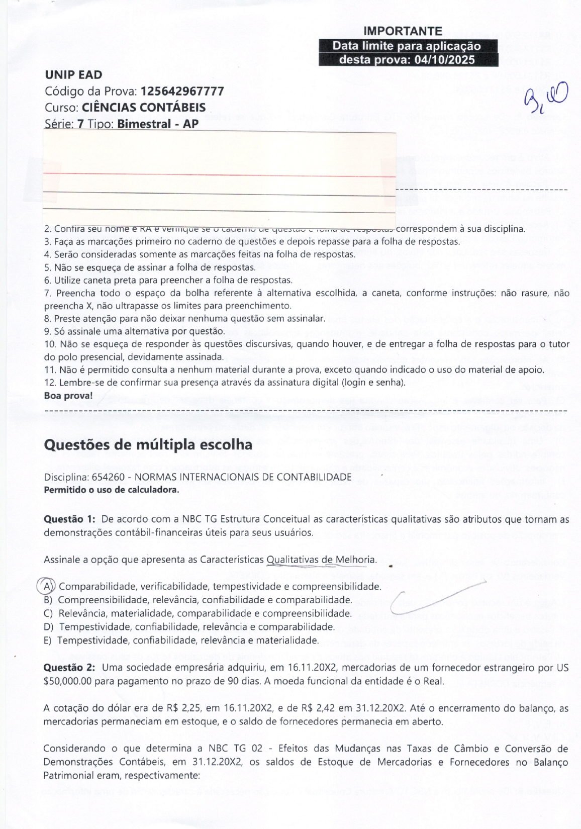 IMPORTANTE Data limite para aplicação desta prova: 04/10/2025 UNIP EAD Código da Prova: 125642967777 Curso: CIÊNCIAS CONTÁBEIS Série: 7 Tipo: Bimestral AP 2. Contira seu nome e KA e correspondem à sua disciplina. 3. Faça as marcações primeiro no caderno de questões e depois repasse para a folha de respostas. 4. Serão consideradas somente as marcações feitas na folha de respostas. 5. Não se esqueça de assinar a folha de respostas. 6. Utilize caneta preta para preencher a folha de respostas. 7. Preencha todo espaço da bolha referente à alternativa escolhida, a caneta, conforme instruções: não rasure, não preencha X, não ultrapasse os limites para preenchimento. 8. Preste atenção para não deixar nenhuma questão sem assinalar. 9. Só assinale uma alternativa por questão. 10. Não se esqueça de responder às questões discursivas, quando houver, e de entregar a folha de respostas para tutor do polo presencial, devidamente assinada. 11. Não é permitido consulta a nenhum material durante a prova, exceto quando indicado o uso do material de apoio. 12. Lembre-se de confirmar sua presença através da assinatura digital (login e senha). Boa prova! Questões de múltipla escolha Disciplina: 654260 NORMAS INTERNACIONAIS DE CONTABILIDADE Permitido uso de calculadora. Questão 1: De acordo com a NBC TG Estrutura Conceitual as características qualitativas são atributos que tornam as demonstrações contábil-financeiras úteis para seus usuários. Assinale a opção que apresenta as Características Qualitativas de Melhoria. A Comparabilidade, verificabilidade, tempestividade e compreensibilidade. B) Compreensibilidade, relevância, confiabilidade e comparabilidade. C) Relevância, materialidade, comparabilidade e compreensibilidade. D) Tempestividade, confiabilidade, relevância e comparabilidade. E) Tempestividade, confiabilidade, relevância e materialidade. Questão 2: Uma sociedade empresária adquiriu, em 16.11.20X2, mercadorias de um fornecedor estrangeiro por US $50,000.00 para pagamento no prazo de 90 dias. A moeda funcional da entidade é Real. A cotação do dólar era de R$ 2,25, em 16.11.20X2, e de 2,42 em 31.12.20X2. Até encerramento do balanço, as mercadorias permaneciam em estoque, e saldo de fornecedores permanecia em aberto. Considerando que determina a NBC TG 02 Efeitos das Mudanças nas Taxas de Câmbio e Conversão de Demonstrações Contábeis, em 31.12.20X2, os saldos de Estoque de Mercadorias e Fornecedores no Balanço Patrimonial eram, respectivamente:A) R$112.500,00 e R$112.500,00. B) R$112.500,00 e R$121.000,00. C) R$121.000,00 e R$112.500,00. D) R$121.000,00 e R$121.000,00. E) R$0,00 e R$121.000,00. Questão 3: De acordo com a NBC TG Estrutura Conceitual, no que se refere à posição patrimonial e financeira, assinale a opção INCORRETA A) Ativo é um recurso controlado pela entidade como resultado de eventos passados e do qual se espera que fluam futuros benefícios econômicos para a entidade. B) Passivo é uma obrigação presente da entidade, derivada de eventos passados, cuja liquidação se espera que resulte na saída de recursos da própria entidade capazes de gerar benefícios econômicos. C) Patrimônio Líquido é interesse residual nos ativos da entidade depois de deduzidos todos os seus passivos. D) Receitas são aumentos nos benefícios econômicos durante período contábil que resultam em diminuições do Patrimônio Líquido e que estão relacionados com a contribuição dos detentores dos instrumentos patrimoniais. E) Despesas são reduções nos ativos, ou aumentos nos passivos, que resultam em reduções no patrimônio líquido, exceto aqueles referentes a distribuições aos detentores de direitos sobre patrimônio. Questão 4: Em relação às características qualitativas das informações contábeis, assinale a opção INCORRETA. A) A mensuração e a apresentação dos efeitos financeiros de transações semelhantes e outros eventos devem ser feitas de modo consistente pela entidade, e mudanças em políticas contábeis somente são admitidas quando requeridas pela introdução de normas contábeis aperfeiçoadas. B) As informações são relevantes quando podem influenciar as decisões econômicas dos usuários, ajudando-os a avaliar o impacto de eventos passados, presentes ou futuros ou confirmando ou corrigindo as suas avaliações anteriores. C) Para ser confiável, a informação contida nas demonstrações contábeis deve ser neutra, isto é, imparcial. As demonstrações contábeis não são neutras se, pela escolha ou apresentação da informação, elas induzirem a tomada de decisão ou julgamento específico, visando atingir um resultado ou desfecho predeterminado. D) Uma qualidade essencial das informações apresentadas nas demonstrações contábeis é que elas sejam compreendidas pelos usuários. Para tanto, presume-se que os usuários tenham um conhecimento razoável dos negócios, atividades econômicas e contabilidade e a disposição de estudar as informações com razoável diligência. E) Informações financeiras são capazes de fazer diferença em decisões se tiverem valor preditivo ou valor confirmatório, ou ambos. Questão 5: De acordo com a NBC TG ESTRUTURA CONCEITUAL, os elementos diretamente relacionados com a mensuração da posição patrimonial e financeira são os ativos, os passivos e patrimônio líquido. Considerando-se essa afirmativa, julgue os itens relativos aos ativos, e ao patrimônio líquido como Verdadeiros (V) ou Falsos (F e, em seguida, assinale a alternativa CORRETA. I. Ativo é um recurso controlado pela entidade como resultado de eventos passados e do qual se espera que fluam futuros benefícios econômicos para a entidade. II. Passivo é uma obrigação presente da entidade, derivada de eventos passados, cuja liquidação se espera que resulte na saída de recursos da entidade capazes de gerar benefícios econômicos. III. Patrimônio Líquido é interesse residua