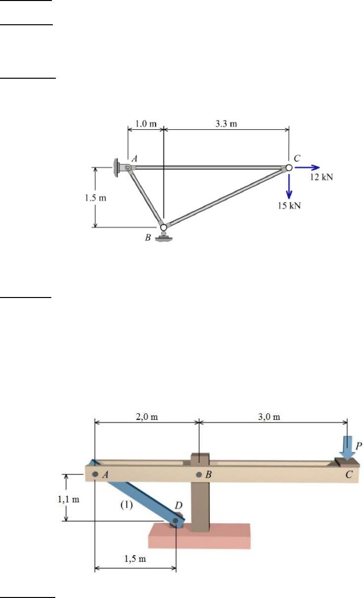 <p>1ª Lista de exercícios de Resistência dos Materiais</p><p>Exercício 1) Demonstre por que o coeficiente de Poisson varia de 0 a 0,5.</p><p>Exercício 2) Considere um elemento orientado a 45° sobre a face de uma barra submetida à</p><p>torção. Demonstre e explique por que a tensão normal sobre as faces desse elemento a 45° é igual</p><p>à tensão de cisalhamento máxima.</p><p>Exercício 3) Uma treliça simples é carregada conforme a imagem. Todos os seus membros são</p><p>tubos que apresentam um diâmetro externo de 60 mm e uma espessura de 4 mm. Determine a</p><p>tensão normal em cada membro da treliça.</p><p>Resp.: AB = 84,5 MPa; AC = 63,9 MPa e BC = 51,5 MPa</p><p>Exercício 4) Após a carga P ser aplicada no ponto C da estrutura abaixo, uma deformação normal</p><p>=+555 m/m foi medida na direção longitudinal do elemento 1. A área da seção transversal do</p><p>elemento 1 é de 387 mm², seu módulo de Elasticidade é E1 = 200 GPa e sua tensão de escoamento</p><p>é de 248 MPa. a) Determine a força axial no membro 1, a carga aplicada P, e a força resultante</p><p>no pino B. b) Considerando que a tensão de ruptura no cisalhamento para os pinos seja de 372</p><p>MPa, Determine o diâmetro mínimo para o pino em B se um fator de segurança igual a 2,5 com</p><p>relação à tensão de ruptura no cisalhamento seja requerido. c) Calcule o fator de segurança para</p><p>o membro 1 com relação à sua tensão de escoamento.</p><p>Exercício 5) A estrutura rígida ABD é suportada em B por uma haste de diâmetro igual a 35 mm,</p><p>e em A por um pino de 30 mm de diâmetro, em cisalhamento simples. A haste é conectada em B</p><p>e em C por pinos de 24 mm de diâmetro em cisalhamento duplo. O material da haste (1) tem</p><p>tensão de escoamento igual a 250 MPa, e cada um dos pinos tem um limite de resistência ao</p><p>cisalhamento de 330 MPa. Uma carga concentrada P=50 kN é aplicada em D. Determine:</p><p>a) A tensão normal em (1). Resp.: 96,4 MPa.;</p><p>b) A tensão de cisalhamento nos pinos em A e B. Resp.: 174,6 MPa e 102,5 MPa;</p><p>c) O fator de segurança com relação ao escoamento para a haste (1). Resp.: 2,59.</p><p>O fator de segurança com relação ao limite de resistência para os pinos A e B. Resp.: 1,89 e 3,22.</p><p>Exercício 6) A coluna é construída de concreto de alta resistência (E = 29 GPa) e quatro barras</p><p>de reforço de aço (E = 200 GPa). Supondo que ela seja submetida a uma força axial de 800 kN,</p><p>determinar o diâmetro requerido de cada barra de modo que um quarto da carga seja suportada</p><p>pelo aço e três quartos pelo concreto.</p><p>Resp.: 36,6mm</p><p>Exercício 7) Um conjunto consiste de dois postes AB e CD feitos do material 1, que tem módulo</p><p>de Elasticidade E1 e área de seção transversal A1, e de um poste central EF feito do material 2,</p><p>que tem módulo de elasticidade E2 e área de seção transversal A2. Se os postes AB e CD tiverem</p><p>de ser substituídos por outros construídos com o material 2, determinar a área da seção transversal</p><p>necessária para os novos postes de modo que ambos conjuntos deformem a mesma quantidade</p><p>quando carregados. O apoio também é rígido.</p><p>Resp.: A1’=(E1/E2)*A1</p><p>Exercício 8) À temperatura ambiente de 20°C uma folga existe entre as extremidades das barras</p><p>mostradas. Decorrido um determinado tempo, a temperatura atingiu 140°C, determine: a) a tensão</p><p>normal na barra de alumínio, b) a mudança o comprimento da barra de alumínio.</p><p>Resp.: a)-116,2MPa; b)0,363mm</p><p>Exercício 9) Determine a variação em volume do segmento AB do comprimento de referência de</p><p>2 in, considerando a espessura de 1/16 in, 𝐸 = 29 × 106𝑝𝑠𝑖 e coeficiente de Poisson 0,3 a) pelo</p><p>cálculo da dilatação do material e b) pela subtração do volume original da parte AB de seu volume</p><p>final.</p><p>Resp.: a)16,55x10-6in3</p><p>b) 16,54x10-6in3</p><p>Exercício 10) Os torques mostrados são exercidos sobre as polias A, B e C. Sabendo-se que</p><p>ambos eixos são sólidos e feitos de um material com G = 39 GPa, determine o ângulo de rotação</p><p>entre a) A e B, b) A e C, além disso, INDIQUE o sentido do ângulo de rotação.</p><p>Resp.: a)8,87º; b)0,45º</p><p>Exercício 11) Os torques mostrados são exercidos sobre as polias A, B, C e D. Sabendo-se que o</p><p>eixo é sólido e de diâmetro constante ao longo de seu comprimento, plote o diagrama de torques</p><p>mostrando os torques internos nos segmentos (1), (2) e (3). Indique o sentido da rotação sofrida</p><p>por cada um destes segmentos. Se a tensão de cisalhamento admissível no eixo é de 80 MPa,</p><p>determine o diâmetro mínimo aceitável para o eixo. Resp.: 24,1 mm.</p><p>Exercício 12) Determine qual a carga uniforme máxima admissível w que pode ser suportada pela</p><p>viga de fibra de vidro, se b = 125 mm e a tensão de flexão admissível para o material é adm =</p><p>13 MPa. Desenhar os diagramas de força cortante e momento fletor.</p><p>Resp.: 2,61kN/m</p><p>Exercício 13) Determine a máxima força de cisalhamento V que o elemento pode sustentar se a</p><p>tensão de cisalhamento admissível for adm = 80 MPa.</p>