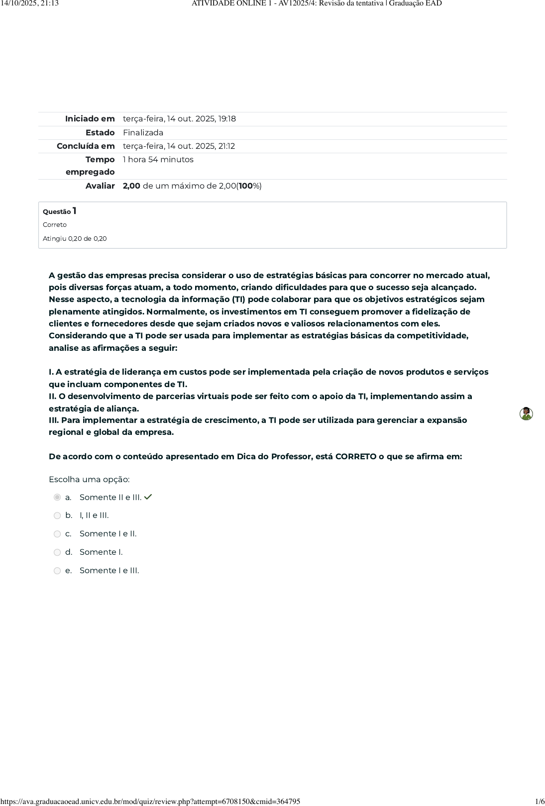 Iniciado em terça-feira, 14 out. 2025, 19:18 Estado Finalizada Concluída em terça-feira, 14 out. 2025, 21:12 Tempo empregado 1 hora 54 minutos Avaliar 2,00 de um máximo de 2,00(100%) Questão 1 Correto Atingiu 0,20 de 0,20 A gestão das empresas precisa considerar o uso de estratégias básicas para concorrer no mercado atual, pois diversas forças atuam, a todo momento, criando dificuldades para que o sucesso seja alcançado. Nesse aspecto, a tecnologia da informação (TI) pode colaborar para que os objetivos estratégicos sejam plenamente atingidos. Normalmente, os investimentos em TI conseguem promover a fidelização de clientes e fornecedores desde que sejam criados novos e valiosos relacionamentos com eles. Considerando que a TI pode ser usada para implementar as estratégias básicas da competitividade, analise as afirmações a seguir: I. A estratégia de liderança em custos pode ser implementada pela criação de novos produtos e serviços que incluam componentes de TI. II. O desenvolvimento de parcerias virtuais pode ser feito com o apoio da TI, implementando assim a estratégia de aliança. III. Para implementar a estratégia de crescimento, a TI pode ser utilizada para gerenciar a expansão regional e global da empresa. De acordo com o conteúdo apresentado em Dica do Professor, está CORRETO o que se afirma em: Escolha uma opção: a. Somente II e III. ✓ b. I, II e III. c. Somente I e II. d. Somente I. e. Somente I e III. 14/10/2025, 21:13 ATIVIDADE ONLINE 1 - AV12025/4: Revisão da tentativa | Graduação EAD https://ava.graduacaoead.unicv.edu.br/mod/quiz/review.php?attempt=6708150&cmid=364795 1/6 Questão 2 Correto Atingiu 0,20 de 0,20 Questão 3 Correto Atingiu 0,20 de 0,20 Com o avanço da tecnologia, as relações de consumo mudaram, bem como as formas e estratégias de comunicar e de as marcas se relacionarem com seus consumidores. Analise as afirmações abaixo e complete os espaços com as palavras adequadas: I - A publicidade, nos dias de hoje, ___________ uma via de mão única. II - Antes da Era Digital, o marketingsignificava apenas ____________. III - Antigamente, o consumidor apenas _______________ os conteúdos. Atualmente, ________________ é a principal característica dessa relação. IV - Devido ao grande aumento de demanda, a _____________ do consumidor atual é bem menor do que há alguns anos. Escolha uma opção: a. não é mais - publicidade - absorvia - a interação - fidelidade ✓ b. não é mais - relacionamento - recebia - a interação - felicidade c. ainda é - relacionamento - absorvia - o compartilhamento - satisfação d. não é mais - publicidade - absorvia - a interação - satisfação e. ainda é - publicidade - absorvia - a interação - fidelidade Você viu que houve uma mudança de foco dos 4P's para os 4C's no marketing e que estes últimos também sofreram uma espécie de atualização devido às mídias sociais? Qual das opções a seguir reflete melhor a filosofia atual do marketing? Marque a opção correta. Escolha uma opção: a. Vendas e foco no produto. b. Mensagens focadas no processo produtivo. c. Conexão e colaboração. ✓ d. Promoção e conveniência. e. Preço e mensagens focadas no processo produtivo. 14/10/2025, 21:13 ATIVIDADE ONLINE 1 - AV12025/4: Revisão da tentativa | Graduação EAD https://ava.graduacaoead.unicv.edu.br/mod/quiz/review.php?attempt=6708150&cmid=364795 2/6 Questão 4 Correto Atingiu 0,20 de 0,20 Questão 5 Correto Atingiu 0,20 de 0,20 O software básico abrange os sistemas que realizam tarefas fundamentais para o funcionamento do hardware e para a utilização dos recursos de máquina pelos softwares aplicativos e usuários. Com base nessa definição, selecione qual dos itens a seguir faz parte desse grupo. Escolha uma opção: a. Microsoft Windows. ✓ b. Corel Draw. c. Microsoft Project. d. Autodesk Map. e. Open Office. A Web, desde que foi criada, passou por uma grande evolução, desde sua finalidade até a forma de relação entre ela e o usuário. As mudanças no mundo digital causaram, inclusive, mudanças no perfil do consumidor e no que era antes visto e no que hoje é visto como necessidade de cada usuário. Analise as afirmações abaixo a respeito das etapas da evolução da Web e assinale a resposta certa: I - A Web 1.0 surgiu no final dos anos 90. II - A Web 3.0 é também chamada de Era Social da Web, devido à proporção tomada pelas redes sociais. III - A maior característica da Web 2.0 é a interação do usuário. IV - A Web 2.0 já apresenta grandes índices de velocidade e compartilhamento de informações. Escolha uma opção: a. Todas as afirmativas estão corretas. b. Apenas as afirmativas I e III estão corretas. c. Todas as afirmativas são falsas. d. Apenas a alternativa III está correta. ✓ e. Apenas as afirmativas I, II e III estão corretas. 14/10/2025, 21:13 ATIVIDADE ONLINE 1 - AV12025/4: Revisão da tentativa | Graduação EAD https://ava.graduacaoead.unicv.edu.br/mod/quiz/review.php?attempt=6708150&cmid=364795 3/6 Questão 6 Correto Atingiu 0,20 de 0,20 Questão 7 Correto Atingiu 0,20 de 0,20 Dados, informações e conhecimento são elementos importantíssimos no contexto da TI, de modo que estão presentes em todos os sistemas computacionais. Com relação a dados, informações e conhecimento, escolha a alternativa correta: Escolha uma opção: a. Conhecimento consiste em dados organizados para transmitir experiência, aprendizagem e prática aplicadas a um problema ou atividade organizacional. b. Seguindo uma lógica sequencial, a informação antecede o conhecimento, que, por conseguinte, é o elemento gerador dos dados. c. Informação se refere a dados que foram organizados para ter significado e valor para o receptor, que interpreta o significado e elabora conclusões sobre a informação. ✓ d. Dados, por si só, são capazes de transmitir mensagem, significado ou conhecimento. e. Dados são o resultado do processamento da informação, 
