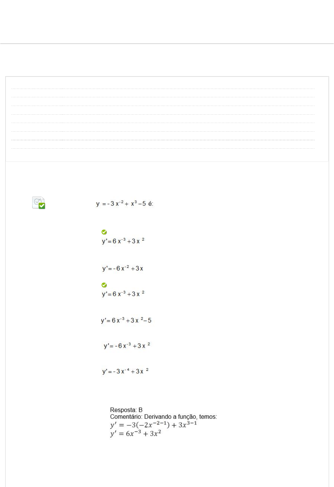Revisar envio do teste: QUESTIONÁRIO UNIDADE III CÁLCULO DIFERENCIAL DE UMA VARIÁVEL 6147-60_15402_R_E1_20252 CONTEÚDO Usuário CAMILLY EVILLY AZEVEDO SANTOS ALMEIDA Curso CÁLCULO DIFERENCIAL DE UMA VARIÁVEL Teste QUESTIONÁRIO UNIDADE III Iniciado 14/10/25 18:58 Enviado 14/10/25 19:12 Status Completada Resultado da tentativa 4 em 4 pontos Tempo decorrido 14 minutos Resultados exibidos Todas as respostas, Respostas enviadas, Respostas corretas, Comentários, Perguntas respondidas incorretamente Pergunta 1 Resposta Selecionada: b. Respostas: a. b. c. d. e. Comentário da resposta: A derivada da função . . . . . . . Pergunta 2 UNIP EAD CONTEÚDOS ACADÊMICOS BIBLIOTECAS MURAL DO ALUNO LABORATÓRIOSTUTORIAIS 0,4 em 0,4 pontos 0,4 em 0,4 pontos 15/10/2025, 10:24 Revisar envio do teste: QUESTIONÁRIO UNIDADE III – ... https://ava.ead.unip.br/webapps/assessment/review/review.jsp?attempt_id=_116468992_1&course_id=_414624_1&content_id=_4620030_1&out… 1/8 http://company.blackboard.com/ https://ava.ead.unip.br/webapps/blackboard/execute/courseMain?course_id=_414624_1 https://ava.ead.unip.br/webapps/blackboard/content/listContent.jsp?course_id=_414624_1&content_id=_4618358_1&mode=reset https://ava.ead.unip.br/webapps/portal/execute/tabs/tabAction?tab_tab_group_id=_10_1 https://ava.ead.unip.br/webapps/portal/execute/tabs/tabAction?tab_tab_group_id=_25_1 https://ava.ead.unip.br/webapps/portal/execute/tabs/tabAction?tab_tab_group_id=_27_1 https://ava.ead.unip.br/webapps/portal/execute/tabs/tabAction?tab_tab_group_id=_47_1 https://ava.ead.unip.br/webapps/portal/execute/tabs/tabAction?tab_tab_group_id=_64_1 https://ava.ead.unip.br/webapps/portal/execute/tabs/tabAction?tab_tab_group_id=_29_1 https://ava.ead.unip.br/webapps/login/?action=logout Resposta Selecionada: b. Respostas: a. b. c. d. e. Comentário da resposta: A derivada da função é igual a: . . . . . . . Pergunta 3 Resposta Selecionada: a. Respostas: a. b. c. A derivada da função . . . . 0,4 em 0,4 pontos 15/10/2025, 10:24 Revisar envio do teste: QUESTIONÁRIO UNIDADE III – ... https://ava.ead.unip.br/webapps/assessment/review/review.jsp?attempt_id=_116468992_1&course_id=_414624_1&content_id=_4620030_1&out… 2/8 d. e. Comentário da resposta: . . . Pergunta 4 A derivada da função 0,4 em 0,4 pontos 15/10/2025, 10:24 Revisar envio do teste: QUESTIONÁRIO UNIDADE III – ... https://ava.ead.unip.br/webapps/assessment/review/review.jsp?attempt_id=_116468992_1&course_id=_414624_1&content_id=_4620030_1&out… 3/8 Resposta Selecionada: d. Respostas: a. b. c. d. e. Comentário da resposta: . . . . . . . Pergunta 5 Resposta Selecionada: c. Respostas: a. b. c. d. A derivada da função . . . . . 0,4 em 0,4 pontos 15/10/2025, 10:24 Revisar envio do teste: QUESTIONÁRIO UNIDADE III – ... https://ava.ead.unip.br/webapps/assessment/review/review.jsp?attempt_id=_116468992_1&course_id=_414624_1&content_id=_4620030_1&out… 4/8 e. Comentário da resposta: . . Pergunta 6 Resposta Selecionada: d. Respostas: a. b. c. d. e. Comentário da resposta: A derivada da função . . . . . . . 0,4 em 0,4 pontos 15/10/2025, 10:24 Revisar envio do teste: QUESTIONÁRIO UNIDADE III – ... https://ava.ead.unip.br/webapps/assessment/review/review.jsp?attempt_id=_116468992_1&course_id=_414624_1&content_id=_4620030_1&out… 5/8 Pergunta 7 Resposta Selecionada: b. Respostas: a. b. c. d. e. Comentário da resposta: A derivada da função . . . . . . . Pergunta 8 Resposta Selecionada: e. Um corpo tem função horária S(t) = 4 t 2 + 3 t + 1, sendo S em metros e t em segundos. Lembrando que v (t) = s’(t), então a velocidade do corpo no instante t = 5 s é: V(4) = 43 m/s 0,4 em 0,4 pontos 0,4 em 0,4 pontos 15/10/2025, 10:24 Revisar envio do teste: QUESTIONÁRIO UNIDADE III – ... https://ava.ead.unip.br/webapps/assessment/review/review.jsp?attempt_id=_116468992_1&course_id=_414624_1&content_id=_4620030_1&out… 6/8 Respostas: a. b. c. d. e. Comentário da resposta: V(4) = 40 m/s V(4) = 8 m/s V(4) = 12 m/s V(4) = 22 m/s V(4) = 43 m/s Resposta: E Comentário: Derivando a função S(t) = 4 t 2 +3 t + 1, temos v (t) = s’(t) = 8 t + 3, daí, no instante t = 5s, temos v(5) = 8. 5 + 3 = 43 m/s. Pergunta 9 Resposta Selecionada: b. Respostas: a. b. c. d. e. Comentário da resposta: Usando a regra de L’hospital, o valor do limite 1/5 5 1/5 1 -1/5 0 . Pergunta 10 Resposta Selecionada: d. Respostas: a. b. c. d. O volume de água, no instante t, em um tanque é dado pela função ,com t em minutos e V em litros. A taxa de variação do volume de água em função do tempo no instante t = 4 min é igual a: 242 L/min 200 L/min 100 L/min 150 L/min 242 L/min 0,4 em 0,4 pontos 0,4 em 0,4 pontos 15/10/2025, 10:24 Revisar envio do teste: QUESTIONÁRIO UNIDADE III – ... https://ava.ead.unip.br/webapps/assessment/review/review.jsp?attempt_id=_116468992_1&course_id=_414624_1&content_id=_4620030_1&out… 7/8 Quarta-feira, 15 de Outubro de 2025 10h24min15s GMT-03:00 e. Comentário da resposta: 142 L/min . ← OK 15/10/2025, 10:24 Revisar envio do teste: QUESTIONÁRIO UNIDADE III – ... https://ava.ead.unip.br/webapps/assessment/review/review.jsp?attempt_id=_116468992_1&course_id=_414624_1&content_id=_4620030_1&out… 8/8