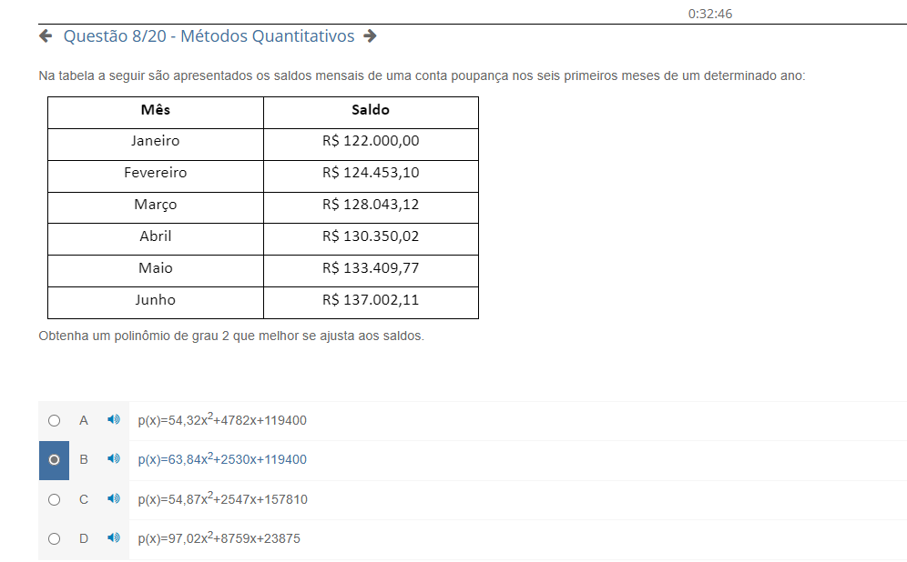 0:32:46 Questão 8/20 - Métodos Quantitativos Na tabela a seguir são apresentados os saldos mensais de uma conta poupança nos seis primeiros meses de um determinado ano: Mês Saldo Janeiro R$ 122.000,00 Fevereiro R$ 124.453,10 Março R$ 128.043,12 Abril R$ 130.350,02 Maio R$ 133.409,77 Junho R$ 137.002,11 Obtenha um polinômio de grau 2 que melhor se ajusta aos saldos. A B D