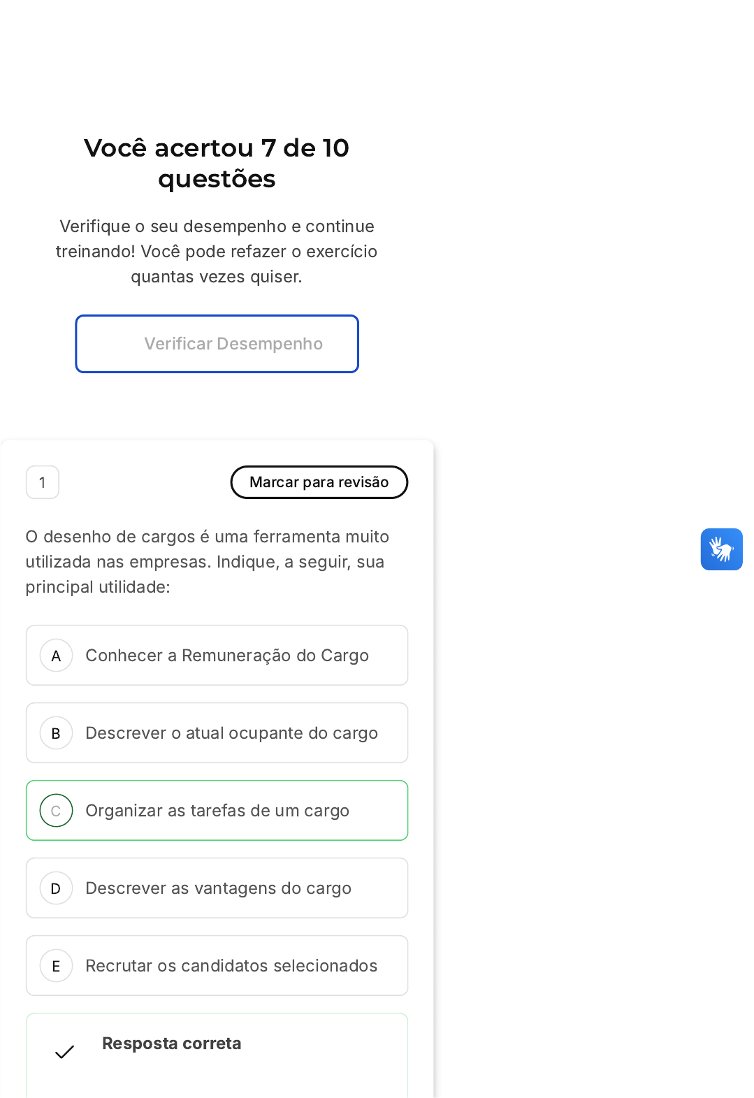 Você acertou 7 de 10 questões Verifique o seu desempenho e continue treinando! Você pode refazer o exercício quantas vezes quiser. Verificar Desempenho A B C D E 1 Marcar para revisão O desenho de cargos é uma ferramenta muito utilizada nas empresas. Indique, a seguir, sua principal utilidade: Conhecer a Remuneração do Cargo Descrever o atual ocupante do cargo Organizar as tarefas de um cargo Descrever as vantagens do cargo Recrutar os candidatos selecionados Resposta correta A B C Parabéns, você selecionou a alternativa correta. Confira o gabarito comentado! Gabarito Comentado O desenho de cargos é uma ferramenta que tem como principal utilidade organizar as tarefas de um cargo. Ele está relacionado ao conteúdo, aos métodos de trabalho e à relação com outros cargos. Portanto, consiste no processo de organizar o trabalho, por meio de tarefas essenciais, para alcançar os resultados esperados por um cargo específico. Para isso, é importante a coleta de informações necessárias para estruturar os elementos necessários para exercer determinado cargo, tais como: competência necessária do ocupante, atribuições, garantias, nível hierárquico na empresa e área de atuação. 2 Marcar para revisão Podemos dividir as ações de capacitação na empresa em dois tipos: treinamento e desenvolvimento. Aponte, a seguir, uma característica relacionada a uma ação de treinamento: Ações de Longo Prazo Foco no processo de trabalho Customização D E A B C Foco na carreira Mais oneroso Resposta incorreta Opa! A alternativa correta é a letra B. Confira o gabarito comentado! Gabarito Comentado O treinamento é uma ação de capacitação que visa a desenvolver competências técnicas e comportamentais para o exercício de uma função específica. Por isso, o foco do treinamento é no processo de trabalho. 3 Marcar para revisão Sobre desenho organizacional, aponte, a seguir, uma vantagem de uma empresa centralizada: Decisões mais alinhadas aos objetivos da empresa Tomada de decisão mais ágil Decisões tomadas perto do problema D E A B Decisões mais democráticas Estimula a criatividade nas decisões Resposta incorreta Opa! A alternativa correta é a letra A. Confira o gabarito comentado! Gabarito Comentado Em uma empresa centralizada, as decisões são tomadas por um pequeno grupo de indivíduos no topo da hierarquia. Isso pode resultar em decisões mais alinhadas aos objetivos da empresa, uma vez que esses indivíduos têm uma visão geral da organização e de seus objetivos estratégicos. Embora a centralização possa ter desvantagens, como a lentidão na tomada de decisões e a falta de criatividade, uma de suas vantagens é a consistência e alinhamento das decisões com a estratégia da empresa. 4 Marcar para revisão Sobre o desenho organizacional, aponte, a seguir, uma vantagem de uma empresa descentralizada: As decisões são acompanhadas de forma mais fácil Duplicidade de ordens C D E Decisões mais alinhadas à alta administração Mais autonomia na tomada de decisões Estrutura mais enxuta Resposta correta Parabéns, você selecionou a alternativa correta. Confira o gabarito comentado! Gabarito Comentado Uma empresa descentralizada é aquela em que as decisões são tomadas de forma mais autônoma, ou seja, sem a necessidade de aprovação da alta administração. Isso permite que as empresas sejam mais ágeis e flexíveis, o que pode ser uma vantagem competitiva. 5 Marcar para revisão O treinamento e desenvolvimento apresentam diversos objetivos organizacionais. Qual dos objetivos a seguir não pode ser considerado um dos objetivos dessas ações: A B C D E Adequar a pessoa à cultura da empresa. Mudar atitudes. Desenvolver pessoas. Adaptação das pessoas para lidar com a modernização da empresa. Escolher os funcionários que devem ser promovidos ou demitidos. Resposta correta Parabéns, você selecionou a alternativa correta. Confira o gabarito comentado! Gabarito Comentado O treinamento e desenvolvimento não tem como objetivo escolher os funcionários que devem ser promovidos ou demitidos. Isso é uma decisão da empresa, que não tem relação com o treinamento e desenvolvimento. 6 Marcar para revisão A partir de que época as empresas começaram a desenvolver treinamentos focados em comportamento e habilidades gerenciais, A B C D E devido ao aumento da competição entre empresas? Era Industrial Clássica Era Industrial Neoclássica Era da Informação Era do Conhecimento Era Contemporânea Resposta correta Parabéns, você selecionou a alternativa correta. Confira o gabarito comentado! Gabarito Comentado A resposta correta é: Era Industrial Neoclássica. A Era Industrial Neoclássica é o período que se inicia após a Segunda Guerra Mundial, e é marcado pelo aumento da competição entre empresas, o que levou a um maior foco em treinamentos focados em comportamento e habilidades gerenciais. 7 Marcar para revisão Ao descrever um cargo, deve se observar diversos fatores. A seguir, aponte um item Questão 10 de 10 Corretas (7) Incorretas (3) E b (0) 1 2 3 4 5 6 7 8 9 10 Lista de exercícios Conteúdo Sair A B C D E importante que deve ser considerado: O cargo deve ser visto de forma organizacional. O cargo deve se adequar ao atual ocupante. A descrição do cargo deve ser rígida. A descrição do cargo deve apresentar temos técnicos. A rigidez do cargo. Resposta correta Parabéns, você selecionou a alternativa correta. Confira o gabarito comentado! Gabarito Comentado A descrição do cargo deve ser feita de forma organizacional, pois é necessário que o cargo esteja alinhado com os objetivos da empresa e com as funções que serão desempenhadas pelo ocupante. Além disso, a descrição do cargo deve ser clara e objetiva, para que não haja dúvidas sobre as responsabilidades e atribuições do ocupante. 8 Marcar para revisão Em branco (0) A B C D E Sobre o desenho organizacional, cite, a seguir, um exemplo de formalização da empresa: En