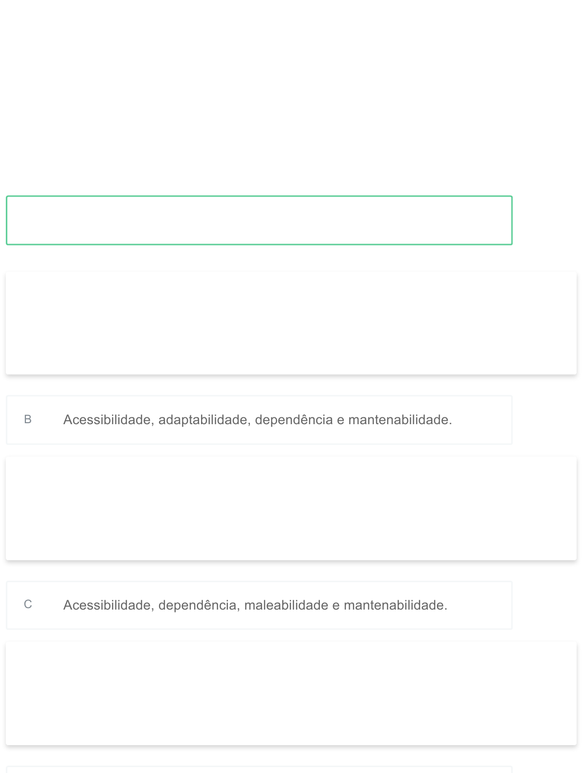 Questão 1 1,2/1,2 Selecione a resposta: A Acessibilidade, adaptabilidade, dependência e gerenciabilidade. Você acertou! Comentários da resposta Acessibilidade, adaptabilidade, dependência e gerenciabilidade são as quatro características desejáveis em toda infraestrutura de TI. Comentários da resposta Acessibilidade, adaptabilidade, dependência e gerenciabilidade são as quatro características desejáveis em toda infraestrutura de TI. Comentários da resposta Acessibilidade, adaptabilidade, dependência e gerenciabilidade são as quatro características desejáveis em toda infraestrutura de TI. Uma infraestrutura de TI bem estruturada apresenta quatro características fundamentais que devem ser analisadas pelos gestores no momento da tomada de decisão sobre como adquirir hardware, software, redes (dispositivos de comunicação) e banco de dados para a organização. Posto isso, marque a alternativa que apresenta essas quatro características: B Acessibilidade, adaptabilidade, dependência e mantenabilidade. C Acessibilidade, dependência, maleabilidade e mantenabilidade. Comentários da resposta Acessibilidade, adaptabilidade, dependência e gerenciabilidade são as quatro características desejáveis em toda infraestrutura de TI. Comentários da resposta Acessibilidade, adaptabilidade, dependência e gerenciabilidade são as quatro características desejáveis em toda infraestrutura de TI. D Adaptabilidade, assessoramento, dependência e gerenciabilidade. E Adaptabilidade, dependência, gerenciabilidade e recuperação. Questão 2 1,2/1,2 Cloud computing (computação em nuvem) é a capacidade de computação infinitamente disponível e flexível. A nuvem é tudo aquilo que está por trás da conexão. As preocupações com a largura de banda, espaço de armazenamento, poder de processamento, confiabilidade e segurança são postas de lado. Sobre as características da computação em nuvem, analise as afirmações a seguir: I. Self-service sob demanda é a característica da computação em nuvem que diz que o usuário pode adquirir unilateralmente recursos computacionais sem precisar de interação humana com os provedores de cada serviço. II. A computação em nuvem precisa oferecer amplo acesso, ou seja, os recursos solicitados podem ser encontrados nas disponibilidades da rede e acessados por meio de qualquer mecanismo padronizado que permita o uso por plataformas do tipo thin. III. Pooling de recursos em computação em nuvem diz que os usuários não precisam ter conhecimento da localização física dos recursos computacionais; eles podem estar Selecione a resposta: Comentários da resposta Todas as propriedades apresentadas são características da computação em nuvem. Self- service sob demanda é a característica da computação em nuvem que diz que o usuário pode adquirir unilateralmente recursos computacionais, como tempo de processamento no servidor ou armazenamento na rede, conforme sua demanda, sem precisar de interação humana com os provedores de cada serviço. A computação em nuvem precisa oferecer amplo acesso, ou seja, os recursos solicitados podem ser encontrados nas disponibilidades da rede e acessados por meio de qualquer mecanismo padronizado que permita o uso por plataformas do tipo thin, como celulares, laptops e personal digital assistants (PDAs). Pooling de recursos em computação em nuvem diz que os usuários não precisam ter conhecimento da localização física dos recursos computacionais. Eles podem estar em qualquer lugar. Basta saber que esses recursos estão organizados em um pool para servir múltiplos usuários, usando um modelo multi-tenant ou multi-inquilino, com diferentes recursos físicos e virtuais, dinamicamente atribuídos e ajustados. B I, II e III. Você acertou! Comentários da resposta Todas as propriedades apresentadas são características da computação em nuvem. Self- service sob demanda é a característica da computação em nuvem que diz que o usuário pode adquirir unilateralmente recursos computacionais, como tempo de processamento no servidor ou armazenamento na rede, conforme sua demanda, sem precisar de interação humana com os provedores de cada serviço. A computação em nuvem precisa oferecer amplo acesso, ou seja, os recursos solicitados podem ser encontrados nas disponibilidades da rede e acessados por meio de qualquer mecanismo padronizado que em qualquer lugar; basta saber que esses recursos estão organizados em um pool para servir múltiplos usuários. É correto o que se afirma em: A I e III. permita o uso por plataformas do tipo thin, como celulares, laptops e personal digital assistants (PDAs). Pooling de recursos em computação em nuvem diz que os usuários não precisam ter conhecimento da localização física dos recursos computacionais. Eles podem estar em qualquer lugar. Basta saber que esses recursos estão organizados em um pool para servir múltiplos usuários, usando um modelo multi-tenant ou multi-inquilino, com diferentes recursos físicos e virtuais, dinamicamente atribuídos e ajustados. Comentários da resposta Todas as propriedades apresentadas são características da computação em nuvem. Self- service sob demanda é a característica da computação em nuvem que diz que o usuário pode adquirir unilateralmente recursos computacionais, como tempo de processamento no servidor ou armazenamento na rede, conforme sua demanda, sem precisar de interação humana com os provedores de cada serviço. A computação em nuvem precisa oferecer amplo acesso, ou seja, os recursos solicitados podem ser encontrados nas disponibilidades da rede e acessados por meio de qualquer mecanismo padronizado que permita o uso por plataformas do tipo thin, como celulares, laptops e personal digital assistants (PDAs). Pooling de recursos em computação em nuvem diz que os usuários não precisam ter conhecimento da localização física dos recursos computacionais. Eles podem estar em qualquer lugar