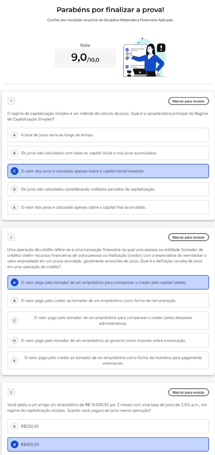 Parabéns por finalizar prova! Confira seu resultado na prova da disciplina Matemática Financeira Aplicada. Nota ! 9,0/10,0 1 Marcar para revisão regime de capitalização simples é um método de cálculo de juros. Qual é a principal do Regime de Capitalização Simples? A A taxa de juros varia ao longo do tempo. Os juros são calculados com base no capital inicial e nos juros acumulados. valor dos juros é calculado apenas sobre o capital inicial investido. D Os juros são calculados considerando múltiplos de capitalização. E valor dos juros é calculado apenas sobre capital final acumulado. 2 Marcar para revisão Uma operação de crédito refere-se a uma transação financeira na qual uma pessoa ou entidade (tomador de crédito) obtém recursos financeiros de outra pessoa ou instituição (credor) com a expectativa de reembolsar valor emprestado em um prazo acordado, geralmente acrescido de juros. Qual é a definição correta de juros em uma operação de crédito? A valor pago pelo tomador de um empréstimo para compensar credor pelo capital cedido. valor pago pelo credor tomador de um empréstimo como forma de remuneração. valor pago pelo tomador de um empréstimo para compensar credor pelas despesas administrativas. D valor pago pelo tomador de um empréstimo ao governo como imposto sobre a transação. valor pago pelo credor ao tomador de um empréstimo como forma de incentivo para pagamento E antecipado. 3 Marcar para revisão Você pediu a um amigo um empréstimo de R$ 10.000,00 por 2 meses com uma taxa de juros de 2,0% a.m., em regime de capitalização simples. Quanto você pagará de juros nessa operação? A R$200,00 R$400,004 Marcar para revisão Qual a alternativa que melhor descreve uma série uniforme? A Os valores dos pagamentos e os intervalos entre os pagamentos são constantes. Os intervalos entre os pagamentos são Há um número ilimitado de pagamentos. D primeiro pagamento corresponde ao primeiro periodo. E Os valores dos pagamentos são iguais. 5 Marcar para revisão Considerando seus conhecimentos a respeito das ferramentas de avaliação e controle de projetos, analise as afirmativas abaixo: I. Valor Anual Uniforme Equivalente é usado na análise de projetos com durações distintas II. Valor Anual Uniforme Equivalente é usado para avaliar a taxa de retorno de um projeto III. Não é analisar projetos com durações distintas IV. Ponto Fischer é ponto de intersecção entre as curvas de dois projetos É CORRETO que se afirma em: A I e IV, apenas. e II, apenas. III e IV, apenas. D e III, apenas. E I, II, III e IV 6 Marcar para revisão Salvo em situações muito especificas, uma empresa realiza um projeto buscando algum tipo de retorno finaneiro ou que possa ser monetizável. A seleção de projetos deve, portanto, comparar projetos da partir de uma ótica financeira. Quais ferramentas podem ser usadas nessa avaliação? A VPL, TIR e PayBack 7 Marcar para revisão Determine o valor presente de uma perpetuidade que paga 100 reais por mês indefinidamente, considerando- se uma taxa de juros de 0,2% a.m. A 40.000 50.000 5.000 D 10.0Marcar para revisão Os sistemas de amortização possuem diferentes caracteristicas. Qual a alternativa que melhor descreve os valores referentes aos juros em cada prestação do Sistema Americano? A Crescentes Decrescentes Decrescentes D Crescentes exponencialmente. E Constantes. 9 Marcar para revisão Calcule valor da TIR do projeto com fluxo ilustrado na figura abaixo. 900 A 3,48% a.a. 3% a.a. 4,22% a.a. D 2,56% a.a. E 5,78% a.a. 10 Marcar para revisão Qual valor presente liquido de um projeto com investimento inicial de 8.000 reais e que paga 1.000 por mês durante 10 meses, dada uma TMA de 1% a.m.? A 1.543,12 3.235,11 1.622,35 D 1.471,30