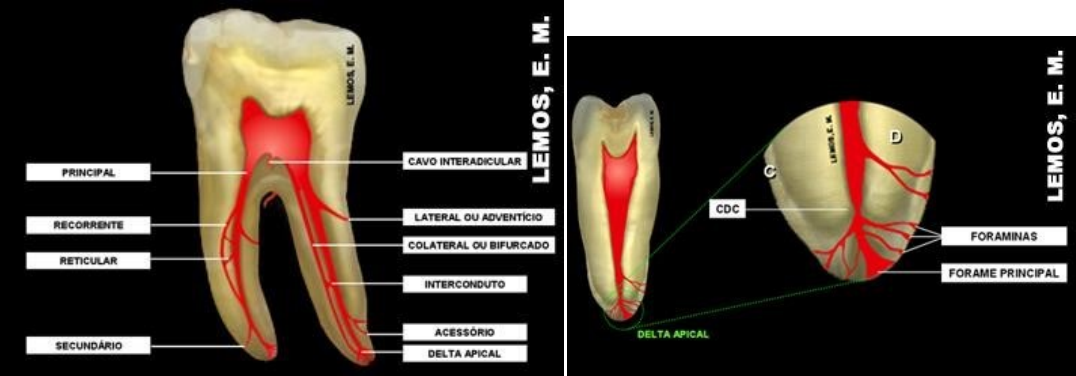 RESUMO ENDO I AULA DE ANATOMIA INTERNA TEORIA DA HEMODINÂMICA: a direção do forame apical dos canais é sempre para a distal, acompanhando a direção de vasos e nervos que vem da base do crânio. UNIRRADICULARES: possuem só uma raiz BIRRADICULARES: Possuem 2 raízes MULTIRRADICULARES: Possuem mais de duas raízes ( achatamento proximal acentuado) CAVIDADE PULPAR: o único tecido mole do dente imitando a morfologia externa e se divide em: * Câmara Pulpar e Canal Radicular CÂMARA PULPAR: Dividida em faces: 1 conduto radicular: Vestibular, Lingual/palatina, mesial, distal, oclusal/incisal ( o teto) 2 ( ou mais) condutos radiculares: Vestibular, Lingual/palatina, mesial, distal, oclusal/incisal ( o teto) e assoalho. Teto dos posteriores: face Oclusal Teto dos anteriores: face Incisal CANAL RADICULAR: Inicia no término da câmara pulpar ou no assoalho ( para mais de 2 canais) forame apical - situa-se quase sempre num dos lados da raiz e muito raramente em seu vértice MÉTODOS DE ESTUDO DOS CANAIS: Injeção de borracha líquida, diafanização e microtomografia. Kutller: disse: · O canal radicular não é único · Divide-se em canal dentinário e canal cementário e se unem pelos vértices · Formato de cones truncados · Meio milímetro de distância do forame apical SIGLAS · CDC - Junção Cemento Dentina Canal · D - dentina · C - cemento · Menor diâmetro do canal se dá: 42% Dentina e 32% CDC Distância CDC ao vértice 0,7mm, porém na prática clínica essa medida torna-se 1mm. CIRURGIA DE ACESSO Permite a visualização e acesso aos canais Objetivos: · Acesso de forma livre e direta · Remoção de todo teto da câmara pulpar · Visualizar sem danificar a entrada dos canais e assoalho pulpar · Expulsividade da parede mesial dos posteriors Acidentes e Erros · Perfurações • Injúrias ao Assoalho • Remanescente de Teto • Abertura Insuficiente • Abertura Excessiva BROCAS: tronco cônica invertida para início e depois Esféricas ( 1012HL, 1014HL e 1016HL) Fase 1: esmalte - broca diamantada Fase 2: dentina - broca carbide Fase 3: Exploração do canal com explorador de ponta reta e ou lima tipo k número 15. Fase 4: desgaste compensatório lateriais – broca de largo e Gates preservar a estética e resistência do elemento dentário. TETO: Dificulta a remoção da polpa, usar explorador no. 5 angulado e a broca tronco cônica ponta inativa ( baixa rotação) para remoção CONCRESCÊNCIA: Dificulta a ação do instrumental na parede Palatina/lingual. Usar explorador no. 5 modificado, ponta reta. e broca tronco cônica ponta inativa ( baixa rotação) para remoção Incisivo Central Superior e Lateral Superior · Número de Raízes: única · Número de Canais: único · Ponto de Eleição: abaixo do cíngulo · Forma de Contorno: triangular com a base voltada para incisal • Direção de Trepanação: 45o ao longo do eixo do dente Canino Superior · Número de Raízes: única · Número de Canais: único · Ponto de Eleição: abaixo do cíngulo · Forma de Contorno: lancelada, chama de vela · Direção de Trepanação: 45o ao longo do eixo do dente Incisivo Central Inferior e Lateral Inferior · Número de Raízes: única · Número de Canais: pode ter 2 canais · Ponto de Eleição: acima do cíngulo · Forma de Contorno: triangular com a base voltada para incisal • Direção de Trepanação: 45o ao longo do eixo do dente Canino Inferior · Número de Raízes: única · Número de Canais: pode ter 2 canais · Ponto de Eleição: acima do cíngulo · Forma de Contorno: lancelada, chama de vela · Direção de Trepanação: 45o ao longo do eixo do dente Primeiro Pré-Molar Superior · Número de Raízes: duas raízes (60%) · Número de Canais: · Ponto de Eleição: centro do sulco principal · Forma de Contorno: elíptica · Direção de Trepanação: em direção ao longo do eixo do dente, com uma leve inclinação para raiz palatina quando houver mais de 1 raiz Segundo Pré-Molar Superior · Número de Raízes: única · Número de Canais: pode ter 1 ou 2 canais · Ponto de Eleição: centro do sulco principal · Forma de Contorno: elíptica · Direção de Trepanação: ao longo do eixo do dente Primeiro Pré-Molar Inferior · Número de Raízes: única · Número de Canais: pode ter 1,2 ou 3 canais · Ponto de Eleição: fóssula mesial · Forma de Contorno: circular ou ovalada · Direção de Trepanação: paralela ao longo do eixo do dente com inclinação para o centro da coroa Segundo Pré-Molar Inferior · Número de Raízes: única · Número de Canais: pode ter 1, 2 ou 3 canais · Ponto de Eleição: centro do sulco principal · Forma de Contorno: elíptica, ovalada · Direção de Trepanação: paralelo ao longo do eixo do dente Primeiro Molar Superior · Número de Raízes: 3 raízes · Número de Canais: pode ter 2 a 5 canais · Ponto de Eleição: fossa central · Forma de Contorno: triangular com a base voltada para vestibular · Direção de Trepanação: paralelo ao longo do eixo do dente com pequena inclinação em direção a raiz palatina Segundo Molar Superior · Número de Raízes: 3 raizes, podem estar fuzionadas · Número de Canais: 3 canais, procurar sempre o 4 · Ponto de Eleição: fossa central · Forma de Contorno: triangular com base voltada para vestibular · Direção de Trepanação: paralelo ao longo do eixo do dente com pequena inclinação em direção a raiz palatina Primeiro Molar Inferior · Número de Raízes: 2 raizes · Número de Canais: pode ter 3 ou 4 canais · Ponto de Eleição: centro do sulco principal · Forma de Contorno: trapezoidal com a base voltada para mesial · Direção de Trepanação: paralelo ao longo do eixo do dente com leve inclinação para raiz distal Segundo Molar Inferior · Número de Raízes: 2 raizes, podem estar fuzionadas · Número de Canais: pode ter 3 ou 4 canais · Ponto de Eleição: centro do sulco principal · Forma de Contorno: trapezoidal com base voltada para mesial · Dire