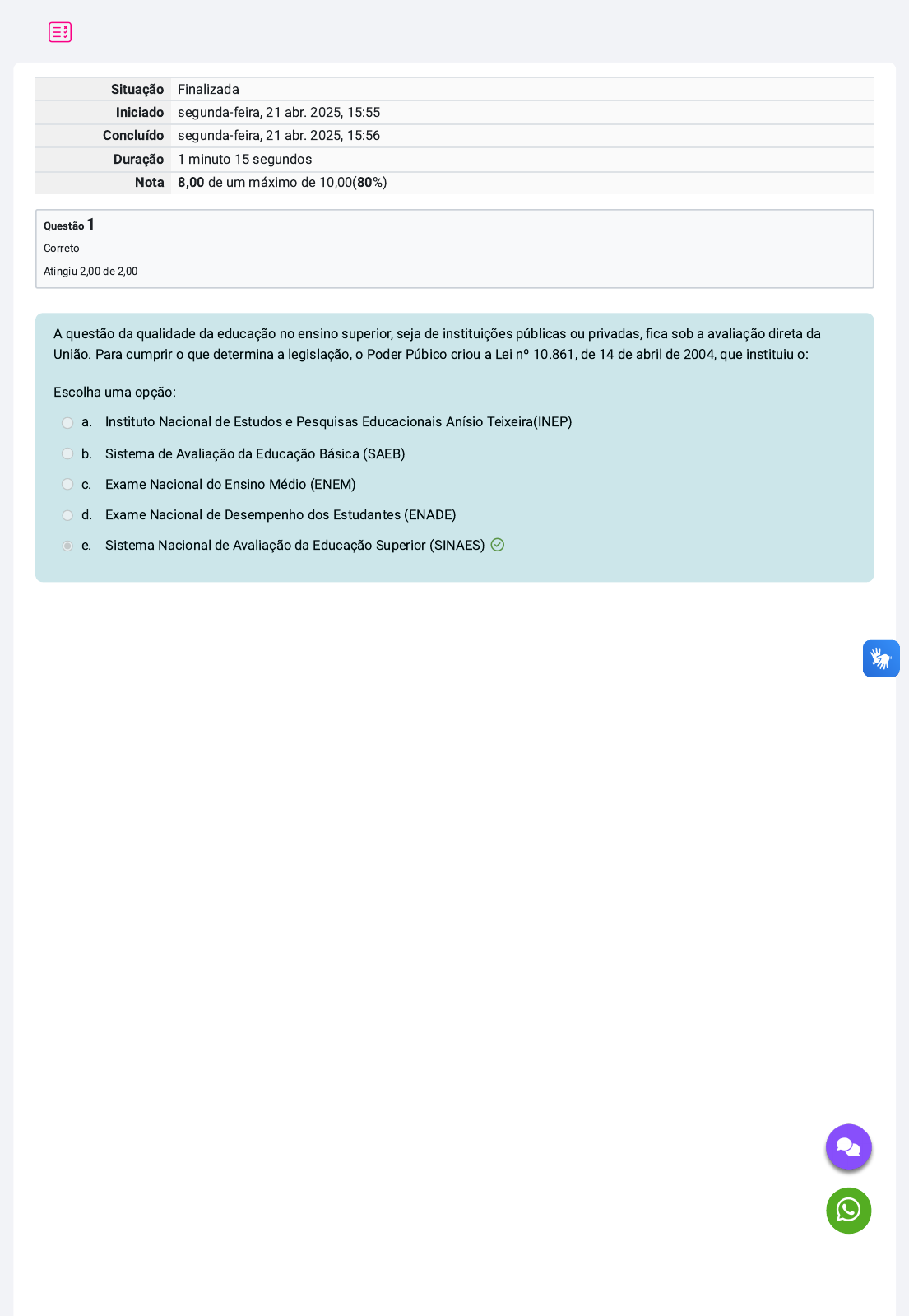 Situação Finalizada Iniciado segunda-feira, 21 abr. 2025, 15:55 Concluído segunda-feira, 21 abr. 2025, 15:56 Duração 1 minuto 15 segundos Nota 8,00 de um máximo de 10,00(80%) Questão 1 Correto Atingiu 2,00 de 2,00 A questão da qualidade da educação no ensino superior, seja de instituições públicas ou privadas, fica sob a avaliação direta da União. Para cumprir o que determina a legislação, o Poder Púbico criou a Lei nº 10.861, de 14 de abril de 2004, que instituiu o: Escolha uma opção: a. Instituto Nacional de Estudos e Pesquisas Educacionais Anísio Teixeira(INEP) b. Sistema de Avaliação da Educação Básica (SAEB) c. Exame Nacional do Ensino Médio (ENEM) d. Exame Nacional de Desempenho dos Estudantes (ENADE) e. Sistema Nacional de Avaliação da Educação Superior (SINAES) https://whatsa.me/5533998173005/?t=Ol%C3%A1,%20tenho%20d%C3%BAvidas.... Questão 2 Incorreto Atingiu 0,00 de 2,00 Questão 3 Correto Atingiu 2,00 de 2,00 O acesso às TDIC possibilitou a aplicação de novas práticas como a aprendizagem baseada na investigação e a metodologia da problematização, em que ao invés de ensino direto o professor conduz o estudante à busca de respostas que ajudaam a construir conceitos e compreender o fenômeno estudado. Fazendo uma leitura crítica da situação apresentada na charge abaixo, quanto ao uso de Tecnologias Digitais de Informação e Comunicação (TDIC), é CORRETO o que se afirma em: Disponível em http://tutnaedudistancia.blogspot.com/2015/07/charges.html. Acesso em 29/09/2019 Escolha uma opção: a. O professor precisa se empoderar das ferramentas e atuar como mediador, mentor e designer da aprendizagem b. Antes ensinávamos para o uso das tecnologias, hoje usamos as tecnologias para ensinar c. O uso da tecnologia amplia o acesso ao conhecimento e a recursos educacionais diversificados d. Seu uso adequado modifica a forma de ensinar e de aprender e. Ao usar as tecnologias os professores reproduzem práticas tradicionais de ensino Sobre o Ensino superior no Brasil está INCORRETO o que se afirma em: Escolha uma opção: a. No Brasil, há instituições de ensino superior públicas (federais, estaduais e municipais) e privadas (comunitárias, confessionais, filantrópicas e particulares) b. A Educação Superior é um projeto de sociedade e deve promover a produção do conhecimento, na formação de cidadãos com pensamento crítico, de profissionais capazes de articular saberes e se tornarem líderes intelectuais c. No Brasil é garantido o acesso aos níveis mais elevados do ensino, da pesquisa e da criação artística, segundo a capacidade de cada um d. As universidades brasileiras gozam de autonomia didático-científica, administrativa e de gestão financeira e patrimonial, sendo permitida a dissociabilidade entre ensino, pesquisa e extensão e. As instituições de ensino superior que não atenderem ao que determina a legislação poderão ser descredenciadas e desativadas, quando contadas deficiências e estas não forem sanadas http://tutnaedudistancia.blogspot.com/2015/07/charges.html https://whatsa.me/5533998173005/?t=Ol%C3%A1,%20tenho%20d%C3%BAvidas.... Questão 4 Correto Atingiu 2,00 de 2,00 Questão 5 Correto Atingiu 2,00 de 2,00 Gandin (2002, p. 19-20) destaca algumas definições sobre planejamento. NÃO corresponde ao que o autor define com ato de planejar o que se afirma em: Escolha uma opção: a. Traçar caminhos para evitar a flexibilização das ações no percurso b. Dar a certeza e precisão à própria ação de grupo c. Organizar a própria ação d. Explicitar os fundamentos da ação do grupo e. Agir racionalmente A tendência pedagógica em que a metodologia aplicada envolve excessivo uso da técnica para atingir objetivos instrucionais, com uso de cópia, repetição e treino é classificada como: Escolha uma opção: a. Tendência Crítico- social dos conteúdos b. Tendência tradicional c. Tendência libertadora d. Tendência renovada e. Tendência tecnicista https://whatsa.me/5533998173005/?t=Ol%C3%A1,%20tenho%20d%C3%BAvidas....