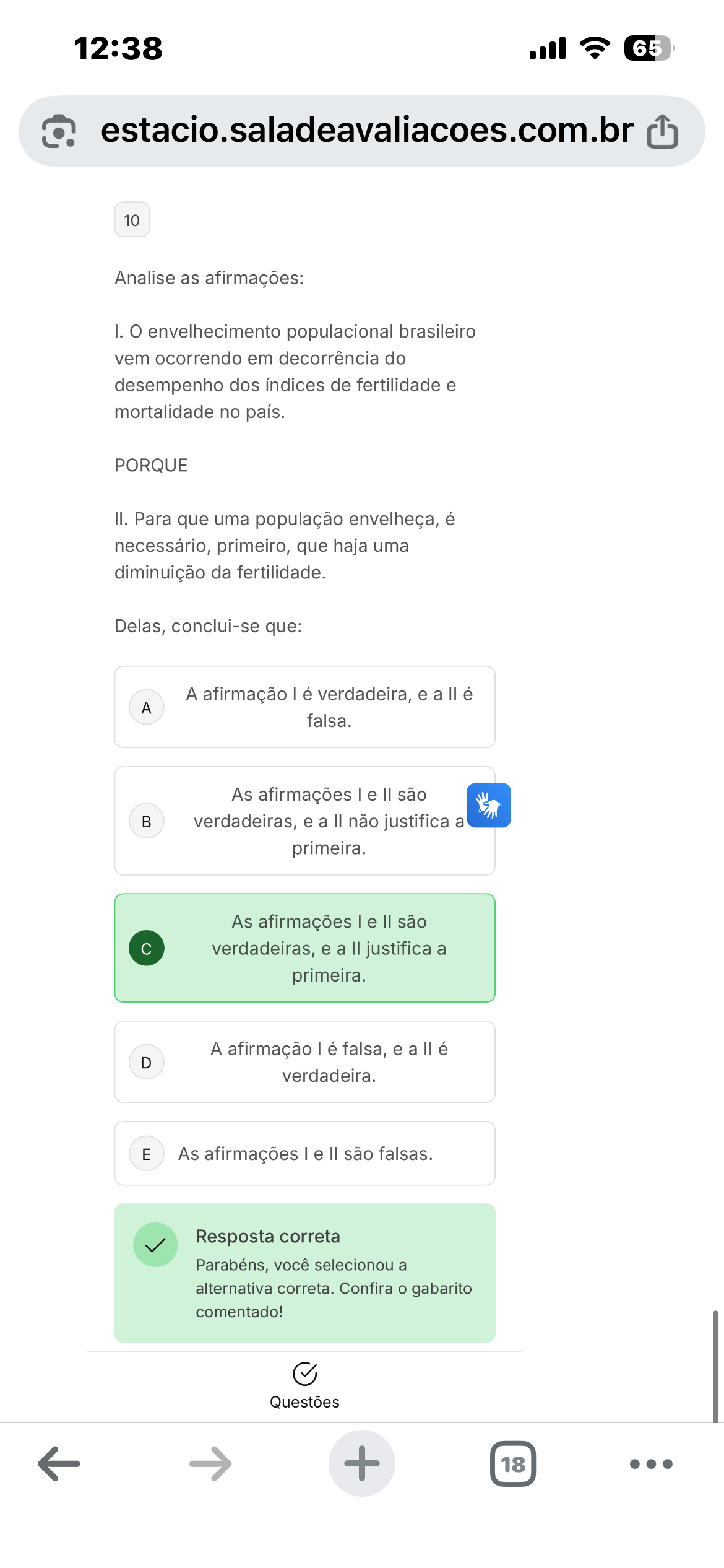 12:38 65 estacio.saladeavaliacoes.com.br 10 Analise as afirmações: I. envelhecimento populacional brasileiro vem ocorrendo em decorrência do desempenho dos índices de fertilidade e mortalidade no país. PORQUE II. Para que uma população envelheça, é necessário, primeiro, que haja uma diminuição da fertilidade. Delas, conclui-se que: A afirmação é verdadeira, e a é A falsa. As afirmações e são verdadeiras, e a não justifica a primeira. As afirmações e são c verdadeiras, e a II justifica a primeira. é D verdadeira. E As afirmações le são falsas. Resposta correta Parabéns, você selecionou a alternativa correta. Confira gabarito comentado! Questões + 18