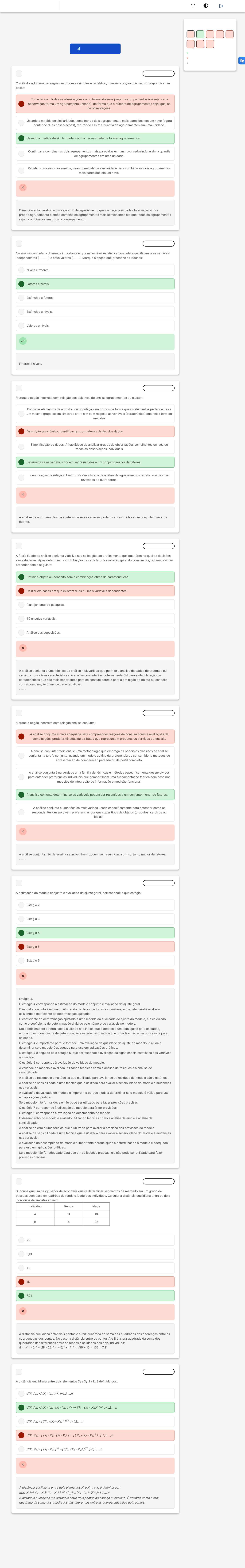 Você acertou 1 de 8 questões Verifique o seu desempenho e continue treinando! Você pode refazer o exercício quantas vezes quiser. Verificar Desempenho A B C D E A B C D E A B C D E A B C D E A B C D E A B C D E A B C D E A B C D E 1 Marcar para revisão O método aglomerativo segue um processo simples e repetitivo, marque a opção que não corresponde a um passo: Começar com todas as observações como formando seus próprios agrupamentos (ou seja, cada observação forma um agrupamento unitário), de forma que o número de agrupamentos seja igual ao de observações. Usando a medida de similaridade, combinar os dois agrupamentos mais parecidos em um novo (agora contendo duas observações), reduzindo assim a quantia de agrupamentos em uma unidade. Usando a medida de similaridade, não há necessidade de formar agrupamentos. Continuar a combinar os dois agrupamentos mais parecidos em um novo, reduzindo assim a quantia de agrupamentos em uma unidade. Repetir o processo novamente, usando medida de similaridade para combinar os dois agrupamentos mais parecidos em um novo. Resposta incorreta Opa! A alternativa correta é a letra C. Confira o gabarito comentado! Gabarito Comentado O método aglomerativo é um algoritmo de agrupamento que começa com cada observação em seu próprio agrupamento e então combina os agrupamentos mais semelhantes até que todos os agrupamentos sejam combinados em um único agrupamento. 2 Marcar para revisão Na análise conjunta, a diferença importante é que na variável estatística conjunta especificamos as variáveis independentes (_______) e seus valores (_____). Marque a opção que preenche as lacunas: Níveis e fatores. Fatores e níveis. Estímulos e fatores. Estímulos e níveis. Valores e níveis. Resposta correta Parabéns, você selecionou a alternativa correta. Confira o gabarito comentado! Gabarito Comentado Fatores e níveis. 3 Marcar para revisão Marque a opção incorreta com relação aos objetivos de análise agrupamentos ou cluster: Dividir os elementos da amostra, ou população em grupos de forma que os elementos pertencentes a um mesmo grupo sejam similares entre sim com respeito às variáveis (caraterística) que neles formam medidas Descrição taxonômica: Identificar grupos naturais dentro dos dados Simplificação de dados: A habilidade de analisar grupos de observações semelhantes em vez de todas as observações individuais Determina se as variáveis podem ser resumidas a um conjunto menor de fatores. Identificação de relação: A estrutura simplificada da análise de agrupamentos retrata relações não reveladas de outra forma. Resposta incorreta Opa! A alternativa correta é a letra D. Confira o gabarito comentado! Gabarito Comentado A análise de agrupamentos não determina se as variáveis podem ser resumidas a um conjunto menor de fatores. 4 Marcar para revisão A flexibilidade da análise conjunta viabiliza sua aplicação em praticamente qualquer área na qual as decisões são estudadas. Após determinar a contribuição de cada fator à avaliação geral do consumidor, podemos então proceder com o seguinte: Definir o objeto ou conceito com a combinação ótima de características. Utilizar em casos em que existem duas ou mais variáveis dependentes. Planejamento de pesquisa. Só envolve variáveis. Análise das suposições. Resposta incorreta Opa! A alternativa correta é a letra A. Confira o gabarito comentado! Gabarito Comentado A análise conjunta é uma técnica de análise multivariada que permite a análise de dados de produtos ou serviços com várias características. A análise conjunta é uma ferramenta útil para a identificação de características que são mais importantes para os consumidores e para a definição do objeto ou conceito com a combinação ótima de características. ----- 5 Marcar para revisão Marque a opção incorreta com relação análise conjunta: A análise conjunta é mais adequada para compreender reações de consumidores e avaliações de combinações predeterminadas de atributos que representam produtos ou serviços potenciais. A análise conjunta tradicional é uma metodologia que emprega os princípios clássicos da análise conjunta na tarefa conjunta, usando um modelo aditivo da preferência de consumidor e métodos de apresentação de comparação pareada ou de perfil completo. A análise conjunta é na verdade uma família de técnicas e métodos especificamente desenvolvidos para entender preferencias individuais que compartilham uma fundamentação teórica com base nos modelos de integração de informação e medição funcional. A análise conjunta determina se as variáveis podem ser resumidas a um conjunto menor de fatores. A análise conjunta é uma técnica multivariada usada especificamente para entender como os respondentes desenvolvem preferencias por quaisquer tipos de objetos (produtos, serviços ou ideias). Resposta incorreta Opa! A alternativa correta é a letra D. Confira o gabarito comentado! Gabarito Comentado A análise conjunta não determina se as variáveis podem ser resumidas a um conjunto menor de fatores. ----- 6 Marcar para revisão A estimação do modelo conjunto e avaliação do ajuste geral, corresponde a que estágio: Estágio 2. Estágio 3. Estágio 4. Estágio 5. Estágio 6. Resposta incorreta Opa! A alternativa correta é a letra C. Confira o gabarito comentado! Gabarito Comentado Estágio 4. O estágio 4 corresponde à estimação do modelo conjunto e avaliação do ajuste geral. O modelo conjunto é estimado utilizando os dados de todas as variáveis, e o ajuste geral é avaliado utilizando o coeficiente de determinação ajustado. O coeficiente de determinação ajustado é uma medida da qualidade do ajuste do modelo, e é calculado como o coeficiente de determinação dividido pelo número de variáveis no modelo. Um coeficiente de determinação ajustado alto indica que o modelo é um bom ajuste para os dados, enquant