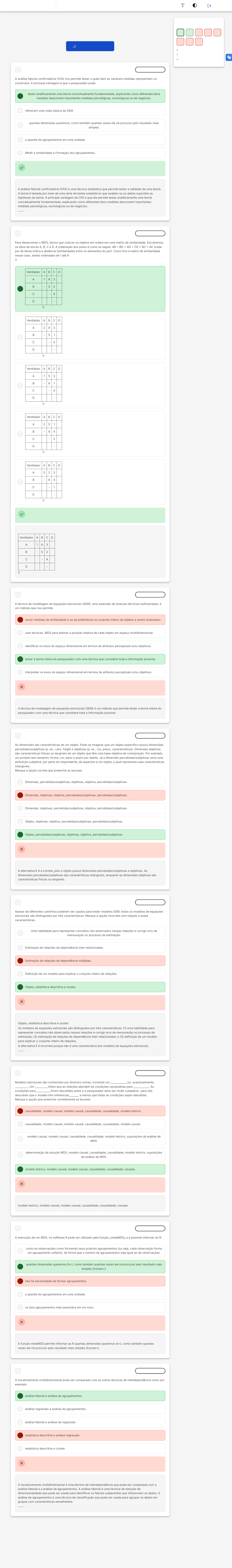 Você acertou 2 de 8 questões Verifique o seu desempenho e continue treinando! Você pode refazer o exercício quantas vezes quiser. Verificar Desempenho A B C D E A B C D E A B C D E A B C D E A B C D E A B C D E A B C D E A B C D E 1 Marcar para revisão A análise fatorial confirmatória �CFA) nos permite testar o quão bem as variáveis medidas representam os construtos. A principal vantagem é que o pesquisador pode: testar analiticamente uma teoria conceitualmente fundamentada, explicando como diferentes itens medidos descrevem importantes medidas psicológicas, sociológicas ou de negócios. oferecem uma visão básica de SEM quantas dimensões queremos, como também quantas vezes ele irá procurar pelo resultado mais simples. a quantia de agrupamentos em uma unidade. Medir a similaridade e Formação dos agrupamentos. Resposta correta Parabéns, você selecionou a alternativa correta. Confira o gabarito comentado! Gabarito Comentado A análise fatorial confirmatória �CFA) é uma técnica estatística que permite testar a validade de uma teoria. A teoria é testada por meio de uma série de testes estatísticos que avaliam se os dados suportam as hipóteses da teoria. A principal vantagem da CFA é que ela permite testar analiticamente uma teoria conceitualmente fundamentada, explicando como diferentes itens medidos descrevem importantes medidas psicológicas, sociológicas ou de negócios. ----- 2 Marcar para revisão Para desenvolver o MDS, temos que colocar os objetos em ordem em uma matriz de similaridade. Escolhemos os tipos de doces A, B, C e D. A ordenação dos pares é como se segue: AB � BD � AD � CD � BC � AC (cada par de letras indica a distância [similaridade] entre os elementos do par). Como fica a matriz de similaridade nesse caso, sendo ordenadas de 1 até 6� \r Ventilador A B C D A 1 6 3 B - 5 2 C - 4 D - \r Ventilador A B C D A 2 6 3 B - 5 1 C - 4 D - \r Ventilador A B C D A 1 5 3 B - 6 1 C - 4 D - \r Ventilador A B C D A 2 5 1 B - 6 4 C - 3 D - \r Ventilador A B C D A 5 2 3 B - 6 4 C - 1 D - \r Resposta correta Parabéns, você selecionou a alternativa correta. Confira o gabarito comentado! Gabarito Comentado Ventilador A B C D A 1 6 3 B - 5 2 C - 4 D - \r 3 Marcar para revisão A técnica de modelagem de equações estruturais �SEM�, uma extensão de diversas técnicas multivariadas, é um método que nos permite: reunir medidas de similaridade e ou de preferência no conjunto inteiro de objetos a serem analisados. usar técnicas MDS para estimar a posição relativa de cada objeto em espaço multidimensional. identificar os eixos do espaço dimensional em termos de atributos perceptuais e/ou objetivos. testar a teoria inteira do pesquisador com uma técnica que considere toda a informação possível. interpretar os eixos do espaço dimensional em termos de atributos perceptuais e/ou objetivos. Resposta incorreta Opa! A alternativa correta é a letra D. Confira o gabarito comentado! Gabarito Comentado A técnica de modelagem de equações estruturais �SEM) é um método que permite testar a teoria inteira do pesquisador com uma técnica que considere toda a informação possível. 4 Marcar para revisão As dimensões são características de um objeto. Pode-se imaginar que um objeto específico possui dimensões percebidas/subjetivas (p. ex., caro, frágil) e objetivas (p. ex., cor, preço, características). Dimensão objetivas são características físicas ou tangíveis de um objeto que têm uma base objetiva de comparação. Por exemplo, um produto tem tamanho, forma, cor, peso e assim por diante. Já a dimensão percebidas/subjetivas seria uma atribuição subjetiva, por parte do respondente, de aspectos a um objeto, a qual representa suas características intangíveis. Marque a opção correta que preenche as lacunas: Dimensão, percebidas/subjetivas, objetivas, objetiva, percebidas/subjetivas. Dimensão, objetivas, objetiva, percebidas/subjetivas, percebidas/subjetivas. Dimensão, objetivas, percebidas/subjetivas, objetiva, percebidas/subjetivas. Objeto, objetivas, objetiva, percebidas/subjetivas, percebidas/subjetivas. Objeto, percebidas/subjetivas, objetivas, objetiva, percebidas/subjetivas. Resposta incorreta Opa! A alternativa correta é a letra E. Confira o gabarito comentado! Gabarito Comentado A alternativa E é a correta, pois o objeto possui dimensões percebidas/subjetivas e objetivas. As dimensões percebidas/subjetivas são características intangíveis, enquanto as dimensões objetivas são características físicas ou tangíveis. 5 Marcar para revisão Apesar de diferentes caminhos poderem ser usados para testar modelos SEM, todos os modelos de equações estruturais são distinguidos por três características. Marque a opção incorreta com relação a essas características: Uma habilidade para representar conceitos não observados nessas relações e corrigir erro de mensuração no processo de estimação. Estimação de relações de dependência inter-relacionadas. Estimação de relações de dependência múltiplas. Definição de um modelo para explicar o conjunto inteiro de relações. Objeto, estatística descritiva e cluster. Resposta incorreta Opa! A alternativa correta é a letra E. Confira o gabarito comentado! Gabarito Comentado Objeto, estatística descritiva e cluster. Os modelos de equações estruturais são distinguidos por três características: �1) uma habilidade para representar conceitos não observados nessas relações e corrigir erro de mensuração no processo de estimação; �2) estimação de relações de dependência inter-relacionadas; e �3) definição de um modelo para explicar o conjunto inteiro de relações. A alternativa E é incorreta porque não é uma característica dos modelos de equações estruturais. ----- 6 Marcar para revisão Modelos estruturais são conhecidos por diversos nomes, incluindo um _____________ou, ocasionalmente, __________. Um __________infere