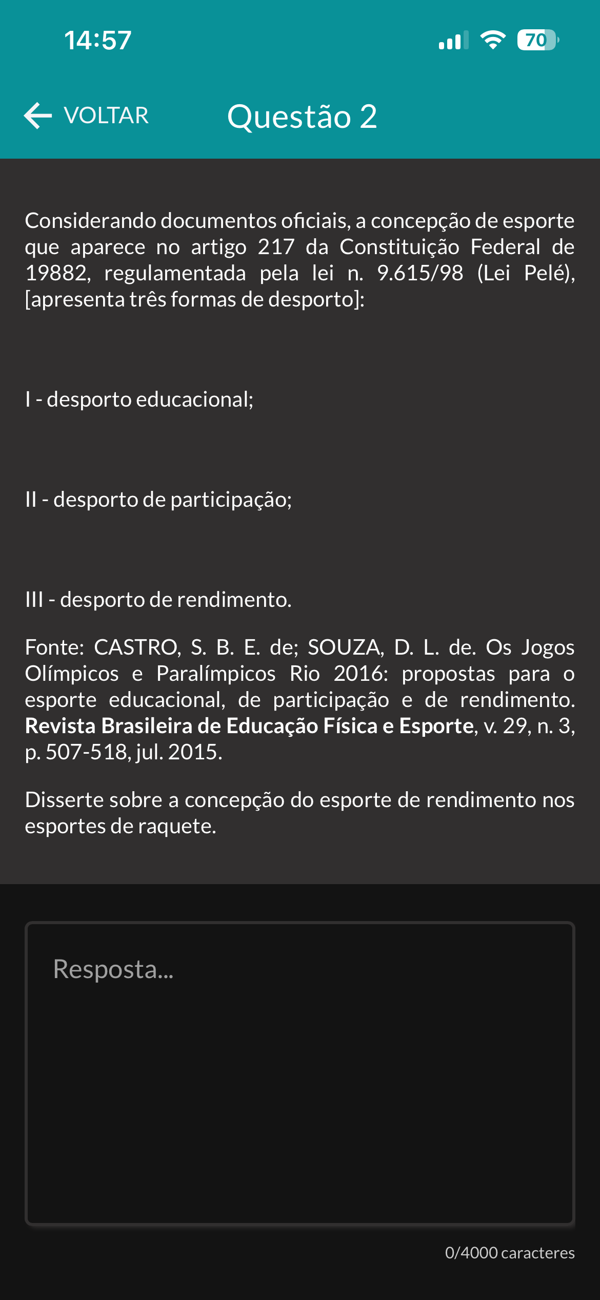 14:57 70 VOLTAR Questão 2 Considerando documentos oficiais, a concepção de esporte que aparece no artigo 217 da Constituição Federal de 19882, regulamentada pela lei n. 9.615/98 (Lei Pelé), [apresenta três formas de desporto]: - desporto educacional; - desporto de participação; III - desporto de rendimento. Fonte: CASTRO, S. E. de; SOUZA, D. L. de. Os Jogos Olímpicos e Paralímpicos Rio 2016: propostas para esporte educacional, de participação e de rendimento. Revista Brasileira de Educação Física e Esporte, V. 29, n. 3, p. 507-518, jul. 2015. Disserte sobre a concepção do esporte de rendimento nos esportes de raquete. Resposta... 0/4000 caracteres