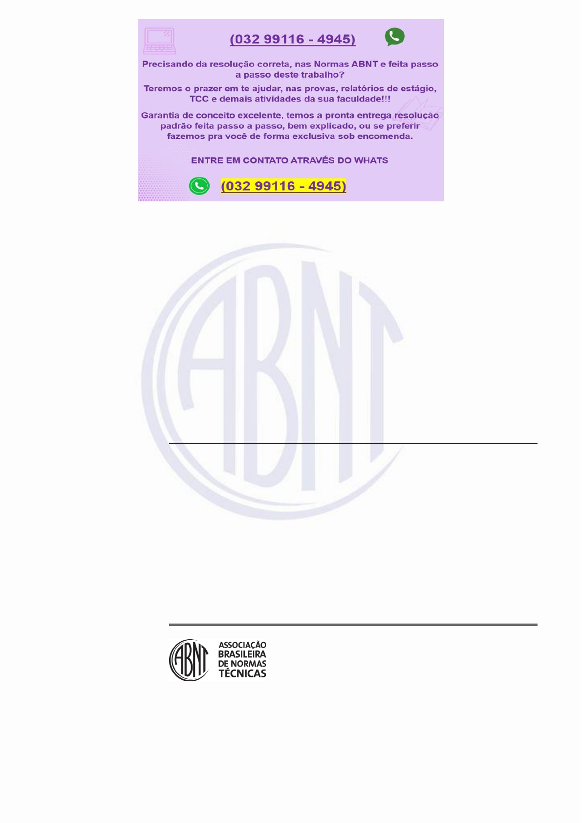 Documento impresso em 08/06/2020 14:41:20, de uso exclusivo de ANHANGUERA EDUCACIONAL LTDA NORMA BRASILEIRA ABNT NBR 14724 Terceira edição 17.03.2011 Válida a partir de 17.04.2011 Informação e documentação — Trabalhos acadêmicos — Apresentação Information and documentation — Academic work — Presentation ICS 01.120; 01.140; 01.140.40 ISBN 978-85-07-02680-8 Número de referência ABNT NBR 14724:2011 11 páginas © ABNT 2011 D o c u m e n to im p re s s o e m 0 8 /0 6 /2 0 2 0 1 4 :4 1 :2 0 , d e u s o e x c lu s iv o d e A N H A N G U E R A E D U C A C IO N A L L T D A Documento impresso em 08/06/2020 14:41:20, de uso exclusivo de ANHANGUERA EDUCACIONAL LTDA ABNT NBR 14724:2011 © ABNT 2011 Todos os direitos reservados. A menos que especificado de outro modo, nenhuma parte desta publicação pode ser reproduzida ou utilizada por qualquer meio, eletrônico ou mecânico, incluindo fotocópia e microfilme, sem permissão por escrito da ABNT. ABNT Av.Treze de Maio, 13 - 28º andar 20031-901 - Rio de Janeiro - RJ Tel.: + 55 21 3974-2300 Fax: + 55 21 3974-2346 abnt@abnt.org.br www.abnt.org.br ii © ABNT 2011 - Todos os direitos reservados D o c u m e n to im p re s s o e m 0 8 /0 6 /2 0 2 0 1 4 :4 1 :2 0 , d e u s o e x c lu s iv o d e A N H A N G U E R A E D U C A C IO N A L L T D A mailto:abnt@abnt.org.br http://www.abnt.org.br/ Documento impresso em 08/06/2020 14:41:20, de uso exclusivo de ANHANGUERA EDUCACIONAL LTDA ABNT NBR 14724:2011 Sumário Página Prefácio ............................................................................................................................................ iv 1 Escopo .............................................................................................................................. 1 2 Referências normativas ................................................................................................... 1 3 Termos e definições ......................................................................................................... 1 4 Estrutura ........................................................................................................................... 5 4.1 Parte externa ..................................................................................................................... 5 4.1.1 Capa .................................................................................................................................. 5 4.1.2 Lombada ........................................................................................................................... 6 4.2 Parte interna ..................................................................................................................... 6 4.2.1 Elementos pré-textuais .................................................................................................... 6 4.2.2 Elementos textuais ........................................................................................................... 8 4.2.3 Elementos pós-textuais.................................................................................................... 9 5 Regras gerais .................................................................................................................... 9 5.1 Formato ............................................................................................................................. 9 5.2 Espaçamento .................................................................................................................. 10 5.2.1 Notas de rodapé ............................................................................................................. 10 5.2.2 Indicativos de seção ...................................................................................................... 10 5.2.3 Títulos sem indicativo numérico ................................................................................... 10 5.2.4 Elementos sem título e sem indicativo numérico ......................................................... 10 5.3 Paginação ....................................................................................................................... 10 5.4 Numeração progressiva ................................................................................................. 11 5.5 Citações .......................................................................................................................... 11 5.6 Siglas .............................................................................................................................. 11 5.7 Equações e fórmulas ..................................................................................................... 11 5.8 Ilustrações ...................................................................................................................... 11 5.9 Tabelas ............................................................................................................................ 11 © ABNT 2011 - Todos os direitos reservados iii D o c u m e n to im p re s s o e m 0 8 /0 6 /2 0 2 0 1 4 :4 1 :2 0 , d e u s o e x c lu s iv o d e A N H A N G U E R A E D U C A C IO N A L L T D A Documento impresso em 08/06/2020 14:41:20, de uso exclusivo de ANHANGUERA EDUCACIONAL LTDA ABNT NBR 14724:2011 Prefácio A Associação Brasileira de Normas Técnicas (ABNT) é o Foro Nacional de Normalização. As Normas Brasileiras, cujo conteúdo é de responsabilidade dos Comitês Brasileiros (ABNT/CB), dos Organismos de Normalização Setorial (ABNT/ONS) e das Comissões de Estudo Especiais (ABNT/CEE), são elaboradas por Comissões de Estudo (CE), formadas por representantes dos setores envolvidos, delas fazendo parte: produtores, consumidores e neutros (universidades, laboratórios e outros). Os Documentos Técnicos ABNT são elaborados conforme as regras da Diretiva ABNT, Parte 2. A Associação Brasileira de Normas Técnicas (ABNT) chama atenção para a pos