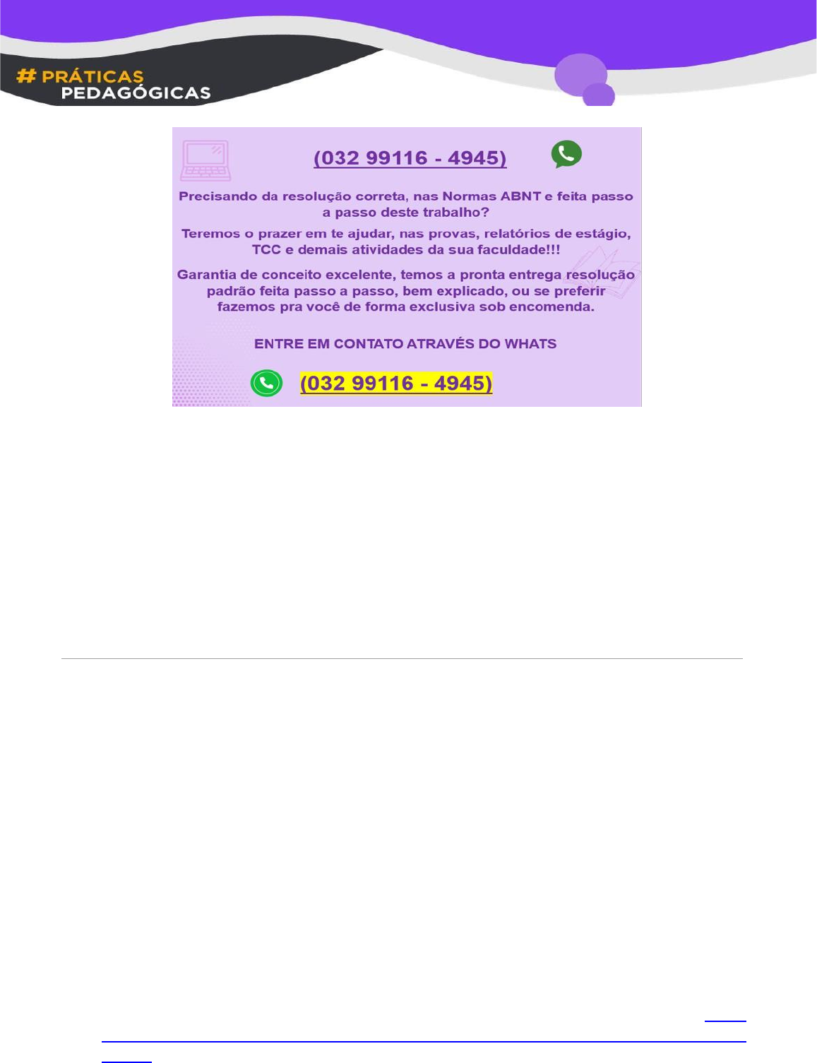 ATV Público PRÁTICAS PEDAGÓGICAS: GESTÃO DA APRENDIZAGEM Olá, estudante! Neste momento, você realizará uma atividade prática relacionada a uma situação típica da atuação do professor. Objetivos Desenvolver a capacidade de criar e aplicar instrumentos avaliativos diversificados, levando em consideração diferentes formas de aprendizagem dos alunos. Refletir sobre a importância de estratégias de feedback e recuperação como parte do processo de avaliação formativa. Aplicar o conceito de avaliação contínua e diversificada, utilizando rubricas e planos de recuperação. Sintetizar o planejamento de avaliação em um mapa mental, organizando de forma clara as diferentes etapas e estratégias do processo avaliativo.  Passo 1: Leitura e Contextualização Você deve começar a atividade lendo este texto sobre avaliação da aprendizagem: DUARTE, C. E. Avaliação da Aprendizagem escolar: Como os professores estão praticando a avaliação na escola. Revista Holos, ano 31, vol. 8, 2015, p. 53-67. Disponível em: (PDF) Avaliação da Aprendizagem Escolar: Como os Professores Estão Praticando a Avaliação na Escola. Após a leitura, você deverá responder às seguintes questões para compor a atividade final: 1. Qual o papel da avaliação no processo de ensino-aprendizagem? https://www.researchgate.net/publication/290523357_AVALIACAO_DA_APRENDIZAGEM_ESCOLAR_COMO_OS_PROFESSORES_ESTAO_PRATICANDO_A_AVALIACAO_NA_ESCOLA https://www.researchgate.net/publication/290523357_AVALIACAO_DA_APRENDIZAGEM_ESCOLAR_COMO_OS_PROFESSORES_ESTAO_PRATICANDO_A_AVALIACAO_NA_ESCOLA https://www.researchgate.net/publication/290523357_AVALIACAO_DA_APRENDIZAGEM_ESCOLAR_COMO_OS_PROFESSORES_ESTAO_PRATICANDO_A_AVALIACAO_NA_ESCOLA ATV Público 2. Como a avaliação pode ser usada para promover a aprendizagem de forma contínua e diversificada? 3. Quais os principais desafios enfrentados pelos professores ao escolherem os instrumentos de avaliação? Passo 2: Situação-Problema A professora Vanessa leciona na Educação Básica e tem enfrentado dificuldades com a avaliação de seus alunos. Ela percebe que, apesar de realizar atividades práticas e dinâmicas, os alunos ATV Público têm apresentado dificuldades para compreender conceitos-chave da matéria. Alguns alunos se destacam e outros parecem não estar conseguindo acompanhar o conteúdo da mesma forma. Para avaliar o conteúdo ministrado, a professora Vanessa precisa de um instrumento de avaliação que vá além da simples prova escrita, considerando as diferentes formas de aprendizagem dos alunos. Além disso, ela precisa criar uma forma de fornecer feedback construtivo para os alunos que apresentaram dificuldades, e também uma estratégia de recuperação para os que não alcançaram o desempenho esperado. Após a leitura dessa situação-problema, você deverá escolher um tema aderente à área de abrangência do seu curso. Selecione no quadro, a seguir, um tema relacionado ao seu curso de graduação, para elaborar a proposta: Componente Curricular Dificuldades de Aprendizagem Língua Portuguesa 1. Dificuldade na interpretação de textos. 2. Problemas com a ortografia e gramática. 3. Dificuldade em expressar ideias de forma escrita. Matemática 1. Dificuldade em entender conceitos abstratos. 2. Resolução de problemas matemáticos. 3. Dificuldade em memorizar fórmulas e procedimentos. Ciências 1. Dificuldade em compreender conceitos científicos. 2. Problemas em realizar experimentos e atividades práticas. 3. Dificuldade em relacionar teoria com prática. História 1. Dificuldade em memorizar datas e eventos históricos. 2. Problemas em entender a relação causa e efeito entre eventos históricos. 3. Dificuldade em interpretar fontes históricas. Geografia 1. Dificuldade em compreender mapas e gráficos. 2. Problemas em entender conceitos de localização e orientação espacial. 3. Dificuldade em relacionar fenômenos naturais e sociais. Educação Física 1. Dificuldade em coordenação motora. 2. Problemas em seguir regras e instruções de jogos. 3. Dificuldade em trabalhar em equipe. Arte 1. Dificuldade em expressar criatividade e originalidade. 2. Problemas em entender e aplicar técnicas artísticas. 3. Dificuldade em interpretar obras de arte. Filosofia 1. Dificuldade em trabalhar conceitos abstratos e teorias ATV Público Componente Curricular Dificuldades de Aprendizagem complexas. 2. Problemas em relacionar contextos históricos com a vida cotidiana. 3. Dificuldade em realizar a leitura e a interpretação de textos filosóficos. Língua Estrangeira 1. Dificuldade em pronúncia e entonação. 2. Problemas em memorizar vocabulário e estruturas gramaticais. 3. Dificuldade em compreender e produzir textos na língua estrangeira. Sociologia 1. Dificuldade em compreender conceitos sociológicos. 2. Problemas em relacionar teorias sociológicas com a realidade social. 3. Dificuldade em participar de debates e discussões críticas. Educação Especial 1. Dificuldade em adaptar-se a métodos de ensino inclusivos. 2. Problemas em atender às necessidades específicas de cada aluno. 3. Dificuldade em promover a socialização e inclusão de alunos com deficiências. Pedagogia 1. Dificuldade em planejar e organizar atividades pedagógicas. 2. Problemas em avaliar o desempenho dos alunos de forma justa e eficaz. 3. Dificuldade em aplicar teorias pedagógicas na prática. Biologia 1. Dificuldade em compreender processos biológicos complexos. 2. Problemas em memorizar terminologias científicas. 3. Dificuldade em relacionar conceitos biológicos com fenômenos do cotidiano. Escolhido o tema, você deverá responder às seguintes questões para compor a atividade final: 1. Que instrumento avaliativo você pode propor considerando tanto os conhecimentos teóricos quanto a aplicação prática do conteúdo? Justifique sua escolha. 2. Que estratégias de feedback você pode propor para os alunos que obtiverem resultados abaixo do esperad