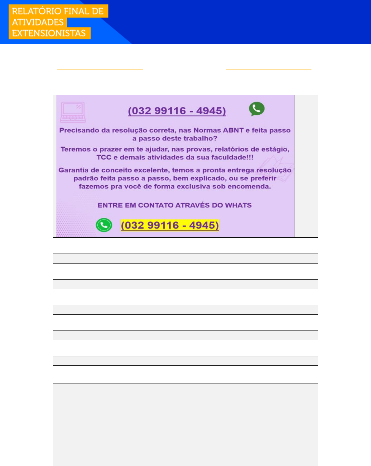 1 DADOS DO ALUNO: Aluno: [Nome completo] RA: [Número do RA do aluno] POLO / UNIDADE: CURSO: ENGENHARIA CIVIL - BACHARELADO COMPONENTE CURRICULAR: PROJETO DE EXTENSÃO II - ENGENHARIA CIVIL PROGRAMA DE EXTENSÃO: PROGRAMA DE SUSTENTABILIDADE. FINALIDADE E MOTIVAÇÃO: A finalidade da extensão no Programa de Sustentabilidade é relacionar as competências técnicas da engenharia civil com a consciência ambiental e gestão dos recursos naturais, suprindo as necessidades da sociedade de uma maneira responsável e sustentável, pensando nas gerações futuras. O programa pode desenvolver temas na esfera econômica, social e ambiental. Os locais que poderão contemplar esse projeto extensionista podem ser: parcerias com a prefeitura; associações de bairros, escolas, praças da cidade, parcerias com empresas públicas e privadas, casas de repouso, creches, edificações públicas bem como sistemas de infraestrutura da cidade (sistemas de drenagem e saneamento) 2 COMPETÊNCIAS: I - Aplicar conhecimentos científicos, tecnológicos e instrumentais às práticas de Engenharia Civil; II - Identificar, formular e resolver problemas de Engenharia Civil; III - Avaliar a viabilidade técnica, econômica e ambiental de projetos de Engenharia Civil. PERFIL DO EGRESSO: O perfil do egresso idealizado pela IES para o curso de Engenharia Civil possibilita a formação do engenheiro civil crítico, reflexivo, criativo, visão holística, humanista e ético, capaz de aplicar tecnologias inerentes à sua área de atuação, sendo que pelas atividades extensionistas vinculadas ao Programa de Sustentabilidade, esse egresso poderá desenvolver habilidades e capacidade para conduzir atividades referentes à compreensão da realidade social e ambiental da sua região, que atue observando a sustentabilidade e a preservação do meio ambiente, desenvolvendo a capacidade de planejamento e condução de experimentos, de interpretação e análise dos resultados, compreendendo fenômenos físicos e químicos, se apropriando de ferramentas matemáticas, computacionais e de simulação de suas atividades, analisando, interpretar e agir em situações pertinentes à engenharia civil nos temas de ciência do ambiente, saneamento e construção civil. SOFT SKILLS (COMPETÊNCIAS SOCIOEMOCIONAIS): Análise e resolução de problemas Comunicação Interpessoal Planejamento e organização OBJETIVOS DE APRENDIZAGEM: Os objetivos da extensão em Engenharia Civil vinculados ao Programa de Sustentabilidade estão relacionados com a disseminação do saber técnico da área da engenharia civil para a comunidade local, prestando serviços relacionados a questões ambientais, de sustentabilidade, recursos naturais, ciências do ambiente, preservação ambiental e do patrimônio, economia solidária e otimização de recursos. Tais ações visam a transferência de conhecimento acadêmico para a comunidade, preparando o egresso para uma atuação global, focado não apenas no conteúdo puramente técnico, mas na relação da engenharia civil com a consciência social e ambiental, de forma a pensar nas gerações futuras, atendendo demandas da comunidade e relacionando os conhecimentos técnicos do curso com a consciência ambiental CONTEÚDOS: I - Ciências do ambiente; II - Construção civil; III - Recursos hídricos e Saneamento. INDICAÇÕES BIBLIOGRÁFICAS: CUNHA, Alessandra Martins ...[et al]. Construção civil. Porto Alegre : SAGAH, 2017. 3 PHILIPPI JUNIOR, Arlindo. Saneamento, saúde e ambiente: fundamentos para um desenvolvimento sustentável. 2. ed. Barueri: Manole, 2018. SOLURI, Daniela. SMS: fundamentos em segurança, meio ambiente e saúde. Rio de Janeiro: LTC, 2019. RELATÓRIO FINAL: Aluno e Aluna, após realizar suas atividades de extensão, é necessário que você o formalize, enviando esse Relatório Final para ser avaliado junto ao seu Ambiente Virtual (AVA) e também para você poder comprovar sua atuação. Para o preenchimento, busque as anotações junto ao TEMPLATE PCDA para auxiliar na apresentação das atividades desenvolvidas. Todos os campos são de preenchimento obrigatório! DESCRIÇÃO DA AÇÃO COM RESULTADOS ALCANÇADOS Metas dos Objetivos de Desenvolvimento Sustentável (ODS) aderentes a este projeto: CAMPO OBRIGATÓRIO – busque no seu Template PDCA quais Metas você selecionou como aderentes ao seu projeto, conforme cada Objetivo de Desenvolvimento Sustentável (ODS) da Organização das Nações Unidas (ONU) que você explorou no seu planejamento. Liste as Metas selecionadas (pelo menos uma opção): Local de realização da atividade extensionista: Durante a ação: Caso necessário, houve mudança de estratégia para alcançar o resultado: Resultado da ação: Conclusão: Depoimentos (se houver): RELATE SUA PERCEPÇÃO DAS AÇÕES EXTENSIONISTAS REALIZADAS NO PROGRAMA DESENVOLVIDO: CAMPO OBRIGATÓRIO – relate em no mínimo 15 (quinze) linhas sua experiência com as ações extensionistas. O texto deve ser de sua autoria e inédito, evite plágio. 4 Questões norteadoras: (1) Você notou que suas habilidades profissionais foram aprimoradas, com a atuação nas ações extensionistas? (2) Você identificou melhoria/resolução do problema identificado? (3) Você conseguiu articular os conhecimentos adquiridos no curso com as ações extensionistas? Ao escrever seu texto evite deixá-lo em forma de respostas as questões norteadoras, relate sua experiência em forma de texto dissertativo com justificativas. DEPOIMENTO DA INSTITUIÇÃO PARTICIPANTE CAMPO OBRIGATÓRIO - insira depoimento(s) do(s) gestor(es) da instituição/órgão/associação participante que contribuam como um feedback da ação realizada por você. REFERÊNCIAS BIBLIOGRÁFICAS CAMPO OBRIGATÓRIO – Siga a normas ABNT, para isso consulte sua Biblioteca Virtual; Utilize como referências bibliográficas as indicações do Campo: Indicações Bibliográficas e as demais referências utilizadas no desenvolvimento do seu proje