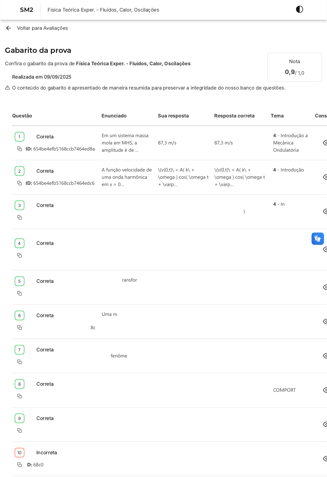 27/09/25, 02:11 estacio.saladeavaliacoes.com.br/prova/68c0e1e67f9a9f29f1166605/gabarito/reduzido/ https://estacio.saladeavaliacoes.com.br/prova/68c0e1e67f9a9f29f1166605/gabarito/reduzido/ 1/2 Voltar para Avaliações Gabarito da prova Confira o gabarito da prova de Física Teórica Exper. - Fluidos, Calor, Oscilações Realizada em 09/09/2025 Nota 0,9/ 1,0 O conteúdo do gabarito é apresentado de maneira resumida para preservar a integridade do nosso banco de questões. Questão Enunciado Sua resposta Resposta correta Tema Cons Correta ID: 654be4efb5168ccb7464ed8a Em um sistema massa mola em MHS, a amplitude é de ... 87,3 m/s 87,3 m/s 4 - Introdução a Mecânica Ondulatória Correta ID: 654be4efb5168ccb7464edc6 A função velocidade de uma onda harmônica em x = 0... \(v(0,t)\ = A( k\ + \omega ) cos( \omega t + \varp... \(v(0,t)\ = A( k\ + \omega ) cos( \omega t + \varp... 4 - Introdução a Mecânica Ondulatória Correta ID: 654be5b3b5168ccb74666097 Assinale a opção que representa a frequência angul... \(8 \pi\ rad/s\) \(8 \pi\ rad/s\) 4 - Introdução a Mecânica Ondulatória Correta ID: 654be4efb5168ccb7464edd8 Uma onda eletromagnética se propaga no vácuo com a... \(\frac{\pi}{4} m\) \(\frac{\pi}{4} m\) 4 - Introdução a Mecânica Ondulatória Correta ID: 654be4efb5168ccb7464e514 Em uma transformação adiabática, temos que um gás ... \(-6,0\ \times\ 10^6\) J \(-6,0\ \times\ 10^6\) J 5 - Introdução a Termodinâmica - Calor Correta ID: 654be595b5168ccb74662e8c Uma máquina térmica, recebe 25.000 J de energia da... 19.750 J 19.750 J 5 - Introdução a Termodinâmica - Calor Correta ID: 654be514b5168ccb74653b29 A reflexão da luz é um dos fenômenos físicos mais ... 85° 85° 6 - ÓPTICA E COMPORTAMENTO DA LUZ Correta ID: 65b1280ceccdbbbddeb02ed6 Um dos avanços tecnológicos utilizados são os holo... 75 W/m². 75 W/m². 6 - ÓPTICA E COMPORTAMENTO DA LUZ Correta ID: 68c02c907facbbd81c6e56d3 Um bloco metálico de capacidade térm... 525 cal. 525 cal. 5 - Introdução a Termodinâmica - Calor Incorreta ID: 68c0292dfd1c2f7dc62dd012 Em um Centro de Ciências Interativo as ativi... - 5 cm. 2,5 cm. 6 - ÓPTICA E COMPORTAMENTO DA LUZ 1 2 3 4 5 6 7 8 9 10 SM2 Física Teórica Exper. - Fluidos, Calor, Oscilações https://estacio.saladeavaliacoes.com.br/avaliacoes/ 27/09/25, 02:11 estacio.saladeavaliacoes.com.br/prova/68c0e1e67f9a9f29f1166605/gabarito/reduzido/ https://estacio.saladeavaliacoes.com.br/prova/68c0e1e67f9a9f29f1166605/gabarito/reduzido/ 2/2 Encontrou algum problema? Você pode copiar o ID da questão e abrir um requerimento. Na tela inicial do Campus Virtual �SIA�, acesse "Atendimento > Requerimento > Novo > Currículo/Aula/horário > Analisar ambiente de avaliação/exercícios"