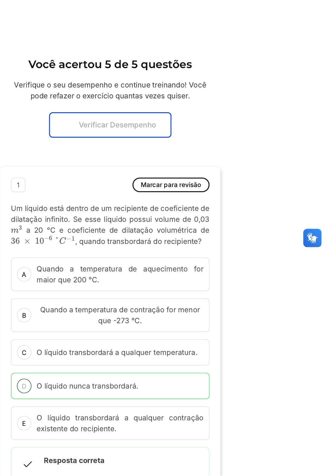 30/08/25, 23:38 estacio.saladeavaliacoes.com.br/exercicio/68ab4f884336d83bcade6c92/gabarito/ https://estacio.saladeavaliacoes.com.br/exercicio/68ab4f884336d83bcade6c92/gabarito/ 1/7 Você acertou 5 de 5 questões Verifique o seu desempenho e continue treinando! Você pode refazer o exercício quantas vezes quiser. Verificar Desempenho A B C D E 1 Marcar para revisão Um líquido está dentro de um recipiente de coeficiente de dilatação infinito. Se esse líquido possui volume de 0,03 a 20 °C e coeficiente de dilatação volumétrica de , quando transbordará do recipiente? m3 36 × 10−6 °C −1 Quando a temperatura de aquecimento for maior que 200 °C. Quando a temperatura de contração for menor que �273 °C. O líquido transbordará a qualquer temperatura. O líquido nunca transbordará. O líquido transbordará a qualquer contração existente do recipiente. Resposta correta 30/08/25, 23:38 estacio.saladeavaliacoes.com.br/exercicio/68ab4f884336d83bcade6c92/gabarito/ https://estacio.saladeavaliacoes.com.br/exercicio/68ab4f884336d83bcade6c92/gabarito/ 2/7 A B C D E Parabéns, você selecionou a alternativa correta. Confira o gabarito comentado! Gabarito Comentado O recipiente possui um coeficiente de dilatação infinito, o que significa que ele se expandirá mais do que qualquer quantidade de líquido que ele contenha, independentemente da temperatura. Portanto, o líquido nunca transbordará, pois o recipiente sempre se dilatará mais do que o líquido, independentemente de quão quente o líquido se torne. Isso ocorre porque o coeficiente de dilatação é uma medida de quanto um material se expande ou contrai por unidade de temperatura; um coeficiente de dilatação infinito significa que o recipiente se expandirá infinitamente para cada aumento de temperatura. 2 Marcar para revisão A temperatura em Celsius correspondente a 0 K é igual a: �698 °C �727 °C �375 °C �781 °C �273 °C 30/08/25, 23:38 estacio.saladeavaliacoes.com.br/exercicio/68ab4f884336d83bcade6c92/gabarito/ https://estacio.saladeavaliacoes.com.br/exercicio/68ab4f884336d83bcade6c92/gabarito/ 3/7 A B C Resposta correta Parabéns, você selecionou a alternativa correta. Confira o gabarito comentado! Gabarito Comentado Para converter a temperatura de Kelvin para Celsius, utilizamos a seguinte equação: Substituindo o valor de 0 K na equação, temos: O que resulta em: Portanto, a temperatura em Celsius correspondente a 0 K é �273 °C. TC = TK − 273 TC = 0 − 273 TC = −273 °C 3 Marcar para revisão Um termômetro foi construído com escala não convencional, e a este foi atribuído o valor de �10 para a água em fusão e 10 para a água em ebulição. Assinale a alternativa que apresenta o valor que esse termômetro apontará para uma temperatura ambiente de 25 °C� �3,0 �4,5 �5,0 30/08/25, 23:38 estacio.saladeavaliacoes.com.br/exercicio/68ab4f884336d83bcade6c92/gabarito/ https://estacio.saladeavaliacoes.com.br/exercicio/68ab4f884336d83bcade6c92/gabarito/ 4/7 D E �6,0 �7,5 Resposta correta Parabéns, você selecionou a alternativa correta. Confira o gabarito comentado! Gabarito Comentado Para resolver essa questão, precisamos estabelecer a equação de conversão entre a escala convencional �Celsius) e a escala não convencional do termômetro. A equação é dada por: Que simplificada, resulta em: Isolando T, temos: Substituindo pelo valor da temperatura ambiente em Celsius �25°C�, obtemos: Portanto, para uma temperatura ambiente de 25°C, o termômetro com escala não convencional apontará o valor de �5,00. = T −(−10) 10 − (−10) TC −0 100 −0 = T +10 20 TC 100 T = − 10 20TC 100 TC T = − 10 = −5, 0 20 ⋅25 100 4 Marcar para revisão Em um termômetro, foi registrada uma variação de temperatura de 60 K. Em Kelvin, essa variação de temperatura corresponde a: 30/08/25, 23:38 estacio.saladeavaliacoes.com.br/exercicio/68ab4f884336d83bcade6c92/gabarito/ https://estacio.saladeavaliacoes.com.br/exercicio/68ab4f884336d83bcade6c92/gabarito/ 5/7 A B C D E 10 K 20 K 30 K 40 K 60 K Resposta correta Parabéns, você selecionou a alternativa correta. Confira o gabarito comentado! Gabarito Comentado Questão 5 de 5 Corretas �5� Em branco �0� 1 2 3 4 5 Lista de exercícios Termologia… Sair 30/08/25, 23:38 estacio.saladeavaliacoes.com.br/exercicio/68ab4f884336d83bcade6c92/gabarito/ https://estacio.saladeavaliacoes.com.br/exercicio/68ab4f884336d83bcade6c92/gabarito/ 6/7 A B C Para resolver esta questão, é importante entender que a escala Kelvin é uma escala absoluta, ou seja, não possui valores negativos. Portanto, uma variação de temperatura em Kelvin é a mesma, independentemente da escala que você está usando. Isso significa que uma variação de 60 K é igual a uma variação de 60 K, não importa se você está medindo em Celsius, Fahrenheit ou qualquer outra escala. A confusão pode surgir porque a relação entre as escalas Celsius e Kelvin não é 1�1. A fórmula para converter Celsius para Kelvin é . No entanto, isso não se aplica a variações de temperatura, apenas a temperaturas absolutas. Para variações de temperatura, 1 K de variação é igual a 1°C de variação. Portanto, uma variação de 60 K é igual a uma variação de 60 K, tornando a alternativa E a resposta correta. TK = TC + 273 5 Marcar para revisão Um disco metálico de raio 0,5 m tem um coeficiente de dilatação linear igual a . A área final desse disco para uma redução de temperatura de 18 °C é igual a: 3, 2 × 10−6 °C −1 0, 25π m2 0, 39π m2 0, 45π m2 30/08/25, 23:38 estacio.saladeavaliacoes.com.br/exercicio/68ab4f884336d83bcade6c92/gabarito/ https://estacio.saladeavaliacoes.com.br/exercicio/68ab4f884336d83bcade6c92/gabarito/ 7/7 D E 0, 51π m2 0, 62π m2 Resposta correta Parabéns, você selecionou a alternativa correta. Confira o gabarito comentado! Gabarito Comentado A questão envolve o conceito de dilatação térmica. A equação para a 