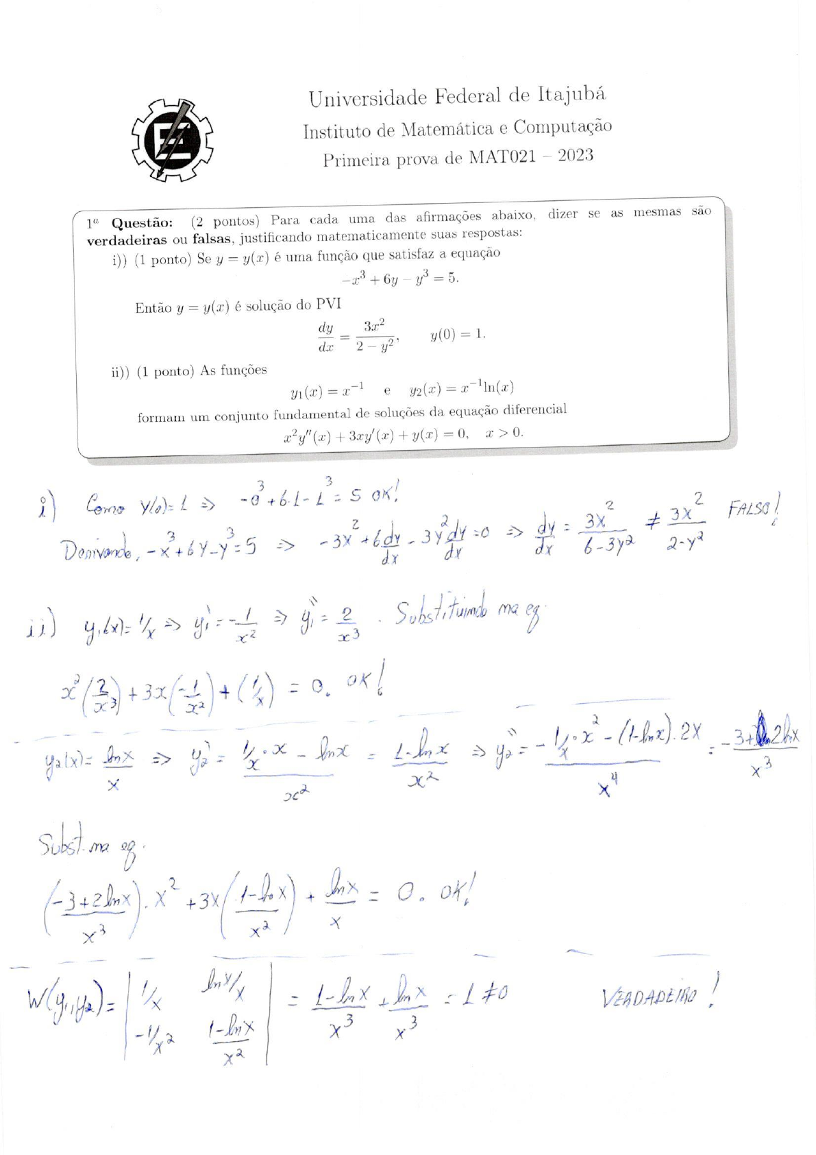Universidade Federal de Itajubá Instituto de Matemática e Computação Primeira prova de MAT021 2023 Questão: (2 pontos) Para cada uma das afirmações abaixo, dizer se as mesmas são verdadeiras ou falsas, justificando matematicamente suas respostas: i)) (1 ponto) Se y = y(x) é uma função que satisfaz a equação Então y = y(x) é solução do PVI ii)) (1 ponto) As funções formam um conjunto fundamental de soluções da equação diferencial i) Como OK! 2 2 dy # 3X FALSO! ii) + = = : X 4 + Inx = O. = + = ! -1/x22 Questão: (3 pontos) Considere um tanque com capacidade de 100 litros. O tanque contém originalmente 50 litros de água com uma solução de 50 gramas de sal. Está entrando no tanque, a uma taxa de 1 litros por minuto, água contendo 6 gramas de sal por litro, e permite-se que a solução bem misturada saia do tanque a uma taxa de 2 litros por minuto. Pergunta-se: i) (0.5 pontos) Descreva Problema de Valor Inicial que descreve este fluxo. ii) (1 ponto) Determine a quantidade de sal no tanque em qualquer instante de tempo (em minutos). iii) (0.5 pontos) Após 10 minutos tanque estará vazio? Justifique matematicamente sua resposta. iv) (1 pontos) No instante t = 20 minutos a quantidade de sal presente no tanque é máxima? Justifique matematicamente sua resposta. 100l i) do 50l+50g dt 50-t -2 ii) + Q 6 E.D.O 0 integrante = 50-t + = 300 + 1/10 Z iii) A cada 10 assim am 10 tongue 40 FALSO! t=20 5 10 Em um a de am3 Questão: (2,5 pontos) Considere a seguinte equação diferencial ordinária (EDO). (1) i) (1 ponto) A equação (1) é exata? Se sim, a resolva, caso contrário justifique sua resposta e vá para item ii). ii) (1,5 pontos) Se a equação (1) não é exata, fator integrante (x,y) = y torna a equação (1) exata? Se sim, a resolva, caso contrário, justifique matematicamente sua resposta. i) dx " + -y dy # M=+y l N= ii) + l My=+ + 2y = Nx is 2 = h(y)= =4 Questão: (2,5 pontos) Encontre a solução geral da equação diferencial + = 3 a da Solução do Fundamental) y,(t)= = & -t uma particular de usand Super - Subst. - -4A-4B+5A=3 = l = Solução + + 17 3 17 12