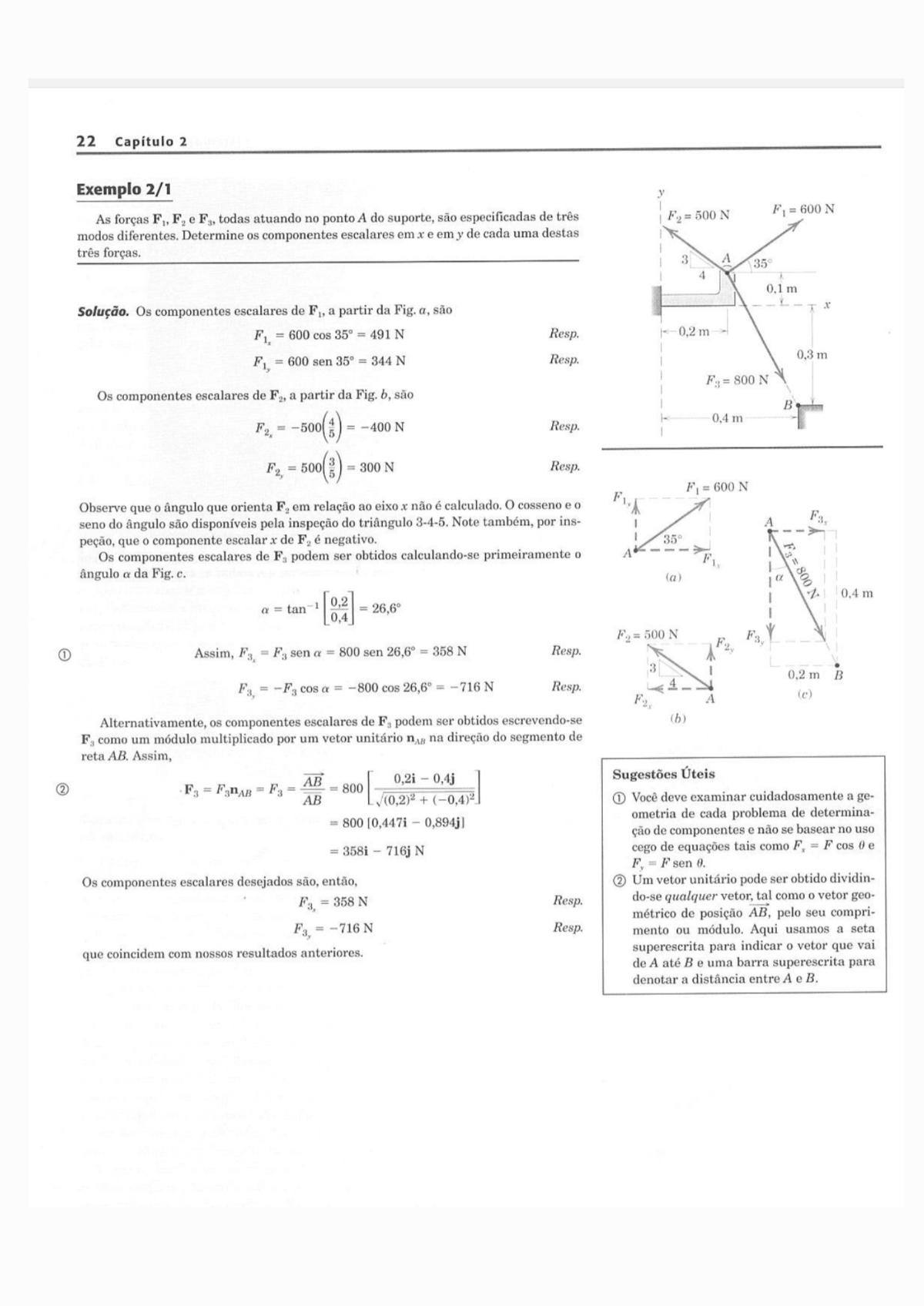 22 Capítulo 2 Exemplo 2/1 y 600 N As forças F2 e todas atuando no ponto A do suporte, são especificadas de três modos diferentes. Determine os componentes escalares em x e em y de cada uma destas três forças. 3 A 35° 4 m Solução. Os componentes escalares de a partir da Fig. a, são x 600 cos 35° 491 N Resp. 0,2 m 600 sen 35° 344 N Resp. 0,3 m Os componentes escalares de F2, a partir da Fig. b, são 0,4 m N Resp. = N Resp. F Observe que o ângulo que orienta F2 em relação ao eixo x não é calculado. cosseno e o seno do ângulo são disponíveis pela inspeção do triângulo 3-4-5. Note também, por ins- A peção, que componente escalar x de F2 é negativo. 35° Os componentes escalares de podem ser obtidos calculando-se primeiramente o A ângulo a da Fig. (a) 800 0.4 m 1 Assim, F₃ sen 800 sen 26,6° 358 N Resp. 3 0,2 m Resp. A (c) Alternativamente, os componentes escalares de F₃ podem ser obtidos escrevendo-se (b) F₃ como um módulo multiplicado por um vetor unitário na direção do segmento de reta AB. Assim, 0,2i 0,4j Sugestões Úteis 2 1 Você deve examinar cuidadosamente a ge- ometria de cada problema de determina- 800 [0,447i 0,894j] ção de componentes e não se basear no uso 358i - 716j N cego de equações tais como F, F cos 0 e F, F sen Os componentes escalares desejados são, então, 2 Um vetor unitário pode ser obtido dividin- Resp. do-se qualquer vetor, tal como vetor geo- métrico de posição AB, pelo seu compri- Resp. mento ou módulo. Aqui usamos a seta que coincidem com nossos resultados anteriores. superescrita para indicar vetor que vai de A até e uma barra superescrita para denotar a distância entre A eExemplo 2/2 B Combine em uma única força equivalente R as duas forças P e T, que atuam no pon- to B da estrutura fixa. 600 y x Solução gráfica. paralelogramo para a adição vetorial das forças T e Pé construí- 1 do como mostrado na Fig. a. A escala usada foi de 1 cm 400 N. Uma escala de 1 cm = A 60° D 100 N seria mais apropriada para um papel de tamanho regular e daria maior precisão. Observe que ângulo deve ser determinado antes da construção do paralelogramo. A 3m partir da figura dada BD 6 sen 60° tan 0,866 40,9° AD 800 N As medidas do comprimento R e da direção da força resultante R levam aos resulta- P dos aproximados de 600 Resp. T R (a) Solução geométrica. triângulo para a adição vetorial de T e Pé mostrado na Fig. b. 2 ângulo a é calculado como demonstrado anteriormente. A lei dos cossenos dá R² + 2(600)(800) cos 40,9° 274.300 Sugestões Úteis 1 Note o reposicionamento de P para permi- Resp. tir a adição pelo paralelogramo em Da lei dos senos podemos determinar o ângulo que orienta R. Assim, 600 524 = sen = 0,750 48,6° Resp. sen sen 40,9° 800 N P Solução algébrica. Usando sistema de coordenadas x-y na figura dada, podemos es- crever R 600 N α 800 600 cos 40,9° N T (b) módulo e a direção da força resultante R são, então, como mostrados na Fig. R + 524 N Resp. 2 Note o reposicionamento de T de modo a preservar a linha de ação correta da re- Resp. sultante R. A resultante R pode ser também escrita em notação vetorial como R 346i 393j N Resp. y 346 N x 393 N Y R (c) 38/38424 Capítulo 2 Exemplo 2/3 y Uma força F de 500 N é aplicada à haste vertical, como mostrado. (1) Escreva F em função dos vetores unitários i e j e identifique seus componentes vetoriais e escalares. (2) Determine os componentes escalares do vetor força F ao longo dos eixos x' e y'. (3) Determine os componentes escalares de F ao longo dos eixos x e y'. A 30° x Solução: Item (1). Da Fig. a podemos escrever F como F = (F cos (F sen i' (500 cos 60°)i (500 sen 60°)j = (250i - 433j) N Resp. y Os componentes escalares são 250 e N. Os componentes vetoriais são Fx 250i N e -433j N. Fx Item (2). Da Fig. b podemos escrever F como F 500i'N, de modo que os compo- A A j' 60° nentes escalares desejados são F F 500 N Resp. i' Item (3). Os componentes de F nas direções x e y' não são retangulares e são obti- dos completando-se paralelogramo, como mostrado na Fig. c. Os módulos dos compo- (a) (b) nentes podem ser calculados pela lei dos senos. Assim, 500 1 1000 N x sen 90° sen 30° 60° 30 90 Fy 90° 500 sen 60° sen 30° 866 N 30° 60° Os componentes escalares pedidos são então Fx 1000 N Fy N Resp. Sugestão Útil 1 Obtenha e Fy graficamente e compare seus resultados com os valores calculados. Exemplo 2/4 a As forças e atuam no suporte, como mostrado. Determine a projeção da re- 100 N sultante R sobre eixo b. C 30° 20° Solução. A adição de e F2 pelo paralelogramo é mostrada na figura. Usando a lei dos 80 N b cossenos obtemos R² + 2(80)(100) cos 130° a A figura mostra também a projeção ortogonal de R sobre 0 eixo b. Seu comprimen- to é 100 N R Fb = 80 100 cos 50° = 144,3 N Resp. 50° 80 Observe que os componentes de um vetor não são, geralmente, iguais às projeções do 50° vetor nos mesmos eixos. Se eixo a fosse perpendicular ao eixo b, então as projeções e componentes de R seriam iguais.Sistemas de Forças 31 Exemplo 2/5 2m Calcule, de cinco maneiras diferentes, módulo do momento da força de 600 N em A relação ao ponto da base. 40° 4m 600 N Solução. (I) braço de alavanca da força de 600 N é d 4 cos 40° + 2 sen 40° 4,35 m 1 Usando M = Fd, o momento é no sentido horário e tem módulo M₀ 600(4,35) = 2610 Resp. 2m (II) Substitua a força por seus componentes retangulares em A 40° F₁ 600 cos 40° 460 N, = 600 sen 40° 386 N 4m 600 N Pelo teorema de o momento se torna d 2 M₀ 460(4) + 386(2) 2610 N m Resp. (III) Pelo princípio da transmissibilidade, mova a força de 600 N ao longo de sua li- nha de ação até ponto B, que elimina momento do componente F2. braço de ala- F₁ 600 cos 40° vanca de fica sendo 4m 600 sen 40° e o momento é M₀ 460(5,68) 2610 Resp. 3 (IV) Movendo a força até ponto C, elimina-se momento do componente F₁. bra- ço de alavanca de fica se