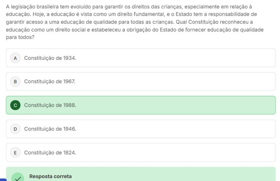 A legislação brasileira tem evoluído para garantir os direitos das crianças, especialmente em relação à educação. Hoje, a educação é vista como um direito fundamental, e Estado tem a responsabilidade de garantir acesso a uma educação de qualidade para todas as crianças. Qual Constituição reconheceu a educação como um direito social e estabeleceu a obrigação do Estado de fornecer educação de qualidade para todos? A Constituição de 1934. Constituição de 1967. Constituição de 1988. D Constituição de 1946. E Constituição de 1824. Resposta correta