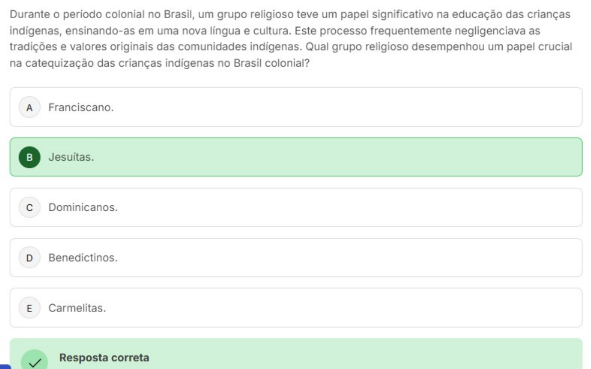 Durante o período colonial no Brasil, um grupo religioso teve um papel significativo na educação das crianças indígenas, ensinando-as em uma nova língua e cultura. Este processo frequentemente negligenciava as tradições e valores originais das comunidades indígenas. Qual grupo religioso desempenhou um papel crucial na catequização das crianças indígenas no Brasil colonial? A Franciscano. Jesuítas. C Dominicanos. D Benedictinos. E Carmelitas. Resposta correta