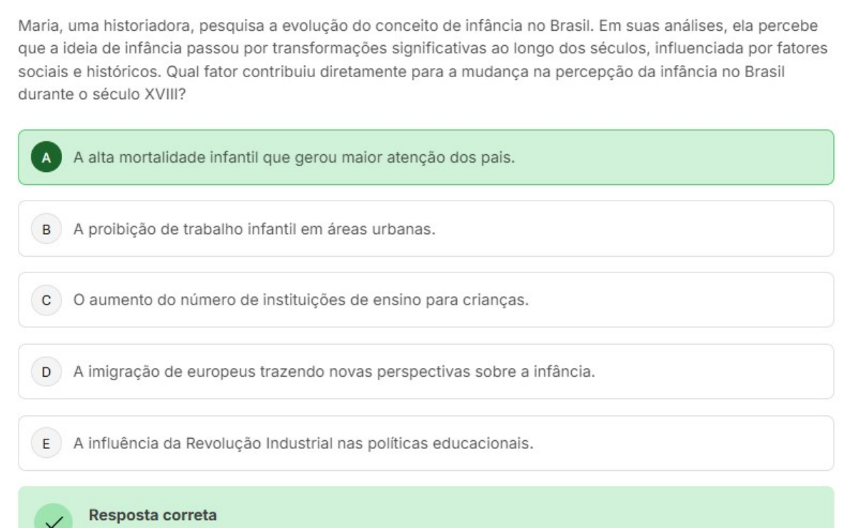 Maria, uma historiadora, pesquisa a evolução do conceito de infância no Brasil. Em suas análises, ela percebe que a ideia de infância passou por transformações significativas ao longo dos séculos, influenciada por fatores sociais e históricos. Qual fator contribuiu diretamente para a mudança na percepção da infância no Brasil durante o século XVIII? A A alta mortalidade infantil que gerou maior atenção dos pais. B A proibição de trabalho infantil em áreas urbanas. C aumento do número de instituições de ensino para crianças. D A imigração de europeus trazendo novas perspectivas sobre a infância. E A influência da Revolução Industrial nas políticas educacionais. Resposta correta